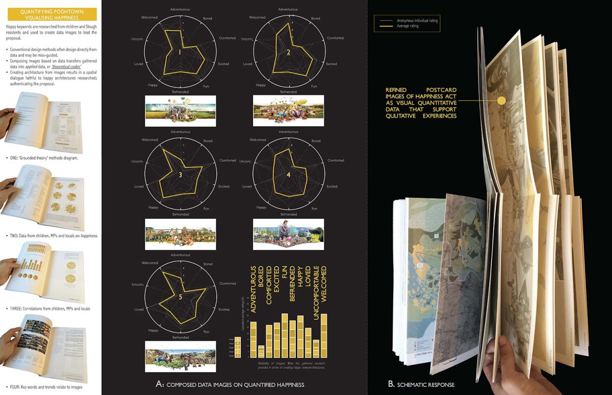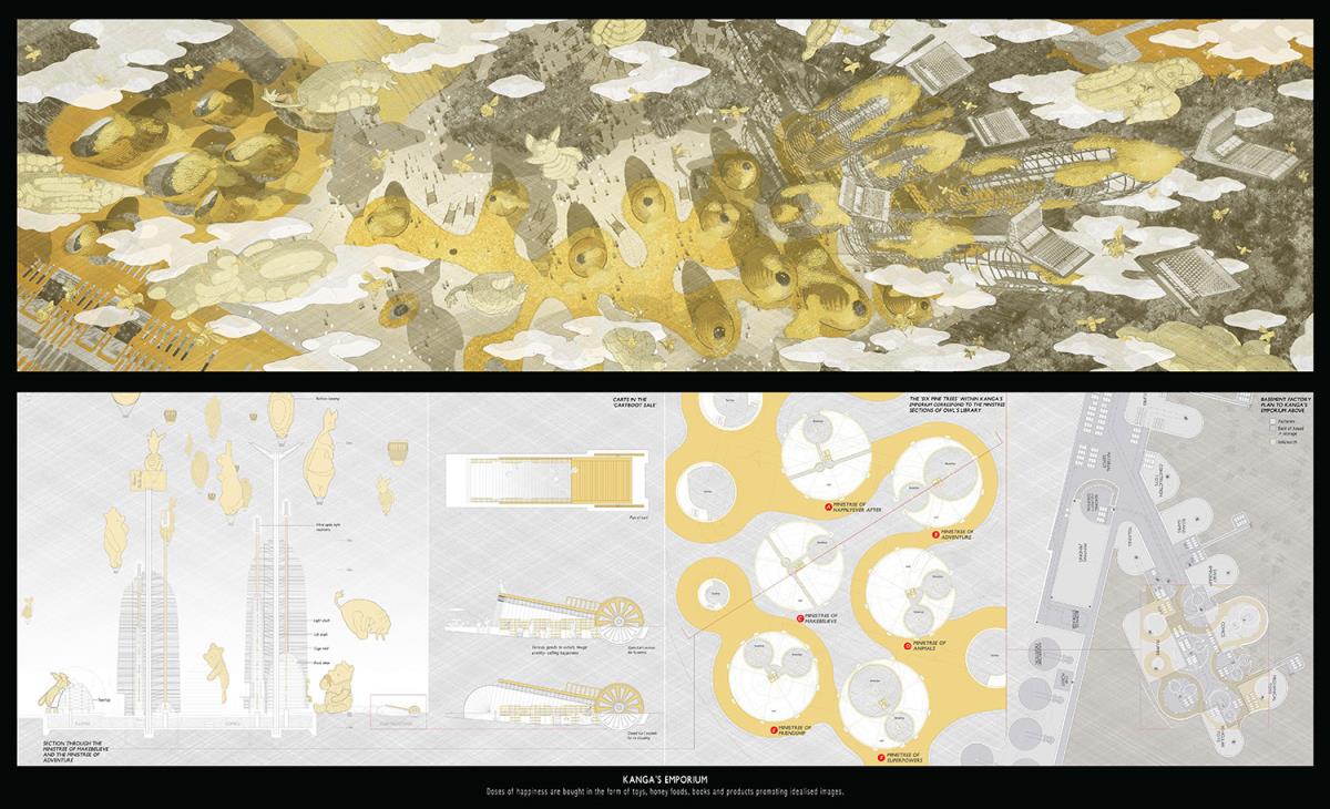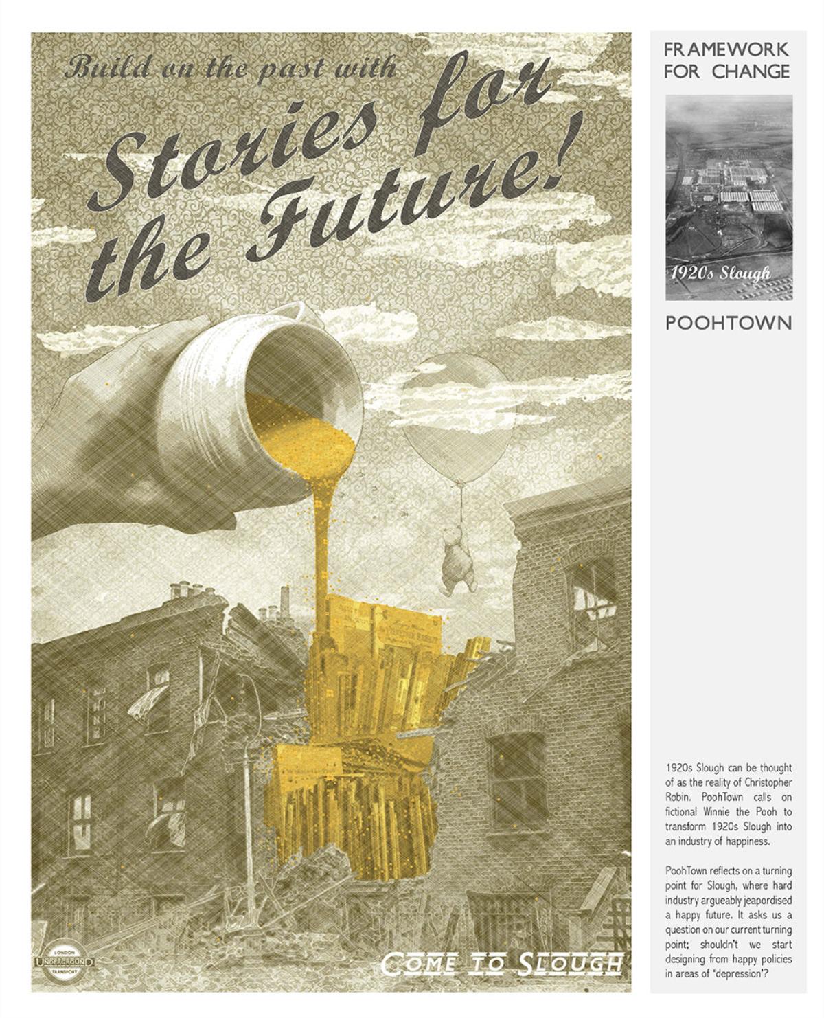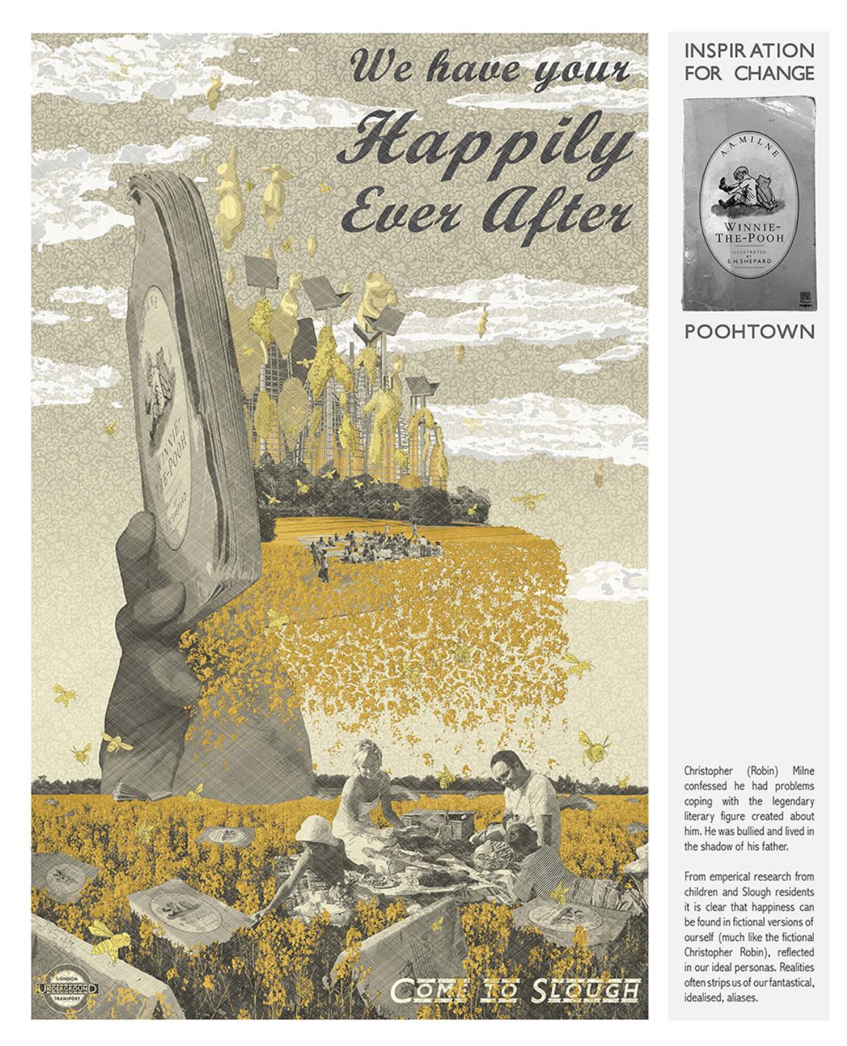 PoohTown Part 2 Project 2014 Nick Elias The Bartlett School of Architecture, UCL | UK In A.A.Milne’s ‘Winnie the Pooh’ a happy world is constructed fictitiously from an unhappy, real, Christopher Robin. During its publishing date in the 1920s, industry took off in Slough after the war and the town quickly became a place of unhappiness and social exclusion. For the project, 1920s Slough is revisited to capitalise from the economy of ‘happiness’ as an alternative industry using Winnie the Pooh as a metaphorical protagonist for happiness.Slough and many cities like it ache to be peaceful, happy and socially inclusive. Slough has long since been perceived as being home to much deprivation since the industrial sprawl in the 1920s. PoohTown, aims to re-evaluate covert responses to socio-political exclusion by proposing ‘happy’ architectures where residents can live, work and play together in a sustainable economic network. PoohTown also philosophises over today’s cities potential to prescribe policies of happiness alongside familiar amenities; a concept worryingly absent in today's city planning. Through empirical research it was clear that most people are happiest when playing an idealised, fictional, representation of themselves – from putting make-up on to proving their organic credentials at the farmers' market. Guests to PoohTown indulge in this tendency and become the fictional, happy, Christopher Robin by visiting Pooh and friends (each representatives of a specific ‘happiness’) on a proposed pilgrimage.This speculative proposal is a device, a thought experiment, enabling the potential of a happily-ever-after to be explored beyond the limitations of Slough’s industrial sprawl ambitions in the 1920s.PoohTown has taught me to explore methods of applying knowledge rather than relying on transient technical knowledge to facilitate design. I believe such a project exposed transferable methods and reasoning, allowing me to tackle design from a more personal, anthropological & emotional scale. PoohTown questions the raw matter of what humans want: In designing for emotion, happiness, it has been possible to test the purpose of architecture in a changing world. PoohTown therefore proposes it is more sustainable to design infrastructure for an emotional state; for if we are content through it, we may ask less from the Earth to satisfy our physical state. Tutor(s) Mr Bernd FelsingerMr C J Lim