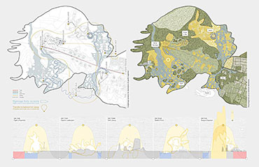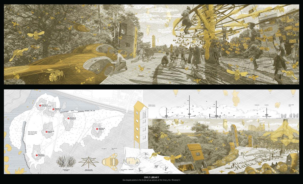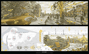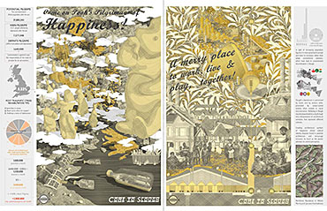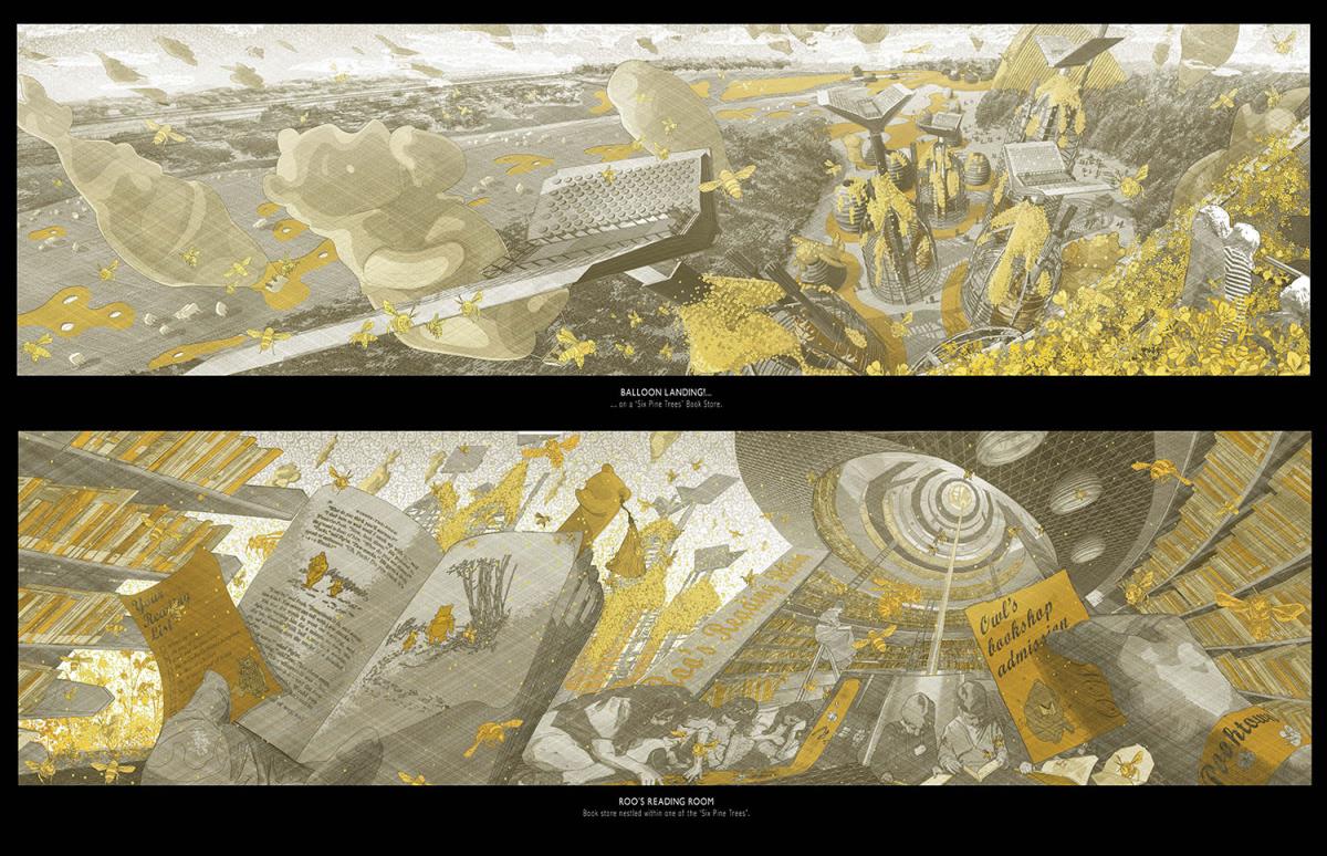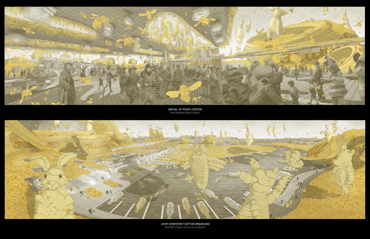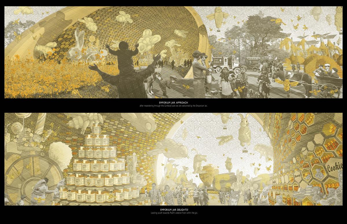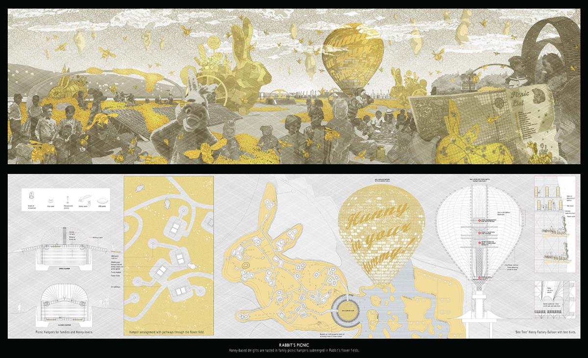PoohTown Part 2 Project 2014 Nick Elias The Bartlett School of Architecture, UCL | UK In A.A.Milne’s ‘Winnie the Pooh’ a happy world is constructed fictitiously from an unhappy, real, Christopher Robin. During its publishing date in the 1920s, industry took off in Slough after the war and the town quickly became a place of unhappiness and social exclusion. For the project, 1920s Slough is revisited to capitalise from the economy of ‘happiness’ as an alternative industry using Winnie the Pooh as a metaphorical protagonist for happiness.Slough and many cities like it ache to be peaceful, happy and socially inclusive. Slough has long since been perceived as being home to much deprivation since the industrial sprawl in the 1920s. PoohTown, aims to re-evaluate covert responses to socio-political exclusion by proposing ‘happy’ architectures where residents can live, work and play together in a sustainable economic network. PoohTown also philosophises over today’s cities potential to prescribe policies of happiness alongside familiar amenities; a concept worryingly absent in today's city planning. Through empirical research it was clear that most people are happiest when playing an idealised, fictional, representation of themselves – from putting make-up on to proving their organic credentials at the farmers' market. Guests to PoohTown indulge in this tendency and become the fictional, happy, Christopher Robin by visiting Pooh and friends (each representatives of a specific ‘happiness’) on a proposed pilgrimage.This speculative proposal is a device, a thought experiment, enabling the potential of a happily-ever-after to be explored beyond the limitations of Slough’s industrial sprawl ambitions in the 1920s.PoohTown has taught me to explore methods of applying knowledge rather than relying on transient technical knowledge to facilitate design. I believe such a project exposed transferable methods and reasoning, allowing me to tackle design from a more personal, anthropological & emotional scale. PoohTown questions the raw matter of what humans want: In designing for emotion, happiness, it has been possible to test the purpose of architecture in a changing world. PoohTown therefore proposes it is more sustainable to design infrastructure for an emotional state; for if we are content through it, we may ask less from the Earth to satisfy our physical state. Tutor(s) Mr Bernd FelsingerMr C J Lim