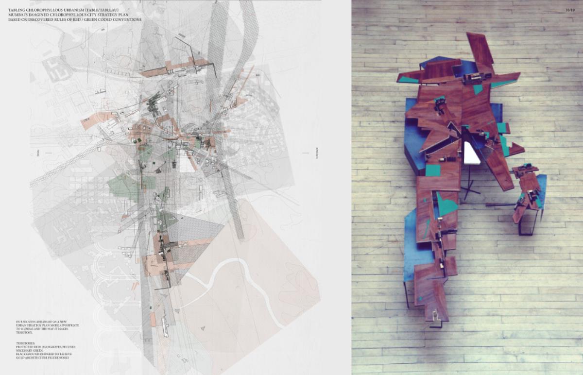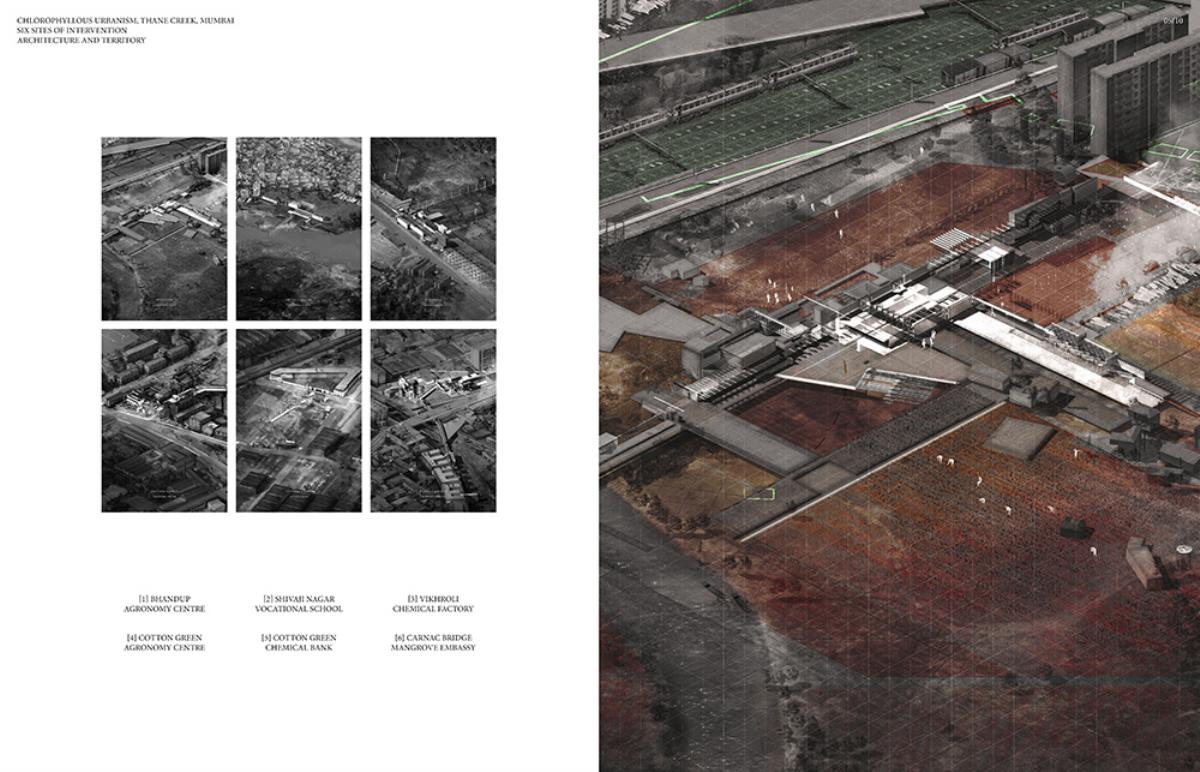 Chlorophyllous Urbanism: Mumbai Part 2 Project 2015 Marshall InglisMarcus Rothnie Edinburgh School of Architecture and Landscape Architecture | UK Chlorophyllous Urbanism describes a method of intervening in Mumbai based on a new visualisation of the city as in a state of continuous revaluation between the economies of its fecund mangrove forests, red, and the economies of the colonial cotton industry, green. It is understood within this visualization that red does good and is more appropriate to how Mumbai naturally territorialises. The ultimate goal of the project is the propagation of more reds within a global city which prioritises the ideologies of the green. In the development of Chlorophyllous Urbanism, (a type of urbanism more in tune with the underlying feculent characteristics of Mumbai), six sites of investigation have been tactically deployed to investigate the semantics of red and green along Mumbai’s Thane Creek coastline through a philosophical deployment and spatialisation in ‘blooms’ within the landscape. Programmatically, these interventions of architecture and territory, gold, sure up and propagate associated ecological, social or political reds and dismantle prevailing colonial greens. Finally, these newly developed persuasive architectures are mobilised and legitimised as a Chlorophyllous Urbanism strategy plan for an imagined city of Mumbai where the theories and territorial aspirations of the fecund red can be played out as an alternative political proposal. Tutor(s) Dr. Dorian Wiszniewski