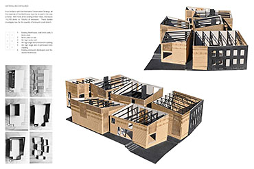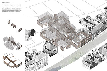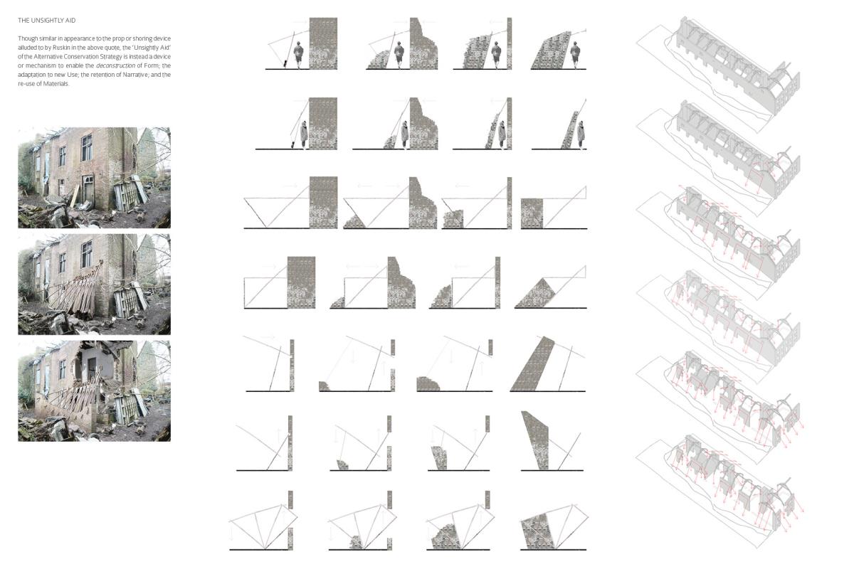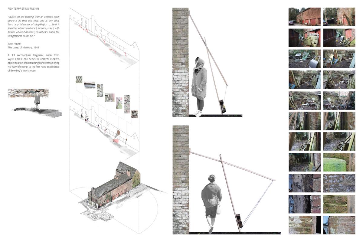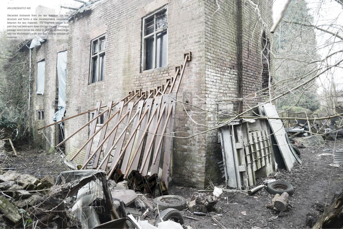 Re-Storying the Workhouse: An Alternative Conservation Strategy Part 2 Project 2015 Gemma Wheeler Cardiff University | UK The patchwork of new building materials spliced into old tells the story of Bewdley’s adaptation to change. Informed by Ruskin’s legacy of “anxious care”, however, Bewdley’s conservation policy sees buildings as “heritage assets” that must be preserved. This thesis questions the staticising foundations upon which Bewdley’s building conservation rests and proposes extracting an alternative Ruskinian influence to enable buildings to flow and change with their users’ changing needs. Ruskin advocated a way of seeing the world that focused either on its minutiae of shifting details or sweeping drama of the sublime, capturing in his own and Turner’s paintings a worldview without boundaries or objects. It is this way of seeing that forms the basis of an Alternative Conservation Strategy which sees Form demoted and supplanted by Material, Use and Narrative, to enable Bewdley’s buildings to be ‘re-storied’. The focus for this exercise is on turning Bewdley’s derelict, Grade II Listed, C18th Workhouse into an Adult Education Centre. The strategy is facilitated by Ruskin’s ‘unsightly aid’ that is reinterpreted from prop or shoring device, into a series of oak frames over which the Workhouse’s existing brick can be stretched; redefining, in the process, the traditional intradependence between brick and timber. Tutor(s) Kate Darby