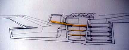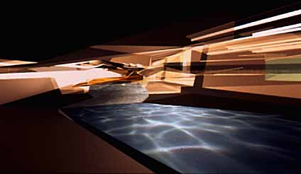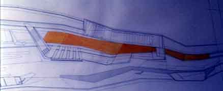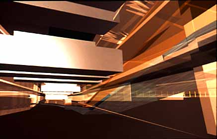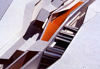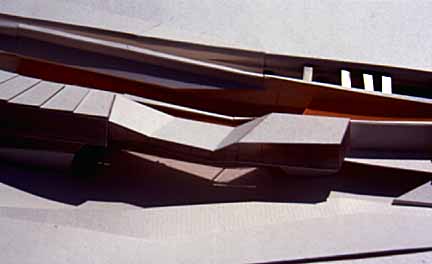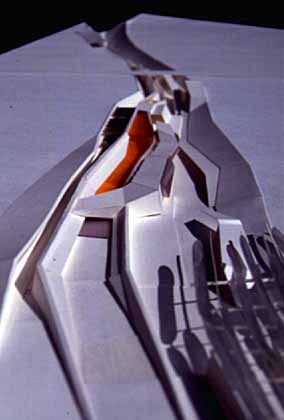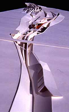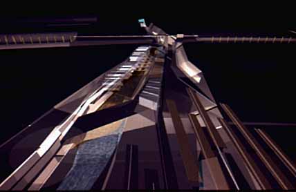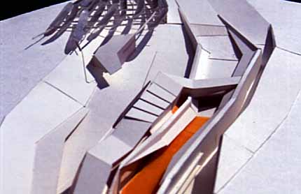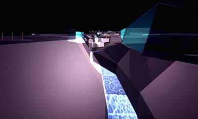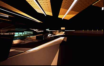 Her technology dissertation, which accompanied the project, investigates the economics of agri-business generally, and the mechanics of making margarine using the free resources of gravity, wind, water and sun. From this follows with impeccable logic every aspect of the project: the cutting of the canyon, its spanning by drying racks, the zig-zag fall of the yellow river of oil, the truck ramps. Particularly successful architecturally is the spatial development along its length of the canyons short section: an ever-changing composition of volumes, functional elements, and the light which - filtered by the racks above, or coloured by the oil in its transparent conduit - softly illumines the canyon ís banks and floor. The presentation of the project is remarkably well judged. A full set of elegant drawings and card models of the site and building display the precision of the spatial arrangement, while a computer-rendered fly-through movie shows us what it would be like to inhabit this richly various and luminous environment.