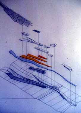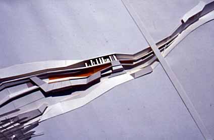The site ís exposed nature and adjoining watercourses suggested the design of a factory for edible oils and margarine. The architectural aim was to remake the landscape so that it, and the industrial process it was to accommodate, would be an organic part of each other.In this project a canyon is cut into the landscape, extending and connecting the two existing valleys, and accommodating the factory, which uses the existing spring as its water supply. The fields above grow rapeseed and sunflower, cultivated in annual rotation. Harvested, the oilseeds are taken to wind-drying racks which span the canyon, they drop gradually down into the factory for milling. The resultant oil flows slowly down an open conduit, an artificial river, at various stages of refinement being drawn off by gravity as crude oil, edible oil or margarine. The products are bottled or packed on the canyon ís bed, where they are loaded into lorries for dispatch. Close to the road a public centre is located which is linked by a pedestrian path with a motel on the other side of the road. The motel is embedded in the canyon ís slope slightly remote from the rest of the factory -a place for truck drivers and visitors to stay.Integrating the oil factory into arable land which provides its raw material allows a reinterpretation of both industrial and rural landscapes. There is no opposition, organisational or conceptual, between the processes which take place in the fields and those in the canyon. Both are artifice, both are nature - works of man, but dependent on the natural cycles of water, wind and the sun.