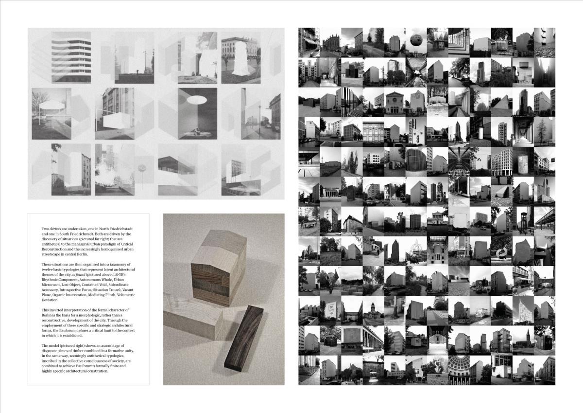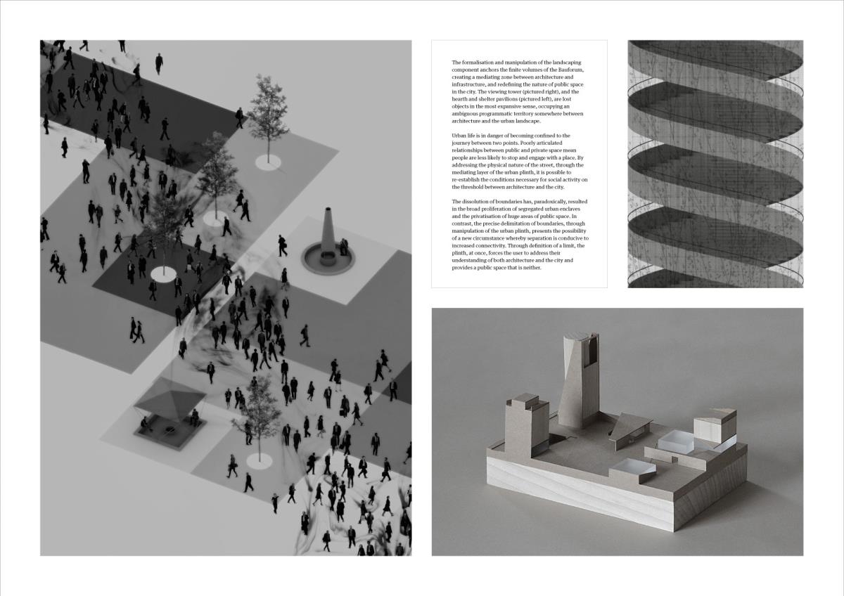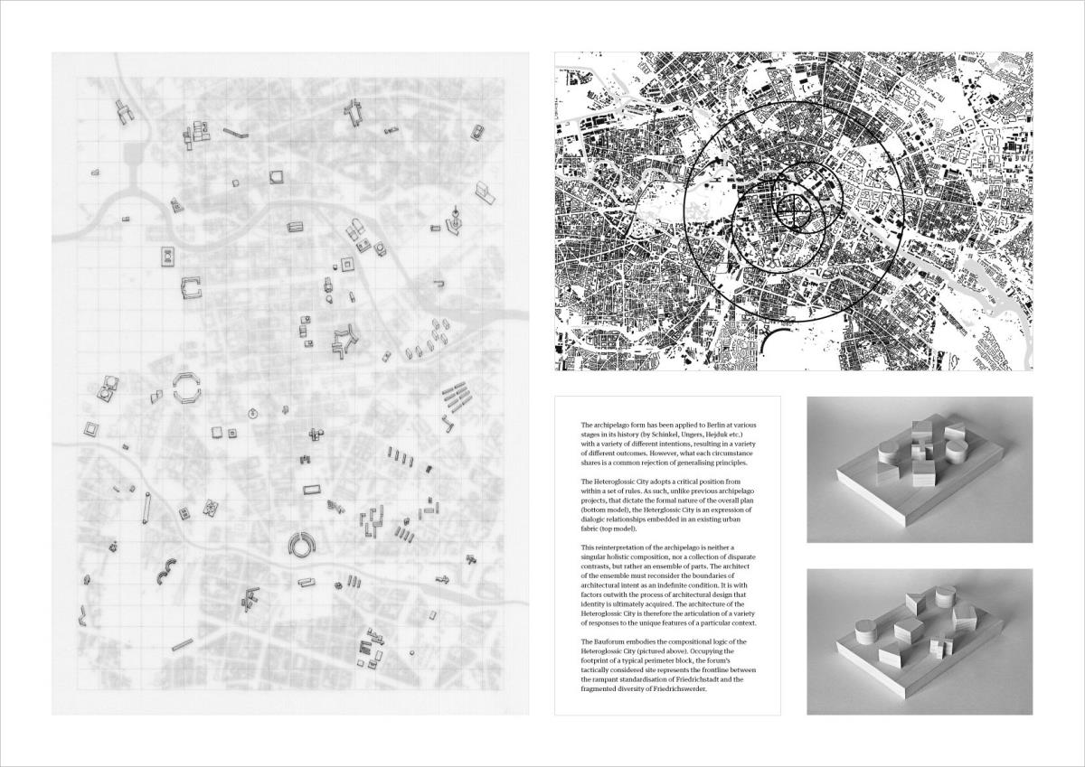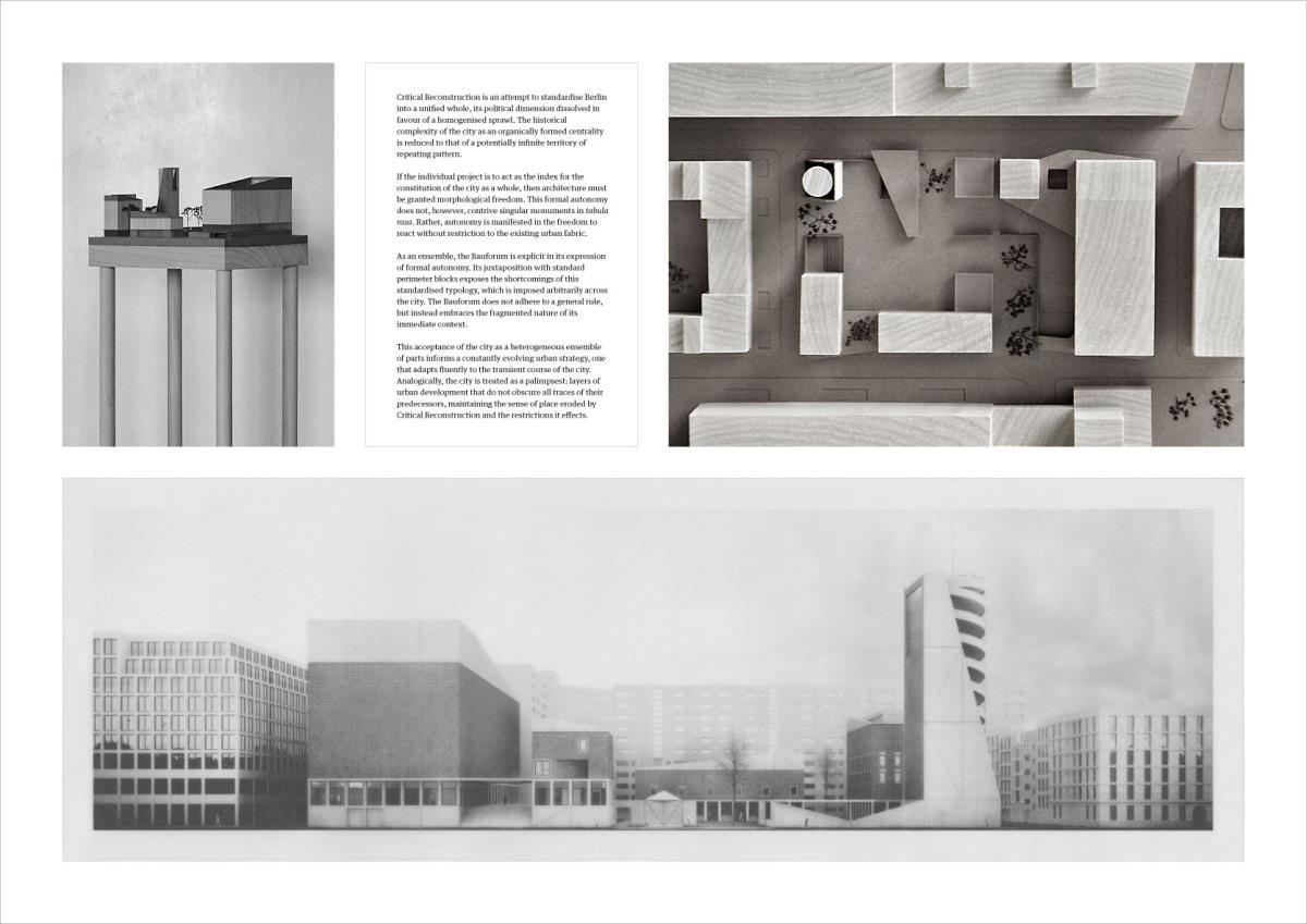 The Heteroglossic City: A polemic against critical reconstruction in Berlin Part 2 Project 2015 Finn Wilkie Mackintosh School of Architecture | UK The thesis is a critique of the managerial urban paradigm of Critical Reconstruction, against which a response is developed at both an urban and an architectural scale. The totalizing ideology of post-unification planning in Berlin is rejected and a partisan urban development strategy is elaborated through formally finite and contextually specific architectural interventions. This Heteroglossic City is conceived as a dialogically articulated ensemble of diverse relationships in a polycentric and structurally organic urban plan. The formal, metaphysical, and programmatic consequences of Critical Reconstruction are identified as the primary areas of contention. Through comprehensive analysis of these specifics, a conceptual framework is established from which an illustrative architectural intervention is determined: the Bauforum. This finite and critical response to the urban environment embodies both an architectural and an urban intent: in the Heteroglossic City, the specific circumstance is the index for the constitution of the urban structure as a whole.As a platform for dialogue-focused planning, the components of the Bauforum serve as a physical pivot for the development of a more sustainable urban development strategy: a collective endeavour, growing out of what is present and continuously adjusting to changing circumstances over time. Tutor(s) Robert Mantho