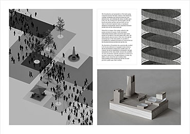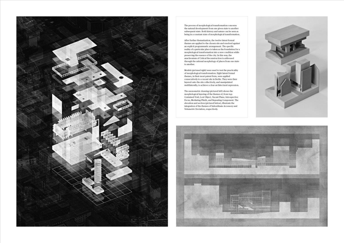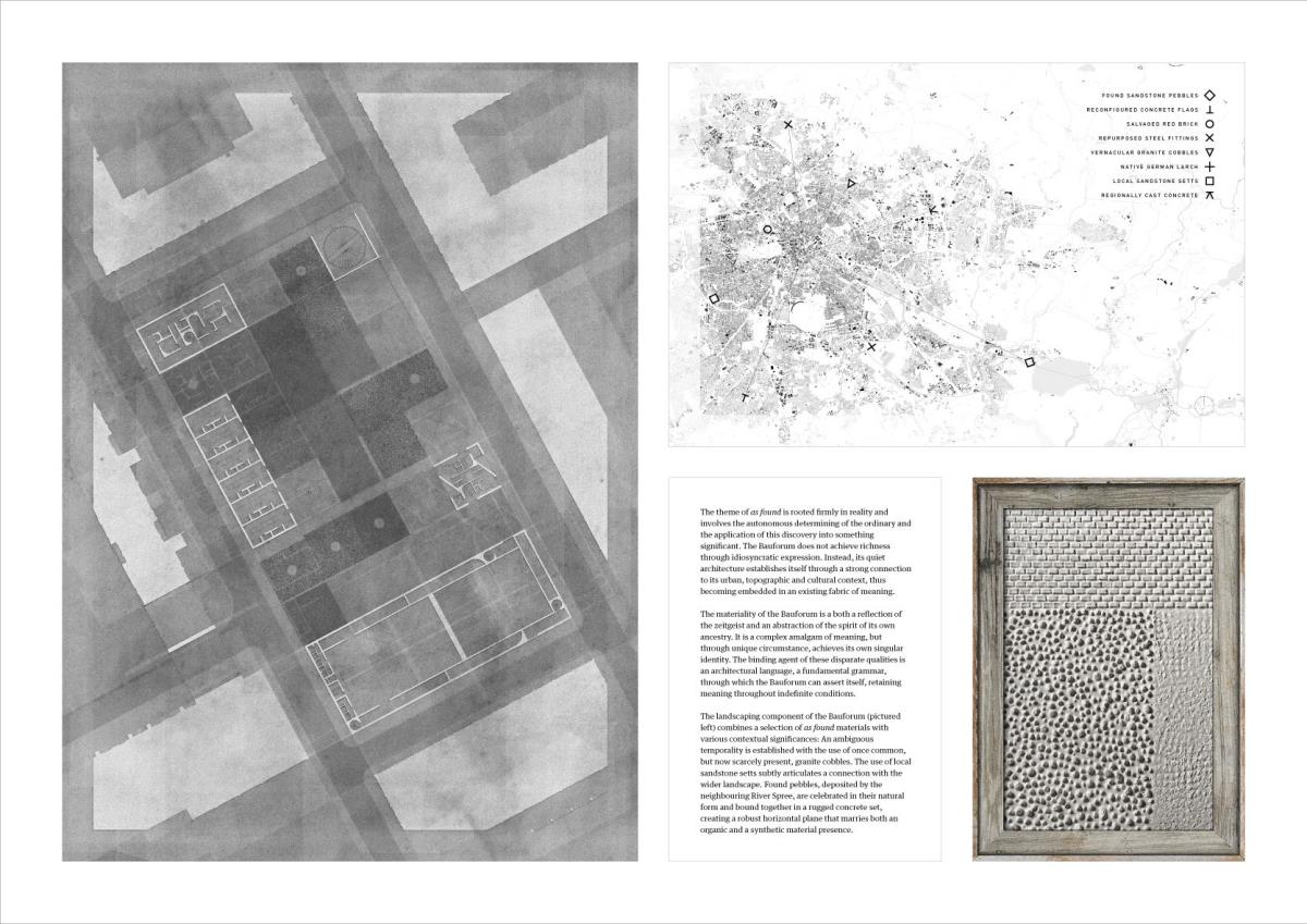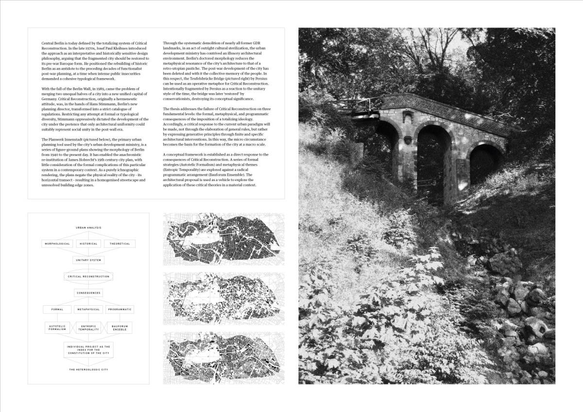 The Heteroglossic City: A polemic against critical reconstruction in Berlin Part 2 Project 2015 Finn Wilkie Mackintosh School of Architecture | UK The thesis is a critique of the managerial urban paradigm of Critical Reconstruction, against which a response is developed at both an urban and an architectural scale. The totalizing ideology of post-unification planning in Berlin is rejected and a partisan urban development strategy is elaborated through formally finite and contextually specific architectural interventions. This Heteroglossic City is conceived as a dialogically articulated ensemble of diverse relationships in a polycentric and structurally organic urban plan. The formal, metaphysical, and programmatic consequences of Critical Reconstruction are identified as the primary areas of contention. Through comprehensive analysis of these specifics, a conceptual framework is established from which an illustrative architectural intervention is determined: the Bauforum. This finite and critical response to the urban environment embodies both an architectural and an urban intent: in the Heteroglossic City, the specific circumstance is the index for the constitution of the urban structure as a whole.As a platform for dialogue-focused planning, the components of the Bauforum serve as a physical pivot for the development of a more sustainable urban development strategy: a collective endeavour, growing out of what is present and continuously adjusting to changing circumstances over time. Tutor(s) Robert Mantho