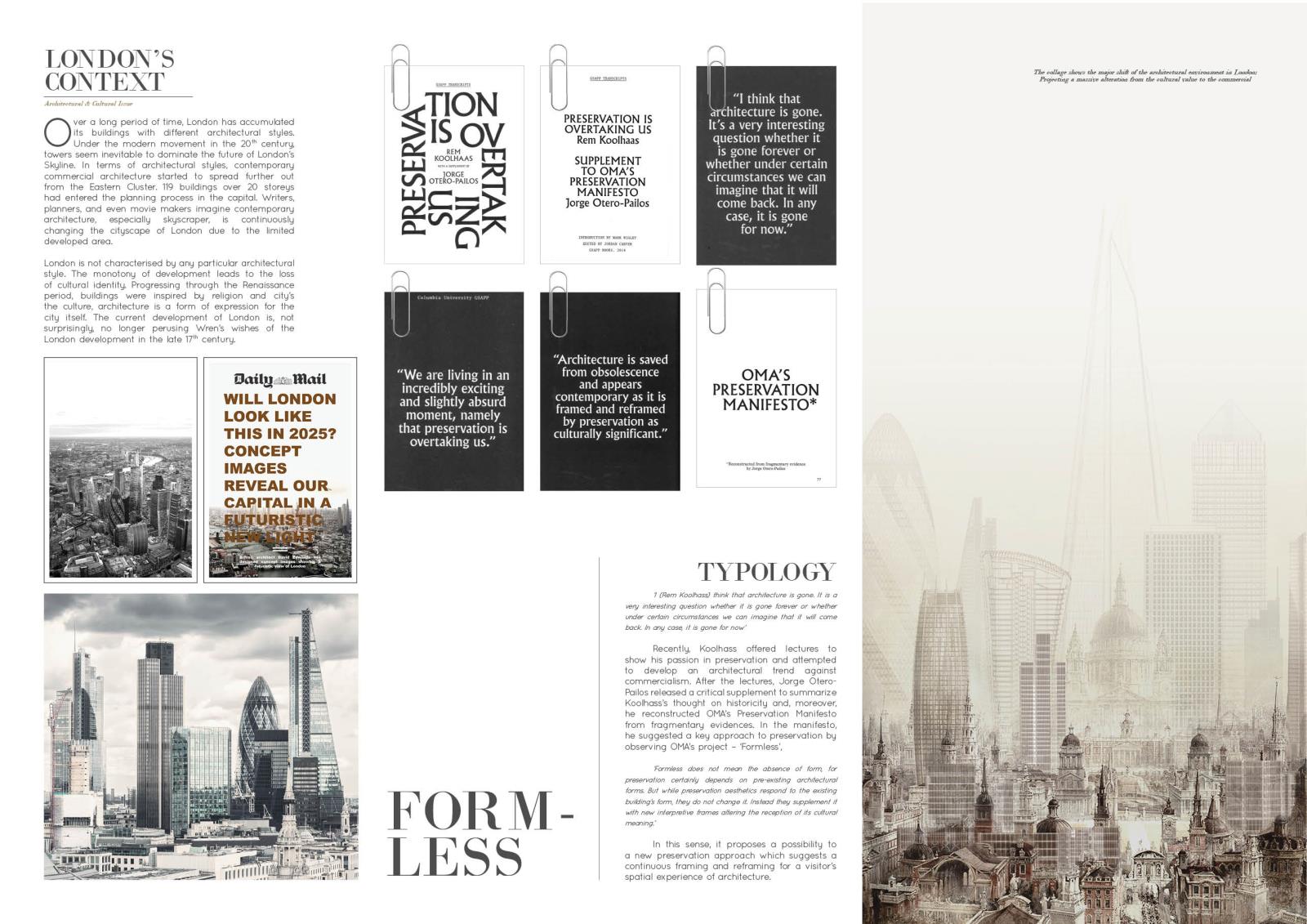 'Formless’ – An Alternative Typology for Preservation Part 1 Project 2016 Allan Yuk Lun Chong Newcastle University | UK This project takes a theoretical path in creating an alternative typology for preservation. It introduces a compromise between the desire for preservation and the cultural shift necessary for architectural expansion in the city’s future. Interpreting the concept of ‘formless’ in preservation means that architecture and heritage are no longer seen as permanent objects, but they keep transforming to re-frame their key spaces. Tutor(s) Josep-Maria Garcia-Fuentes Aldric Rodriguez Iborra