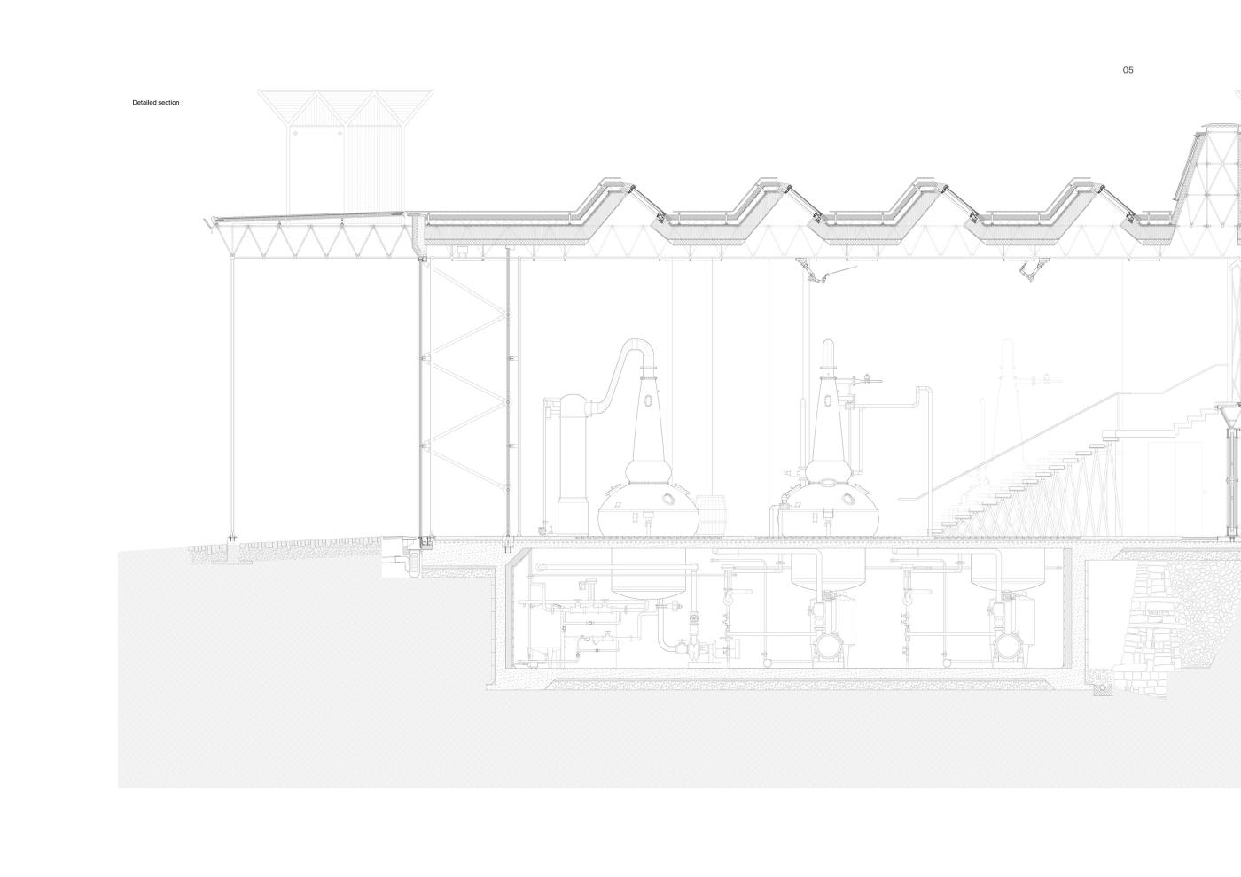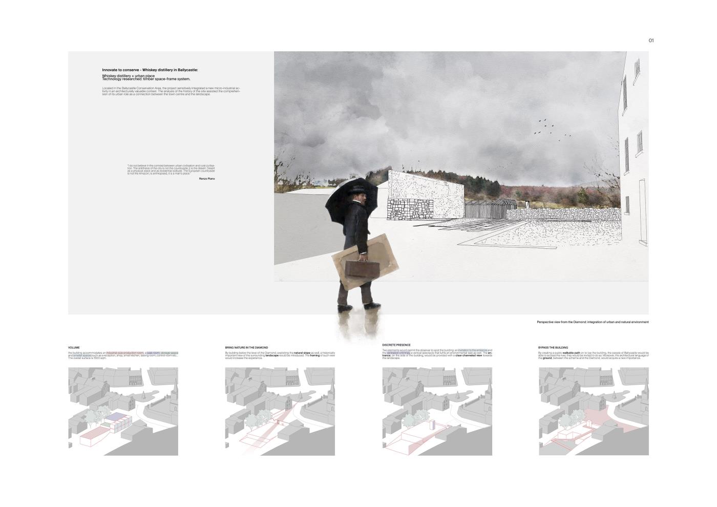 With the passing of time and negligence, Ballycastle, a town situated in the North Coast of Ireland, has witnessed its decadence and gradually lost the relationship with the surrounding landscape. A whiskey distillery aims at generating a new social fulcrum by occupying a vacant site beside the main town square. A timber space-frame system has been developed to provide a sustainable super-shed that guarantees flexible spaces convertible to future uses.