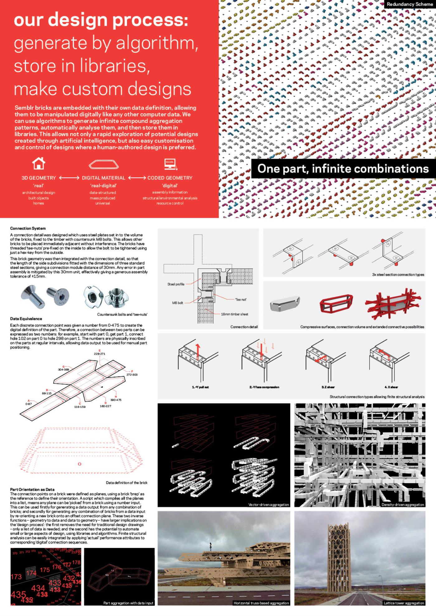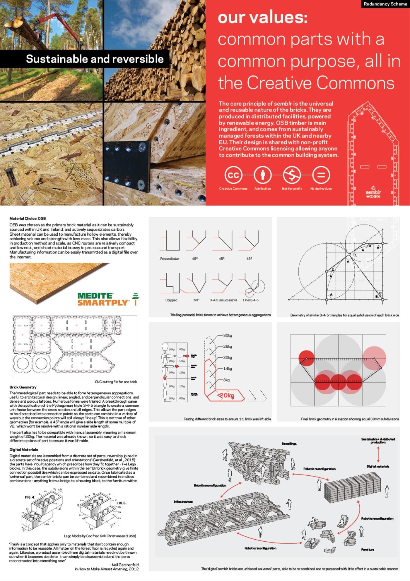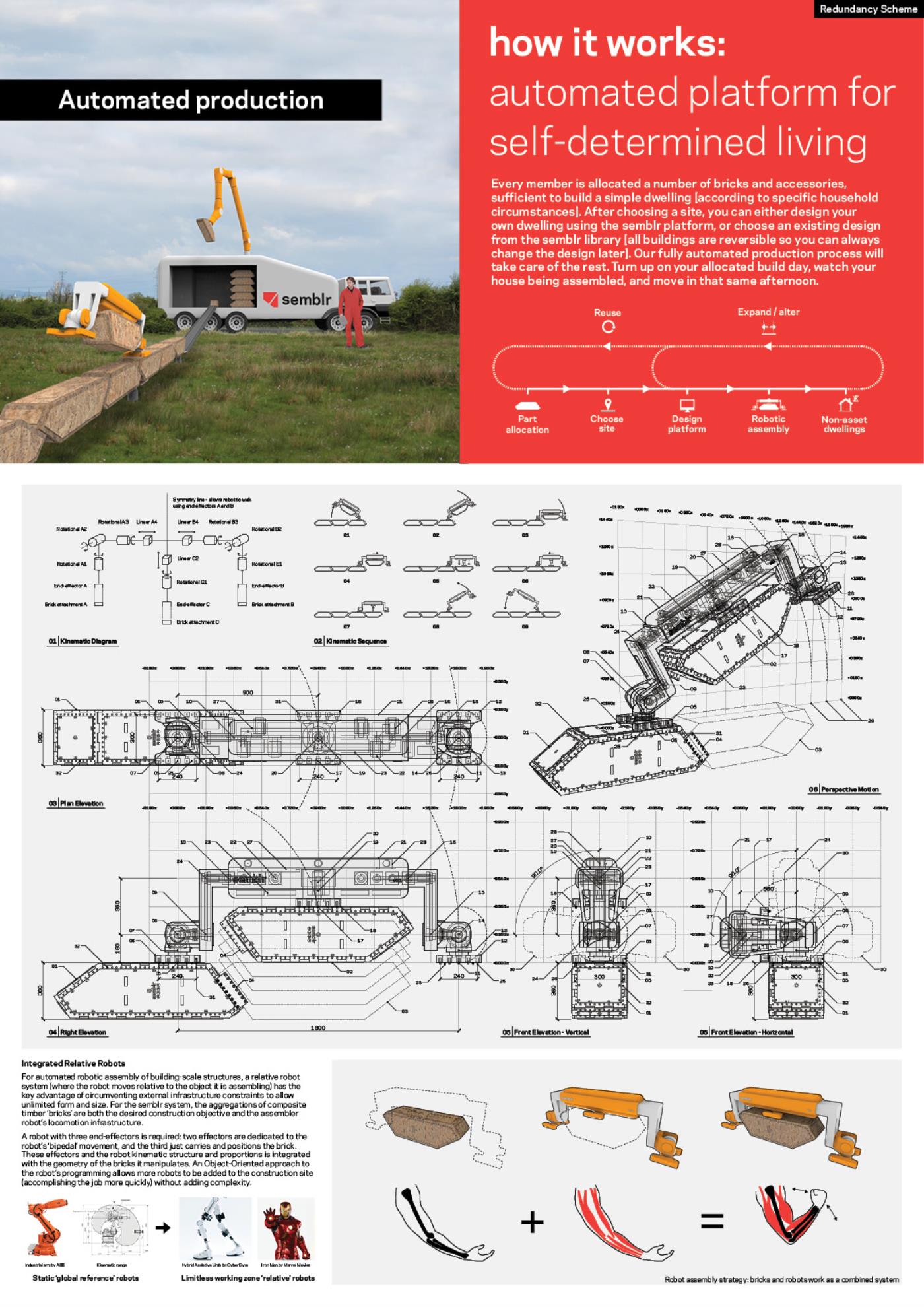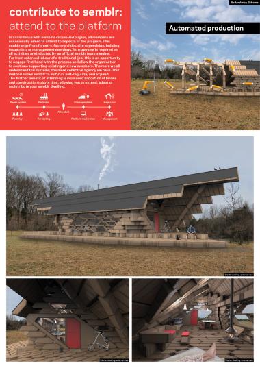 Semblr Part 2 Project 2017 Ivo Tedbury The Bartlett School of Architecture, UCL | UK Semblr is a building system to enable fully-automated construction of housing for a post-work society. Identical timber building bricks, integrated with custom robots which climb over and position the bricks, make automated assembly possible, also allowing for easy changes to the building over time. The system challenges failing contemporary methods of housing production, instead proposing automated construction as an essential tool to expand people’s freedom and life fulfilment. Tutor(s) Mollie Claypool Manuel Jimenez Garcia Giles Retsin