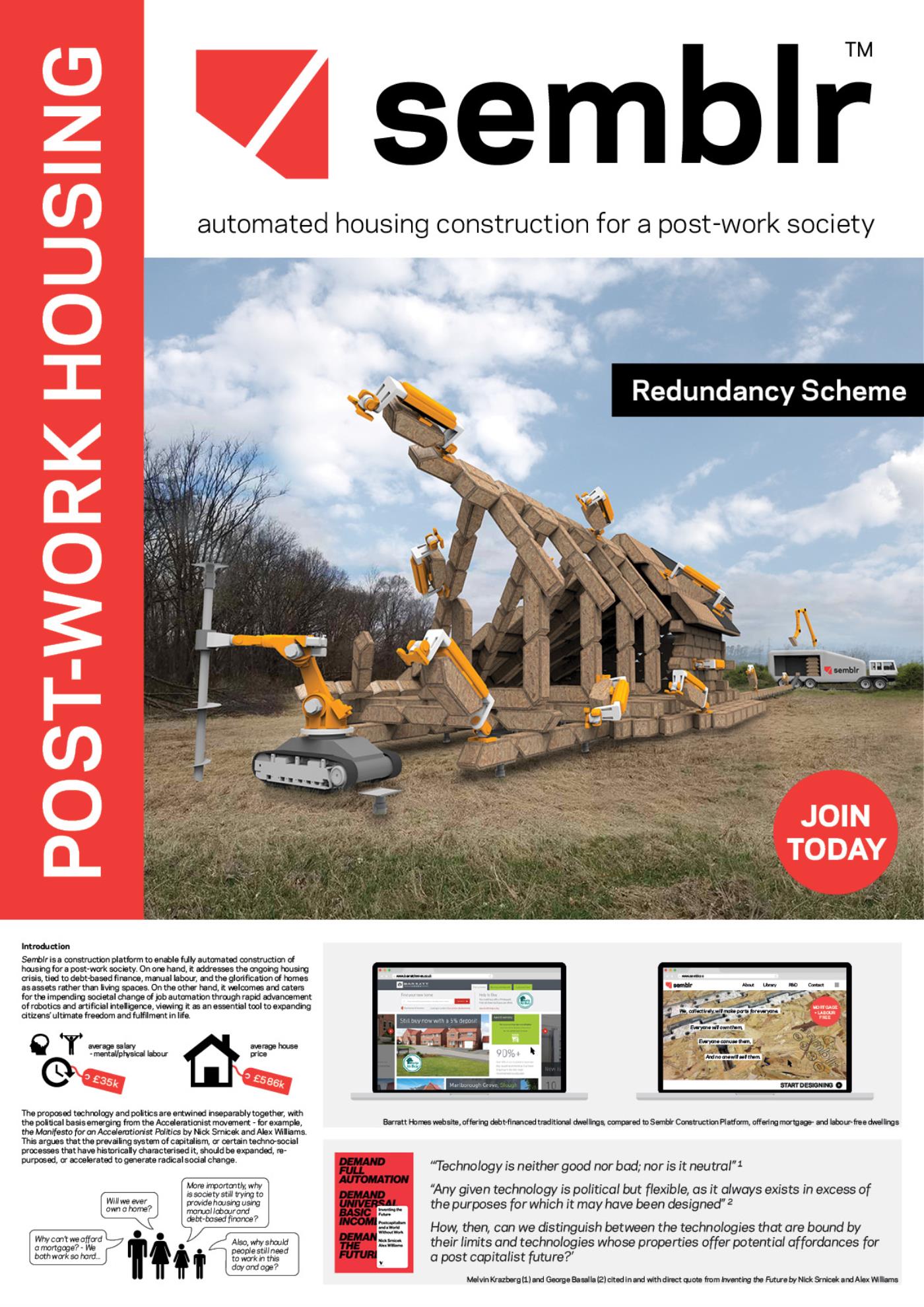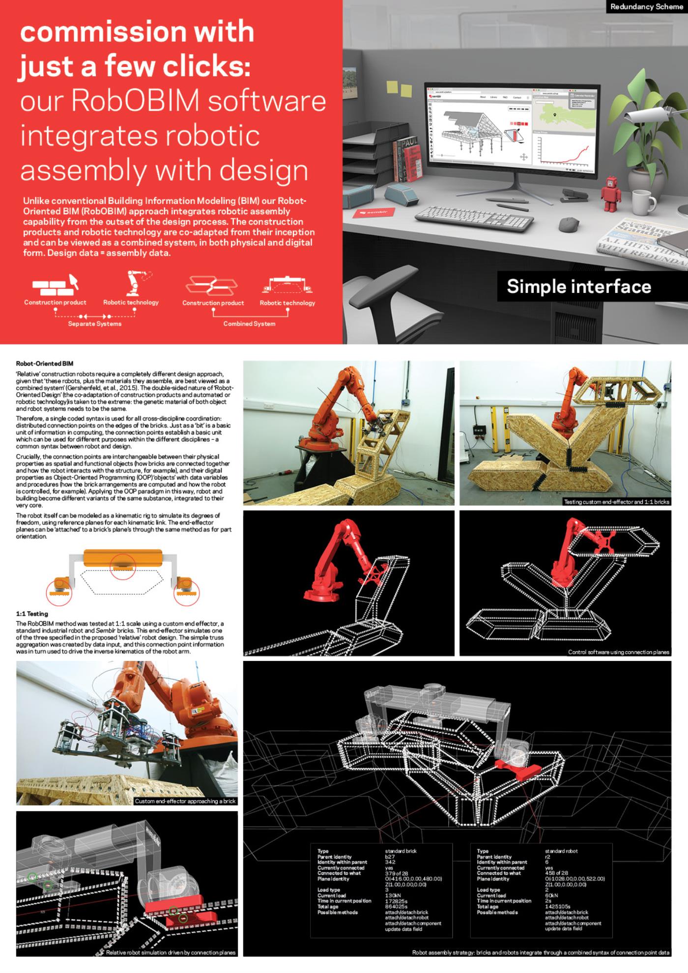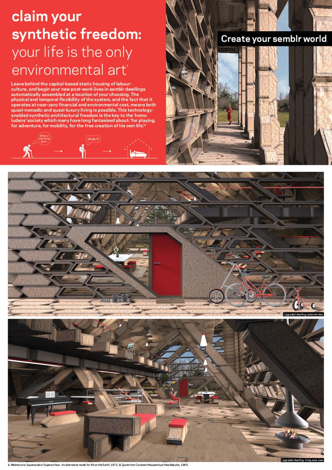 Semblr Part 2 Project 2017 Ivo Tedbury The Bartlett School of Architecture, UCL | UK Semblr is a building system to enable fully-automated construction of housing for a post-work society. Identical timber building bricks, integrated with custom robots which climb over and position the bricks, make automated assembly possible, also allowing for easy changes to the building over time. The system challenges failing contemporary methods of housing production, instead proposing automated construction as an essential tool to expand people’s freedom and life fulfilment. Tutor(s) Mollie Claypool Manuel Jimenez Garcia Giles Retsin