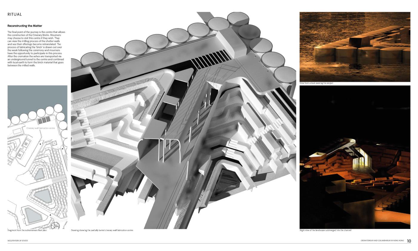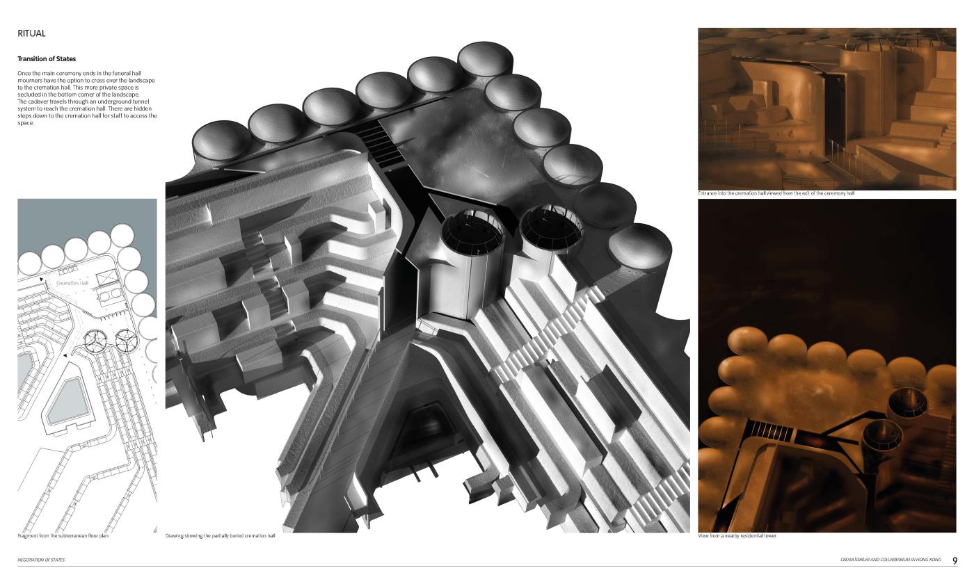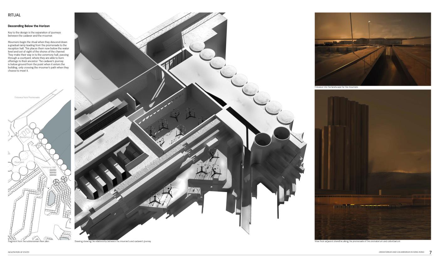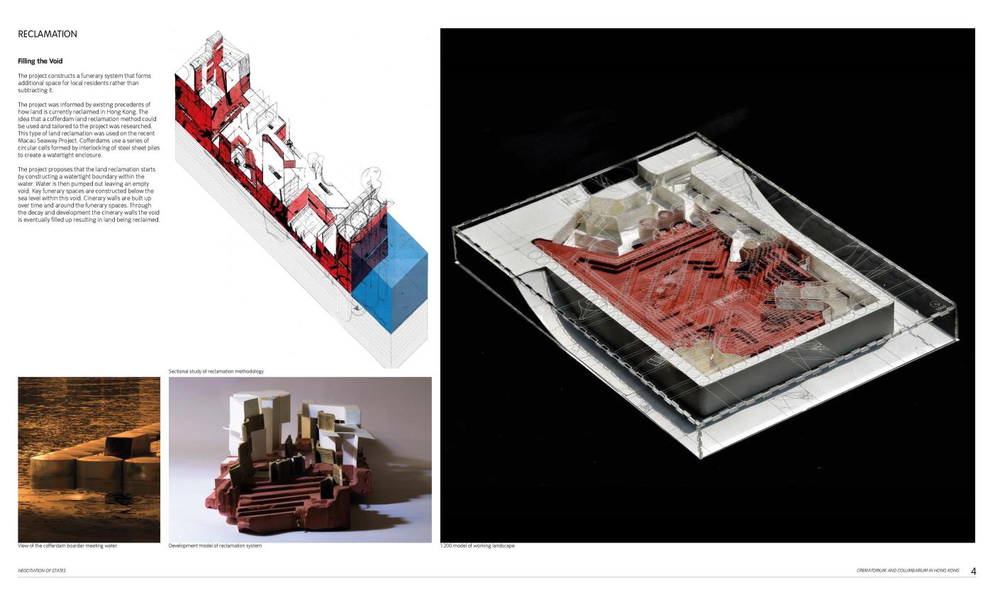 Negotiation of States: A Crematorium and Columbarium in Hong Kong Part 1 Project 2018 Grey Grierson The Bartlett School of Architecture, UCL | UK The proposal is a crematorium and columbarium within Hong Kong that is formed from a new funerary system. The system responds to the lack of space to house the dead within the city, manipulating existing digital technologies and land reclamation methodologies to formulate a new form of ancestral experience.Each death contributes to the landscape that emerges from a sunken void towards the horizon. Tutor(s) Jessica In Mr Chee-Kit Lai