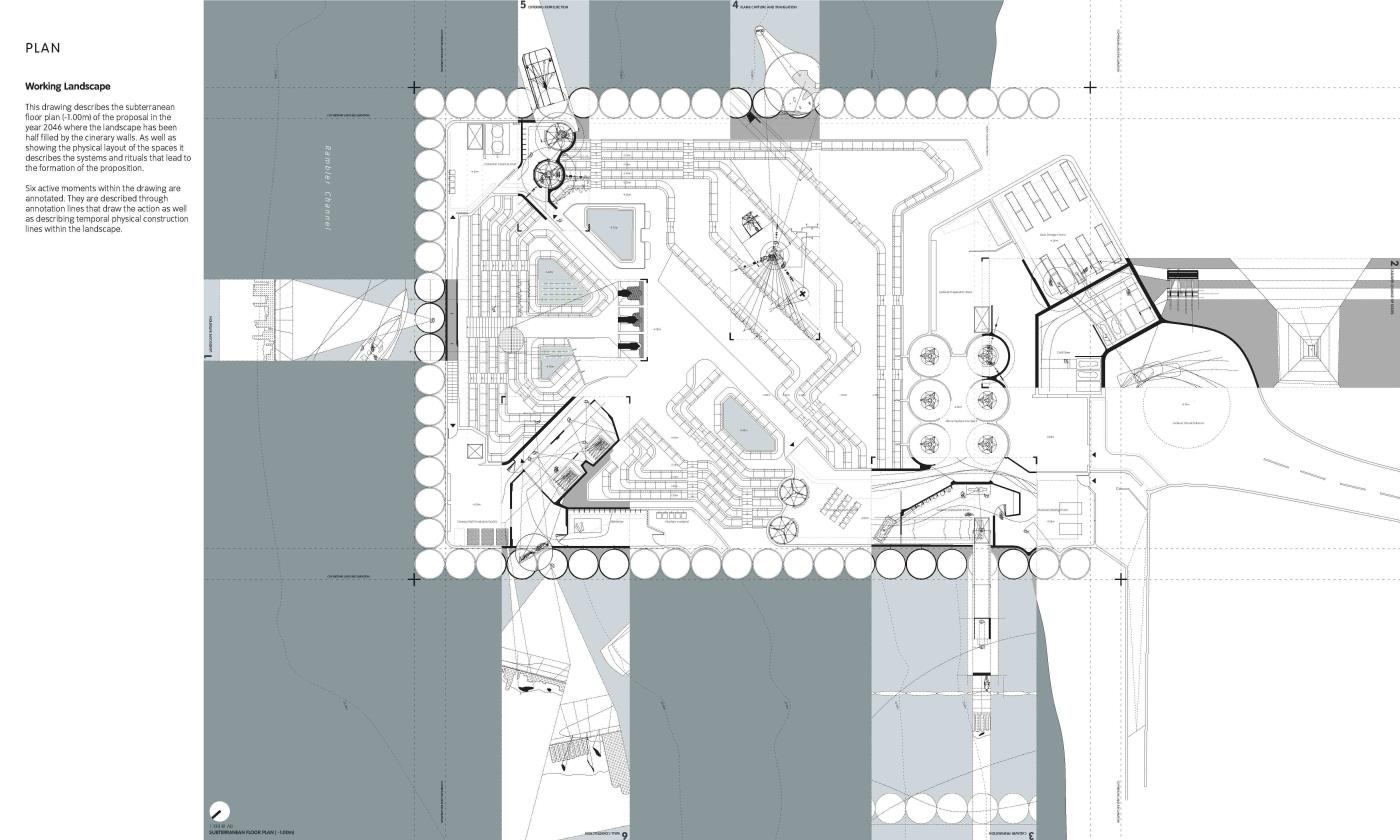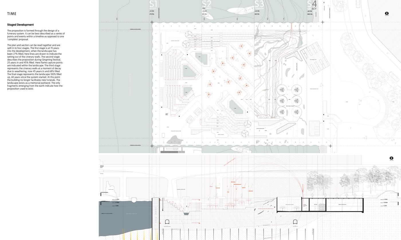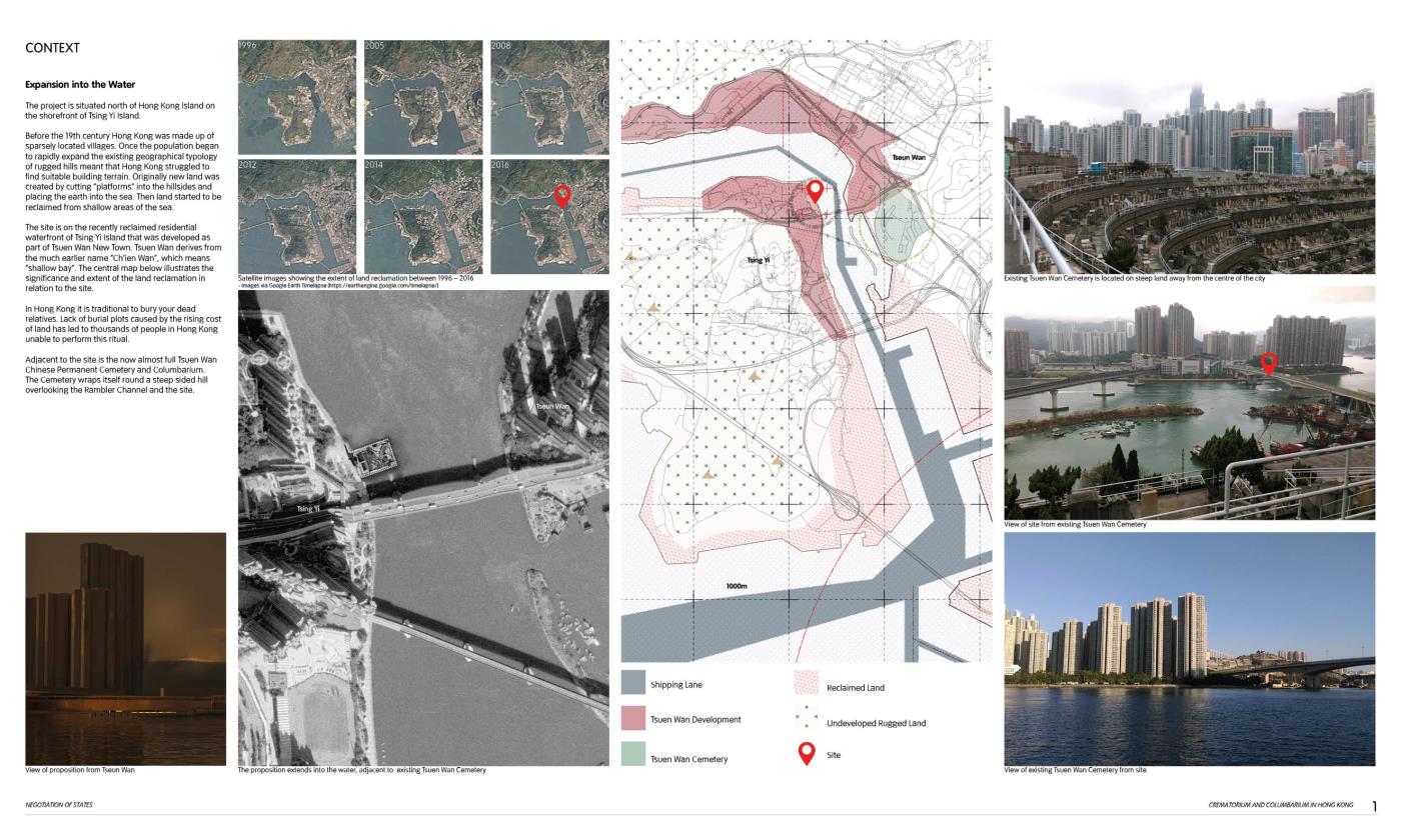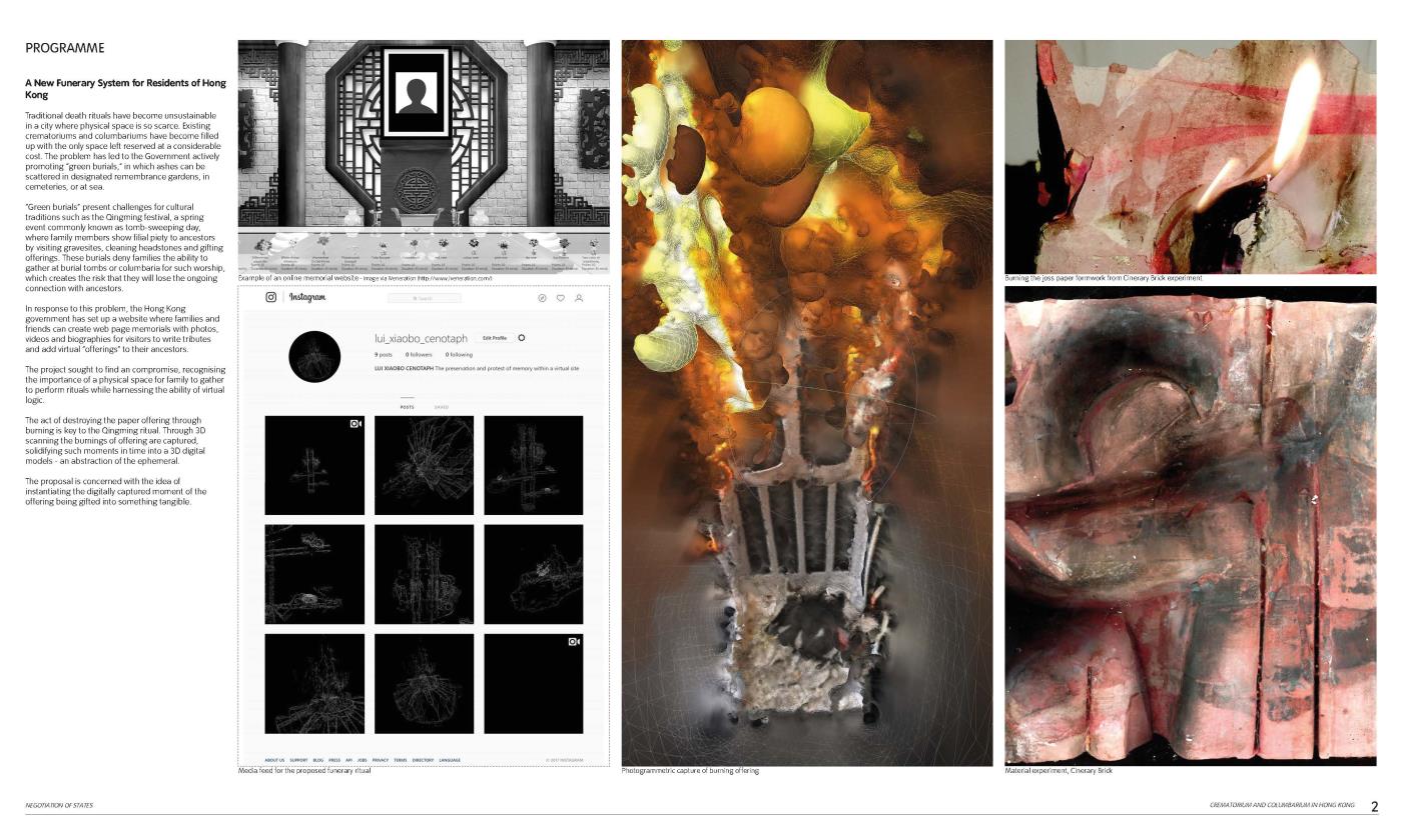 Negotiation of States: A Crematorium and Columbarium in Hong Kong Part 1 Project 2018 Grey Grierson The Bartlett School of Architecture, UCL | UK The proposal is a crematorium and columbarium within Hong Kong that is formed from a new funerary system. The system responds to the lack of space to house the dead within the city, manipulating existing digital technologies and land reclamation methodologies to formulate a new form of ancestral experience.Each death contributes to the landscape that emerges from a sunken void towards the horizon. Tutor(s) Jessica In Mr Chee-Kit Lai