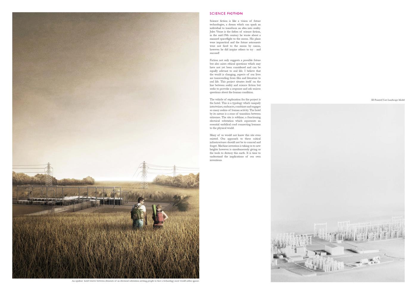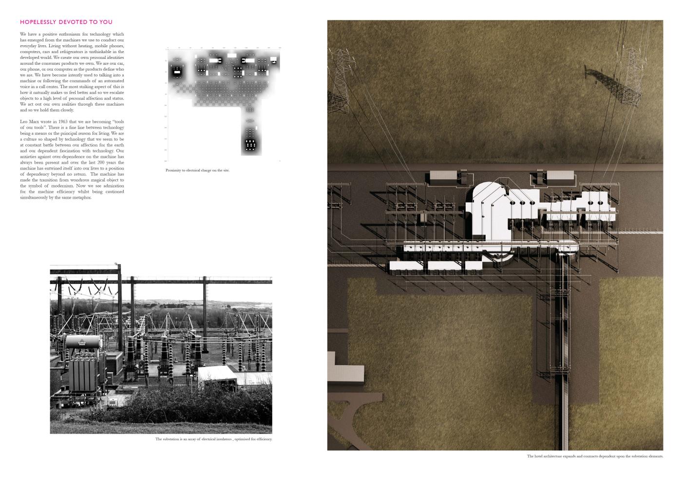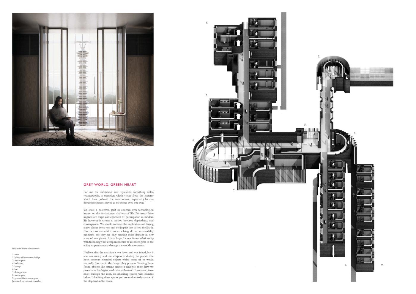 Dreaming of Electric Sheep Part 1 Project 2018 Justin Bean University of Bath | UK In our modern lives we are surrounded by technology continuously. We are empowered, our mind and body extended. Technology has always been tied to human existence and has changed the way we interact.This project is a hotel, situated within an electrical substation. An ordinary program in the presence of the extraordinary, seeking to ask questions about how living alongside technology affects our everyday lives. Tutor(s) Martin Gledhill Frank Lyons