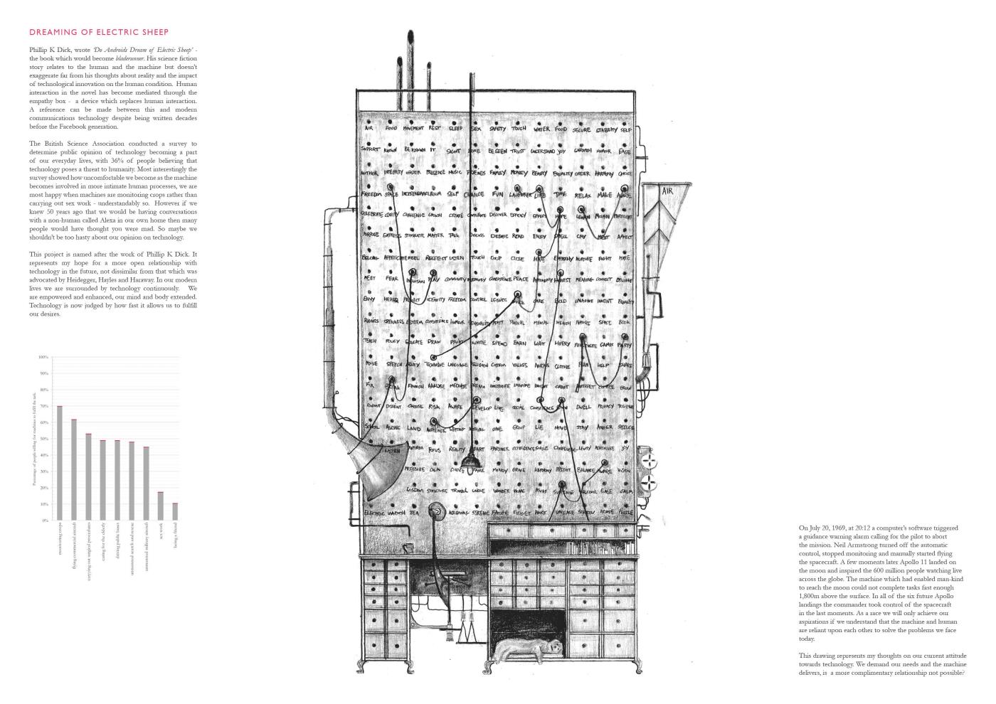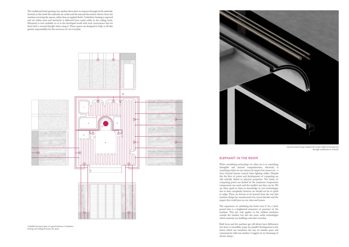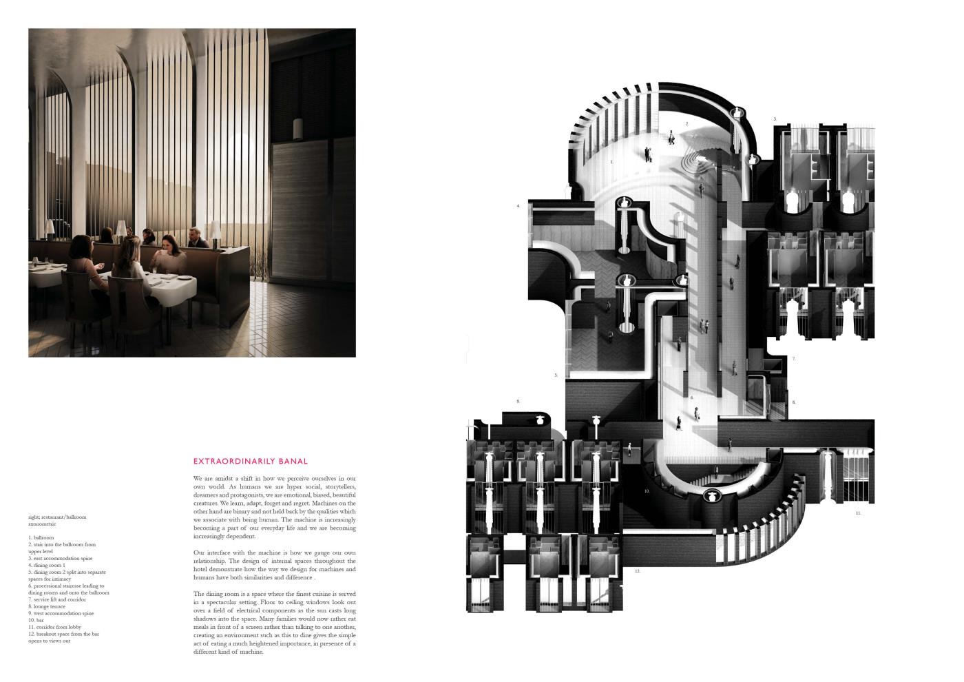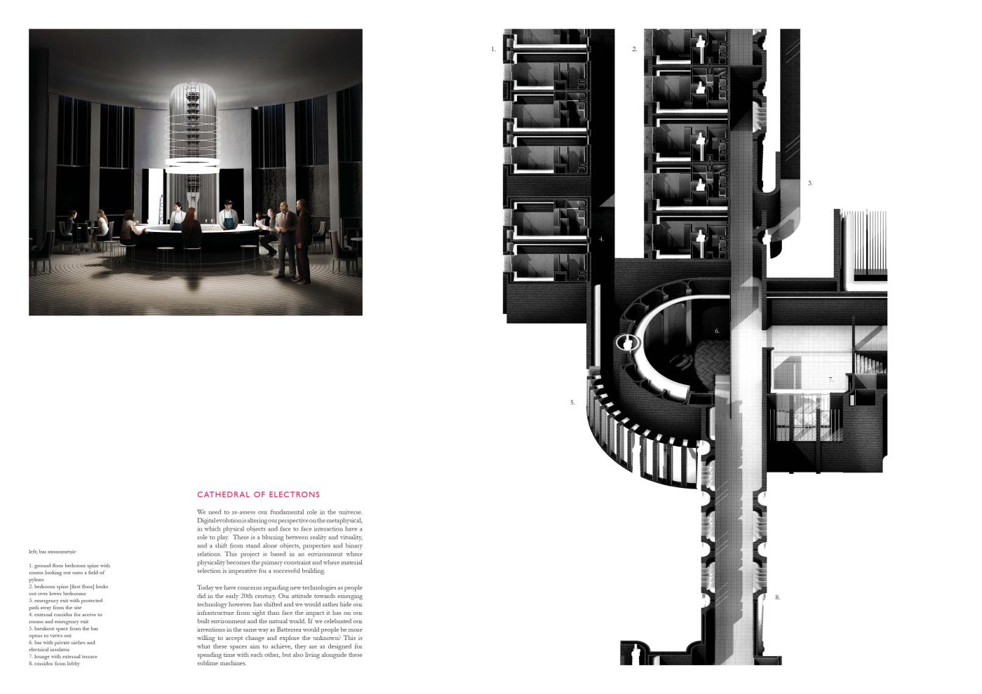 Dreaming of Electric Sheep Part 1 Project 2018 Justin Bean University of Bath | UK In our modern lives we are surrounded by technology continuously. We are empowered, our mind and body extended. Technology has always been tied to human existence and has changed the way we interact.This project is a hotel, situated within an electrical substation. An ordinary program in the presence of the extraordinary, seeking to ask questions about how living alongside technology affects our everyday lives. Tutor(s) Martin Gledhill Frank Lyons