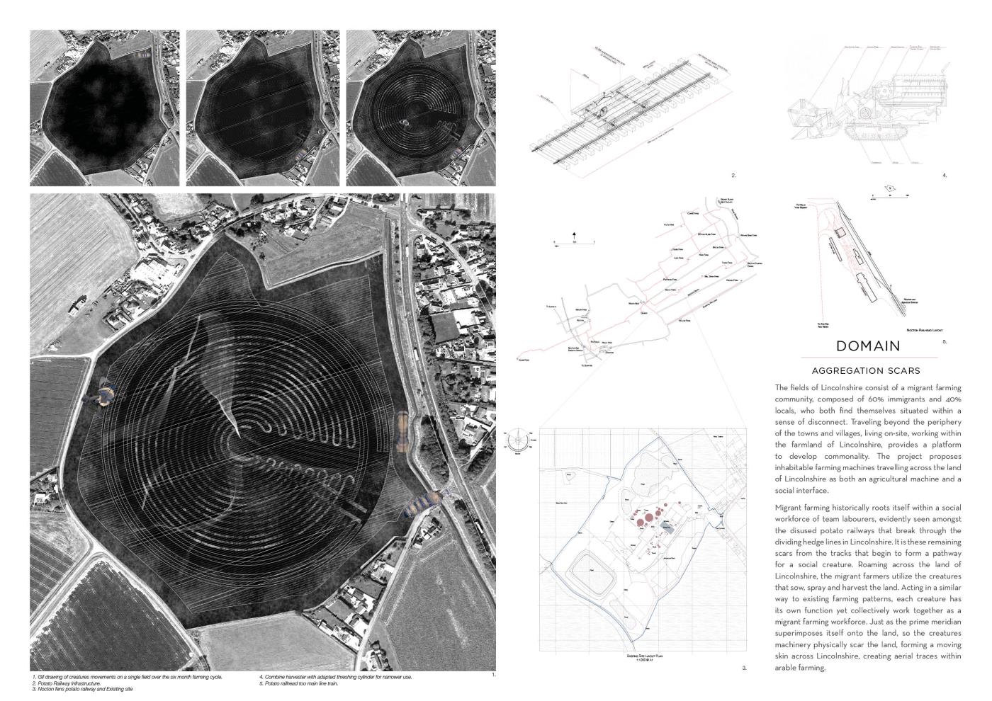 Common Fields is designed using social media as a tool in order to engage a diverse people group. Surrounding the epicentre of disconnect, the project manipulates the existing six month migrant farming work patterns and constructs a family of inhabitable farming creatures that act as a spectacle to the surrounding communities. By high-jacking existing machinery, a social platform is created: a collective skin of creatures scarring the land of Lincolnshire and forming a coterie on the dividing line of the prime meridian. Through a playful feed, the design explores how can architecture respond to form interaction in a community consumed by the digital interface?