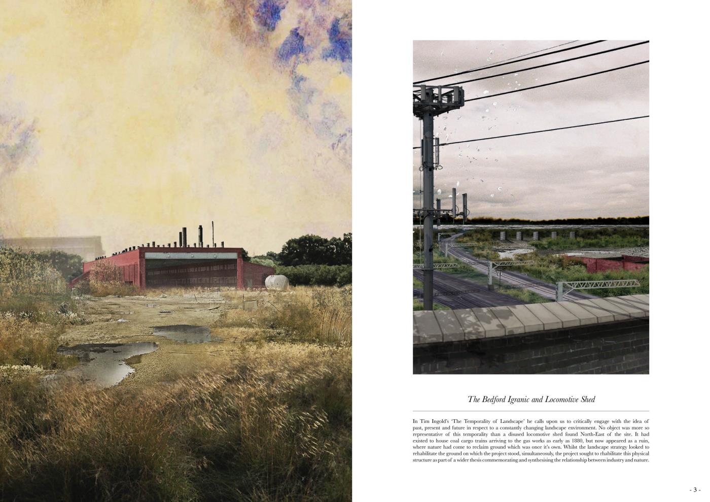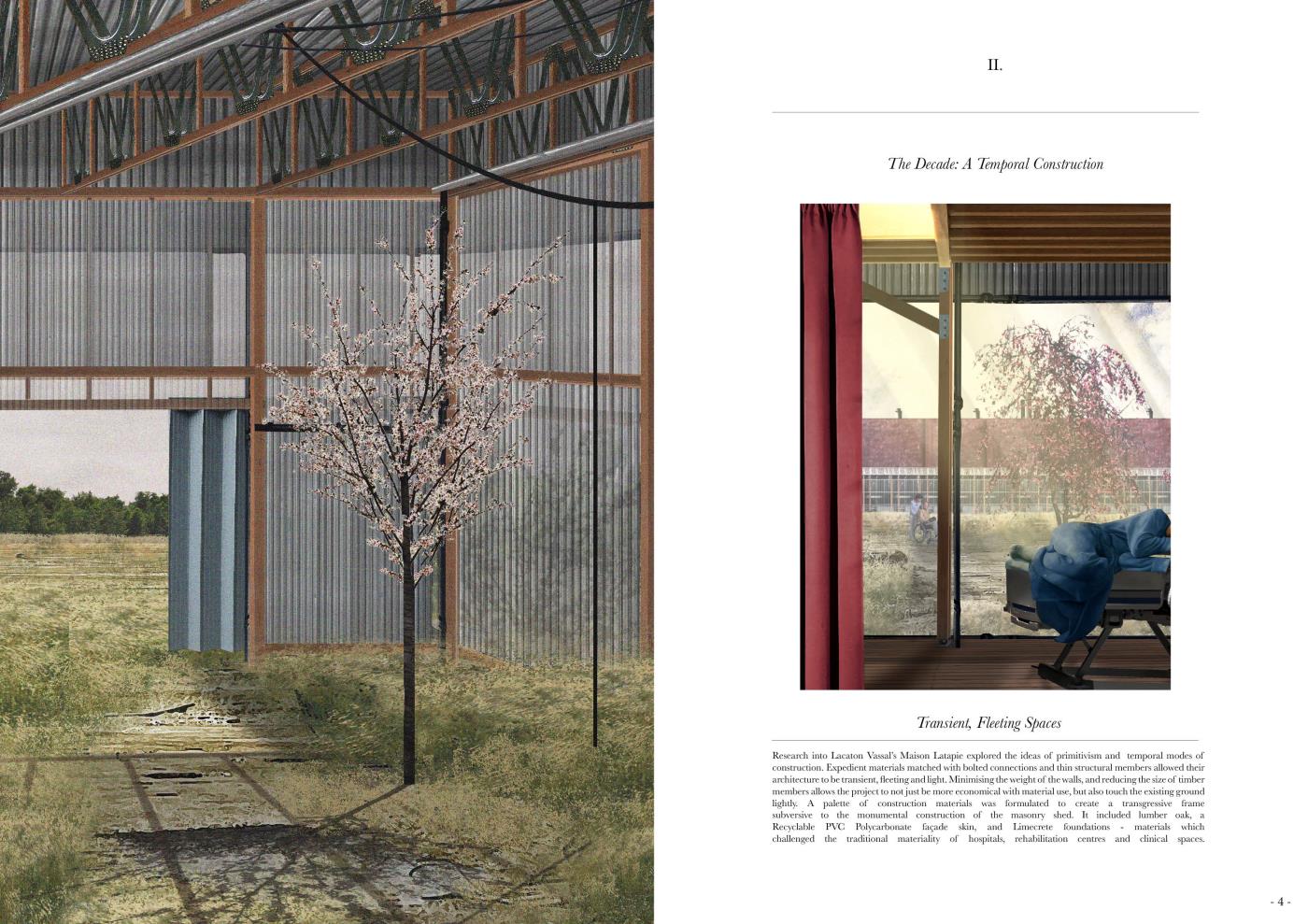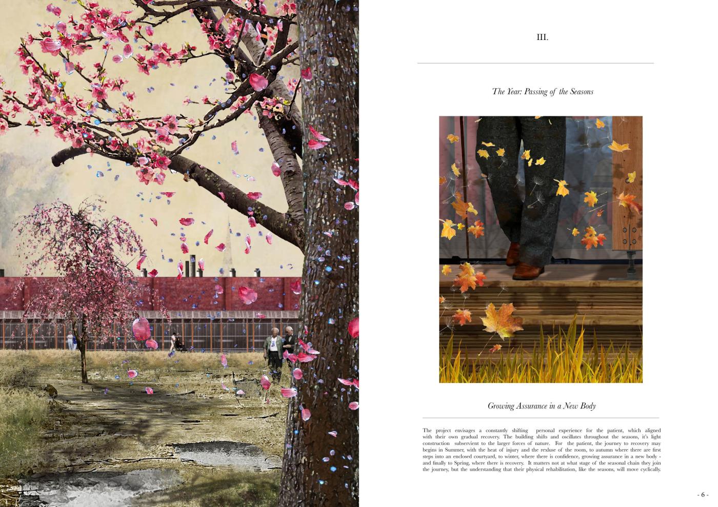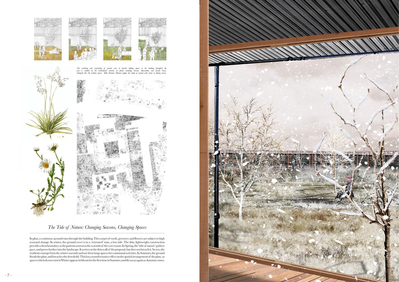Mono No Aware Part 1 Project 2020 Nabil Haque University of Cambridge | UK Mono No Aware loosely translates as an 'empathy towards non-human things.' It is also understood as the 'sensitivity to ephemera', meaning an awareness of impermanence and the transience of life.Built within the ruins of a nineteenth-century locomotive shed, the project proposes a setting for the rehabilitation of people with serious physical injuries alongside the rehabilitation of this existing building and the landscape beyond.Set in Ford End Road, Bedford, the project reflects on the town's industrial past, in specific reference to its existence for over 200 years as a coal gas works. While fossil fuel extraction is in opposition to the natural eco-system, the project understands the natural and the man-made as equivalent and leverages the site's history to synthesise an industrial past and an ecological present.Oscillating across four intertwining timescales, the spatial and experiential qualities of the project are conceived around the turn of the seasons, the dance of the day, and the rhythm of the sun. Thus, the project embodies the passing of time that characterises the process of recovery and rehabilitation, ultimately offering a place for progressively richer encounters between humans, plants and animals. Tutor(s) Rod Heyes Prisca Thielmann