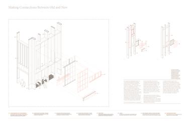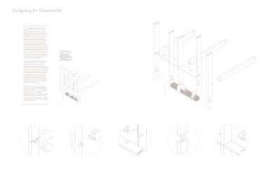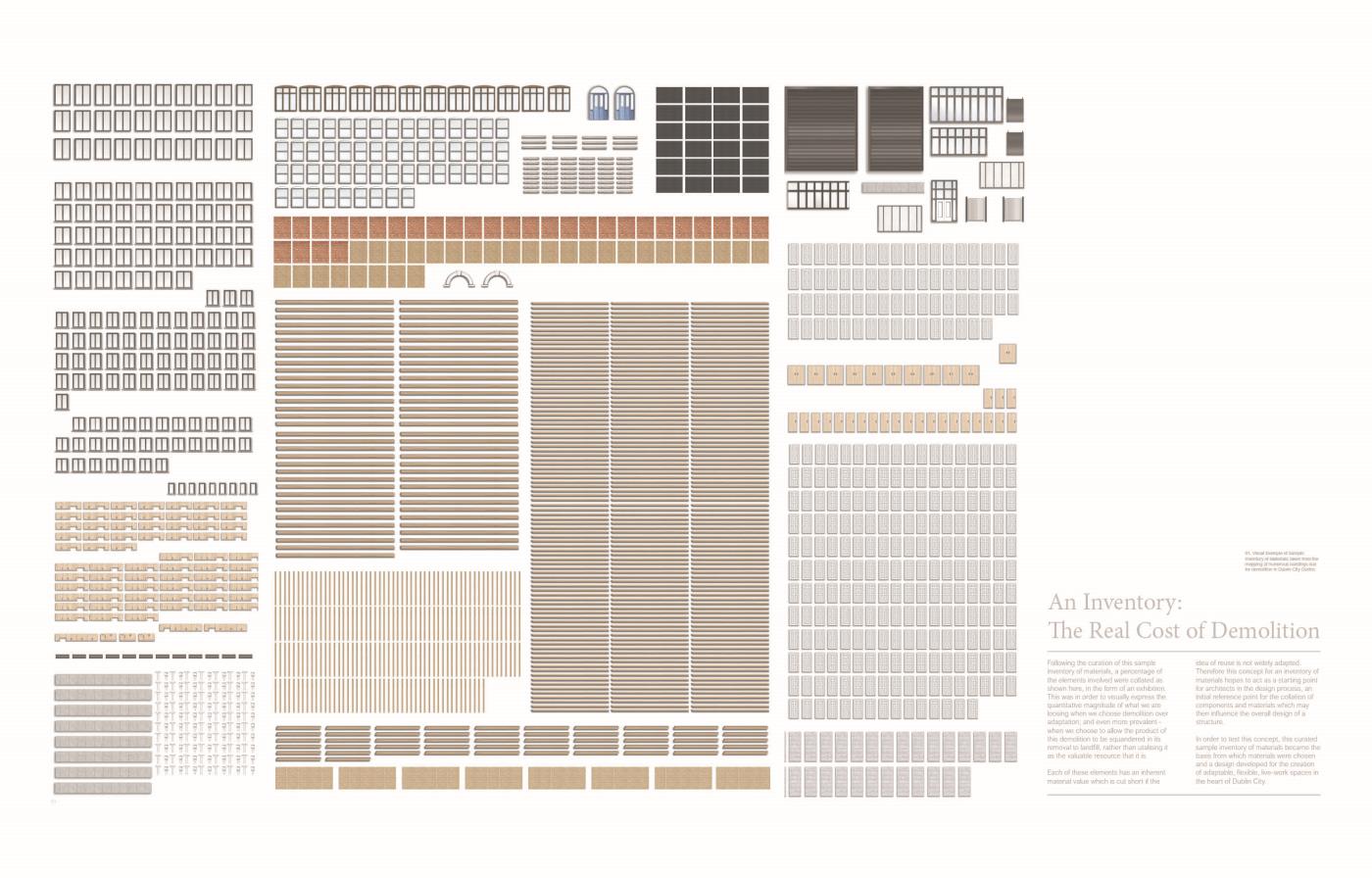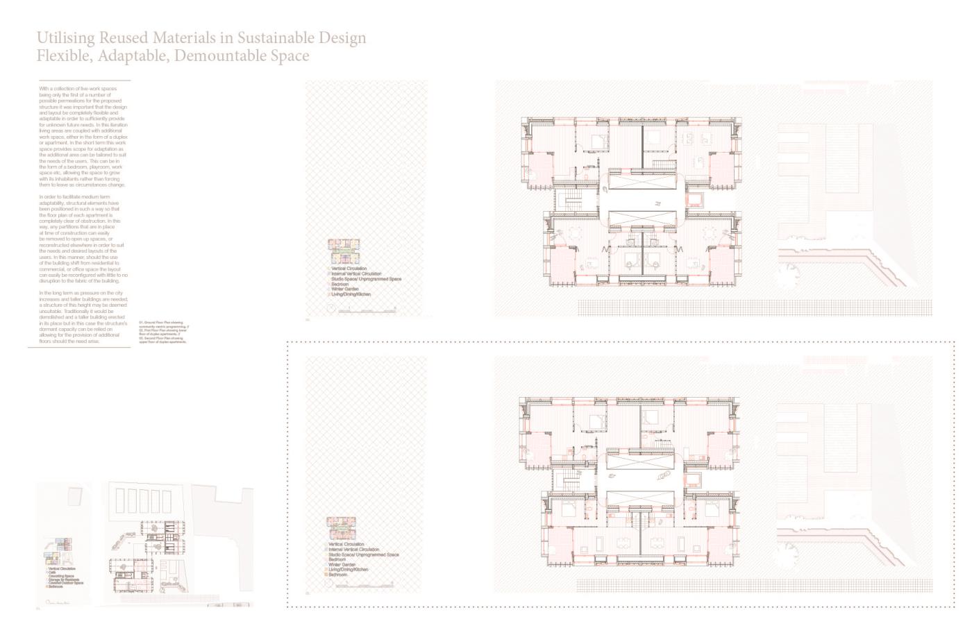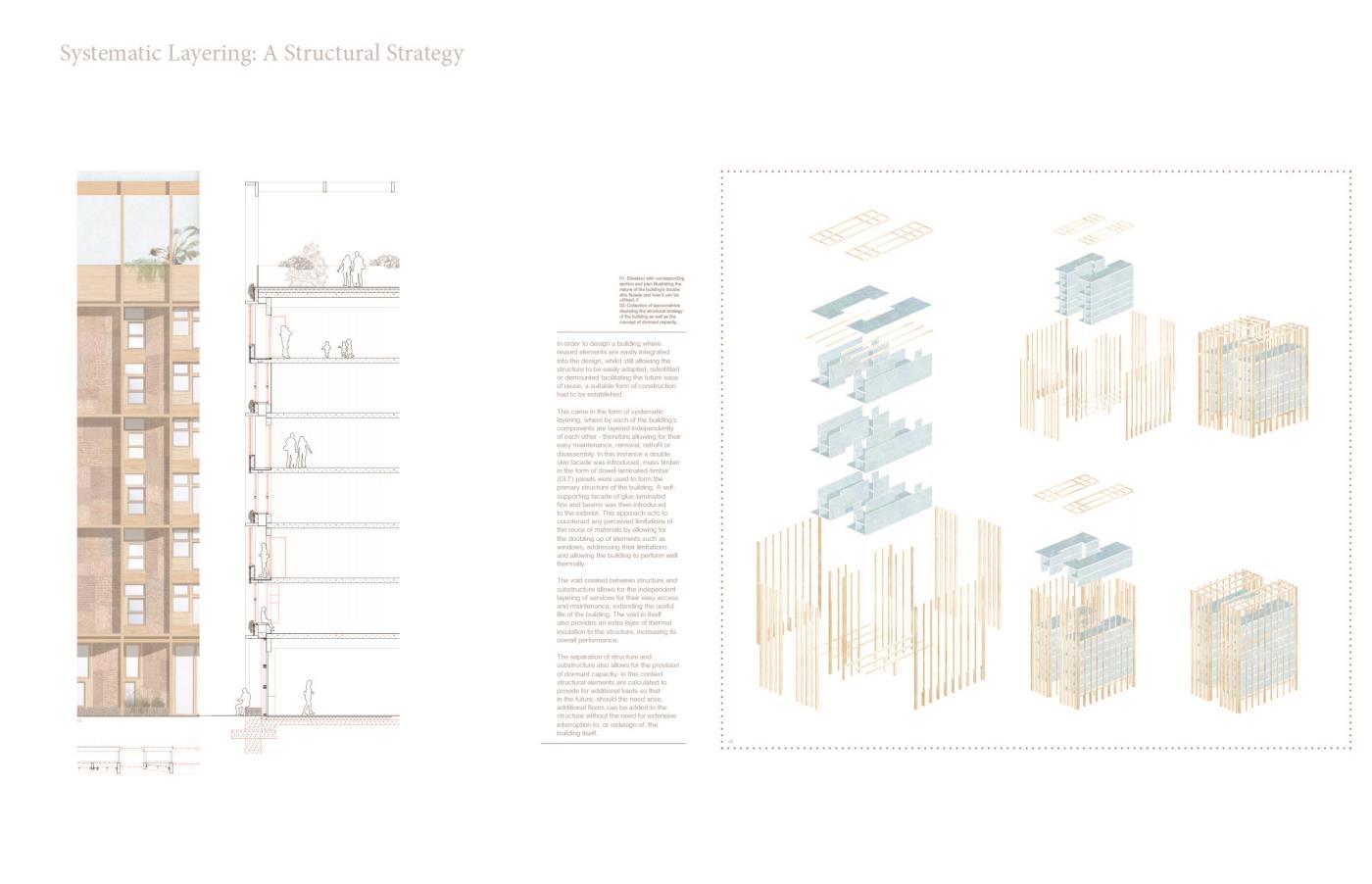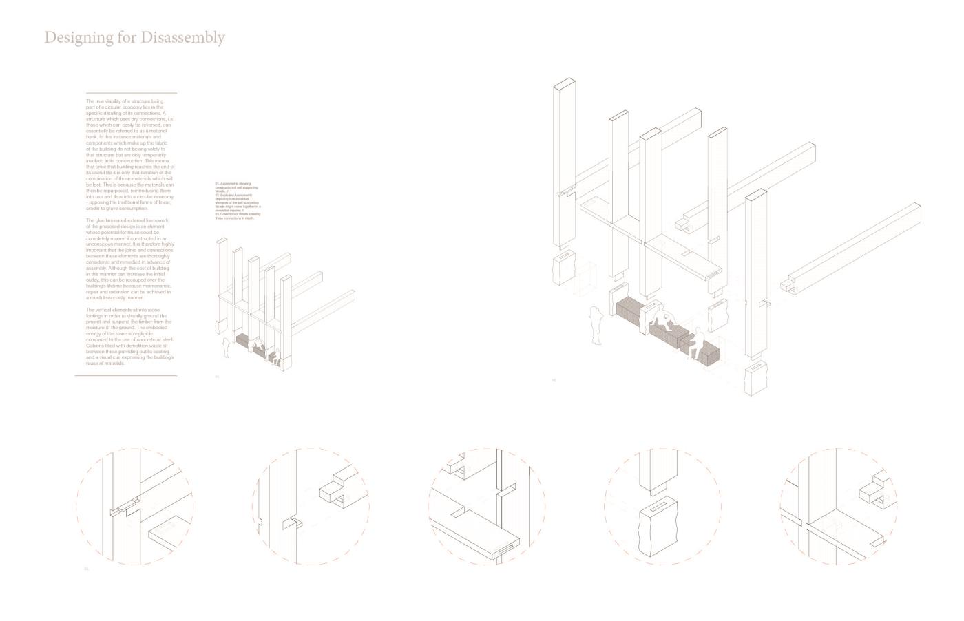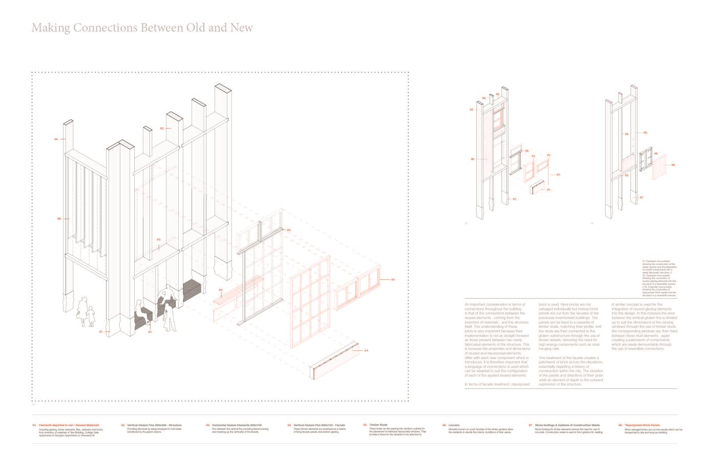 The exploration of this idea begins with the formation of a sample inventory of materials made up of the reusable constituents of structures due for demolition. This then became the basis from which to design a building which would test these ideas of reuse. Supplementing reclaimed elements with low-embodied energy materials such as dowel-laminated-timber (DLT) the resulting structure aimed to be completely carbon-neutral in terms of its construction. Taking this further, the design then takes on the idea of systematic layering in order to embrace concepts of disassembly, flexibility and adaptation in order to extend the useful life of the structure and it’s individual components to whole-heartedly embrace a circular economy.