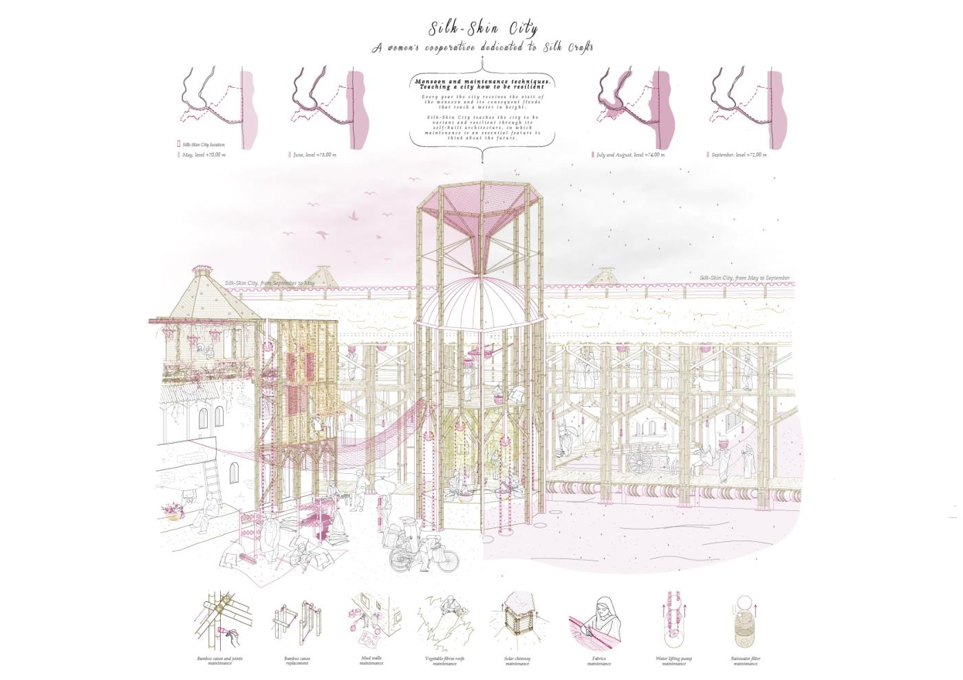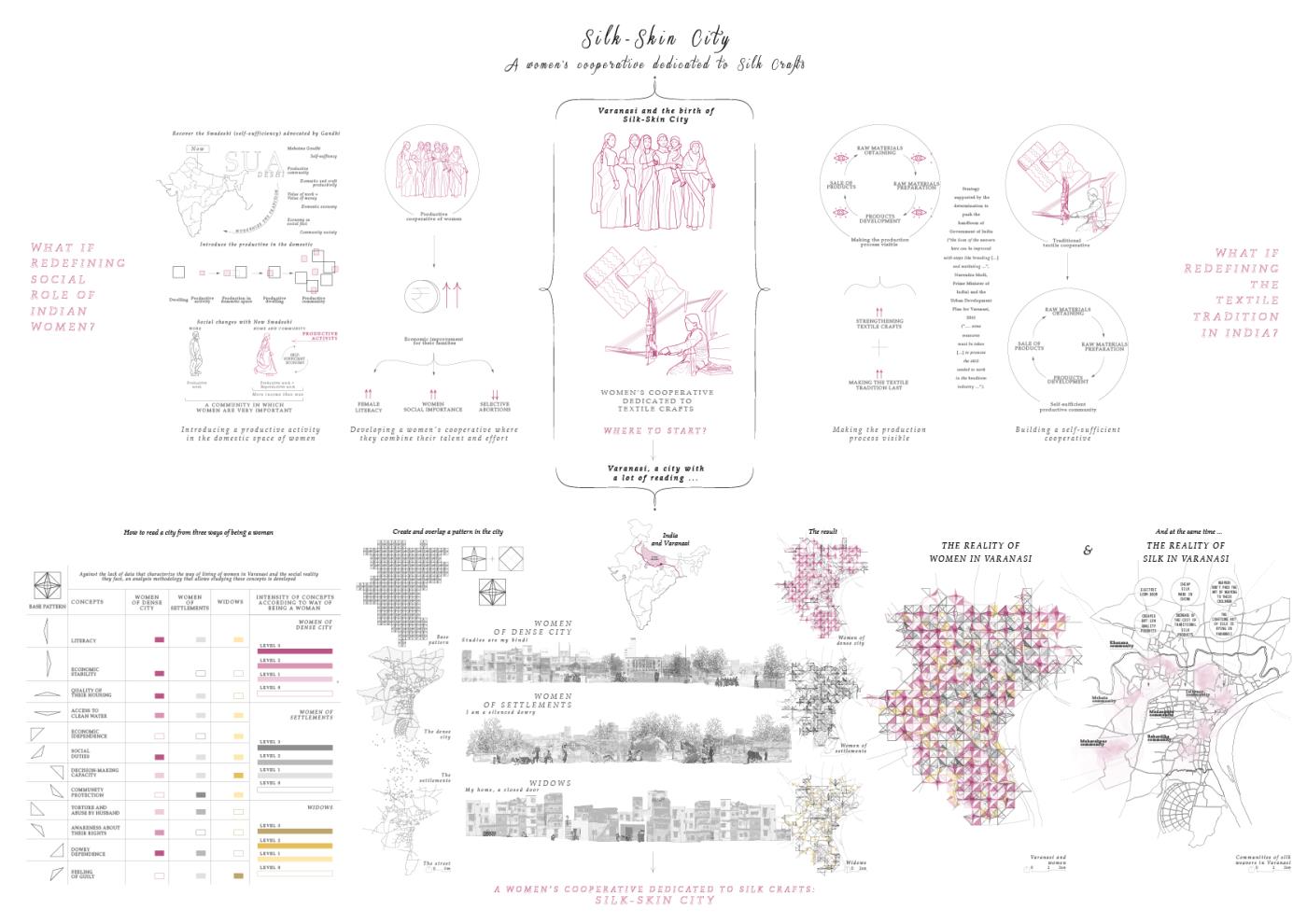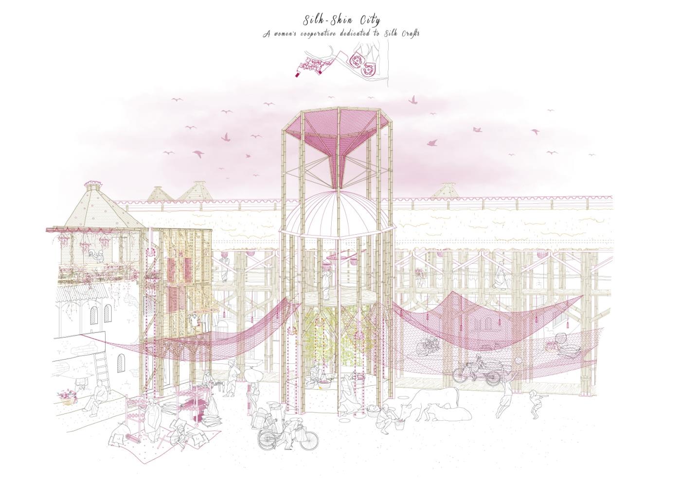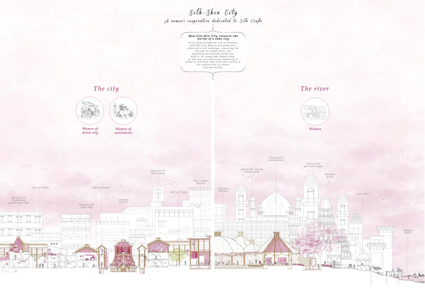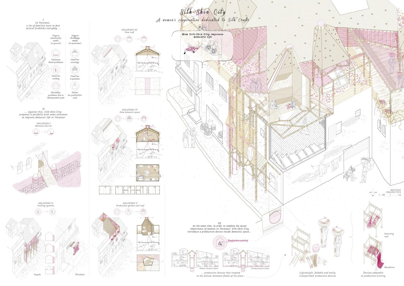 Silk-Skin City: A Women’s Cooperative Dedicated to Silk Crafts Part 2 Project 2020 María Martínez European University of Madrid | Spain Silk-Skin City research shows architecture can redefine the role of Indian women in society. It is presented as a women’s textile cooperative, focused on transforming silkworm into saree, and as a strategy to recover an artisanal treasure. India is defined by deep poverty and social inequality in which girls and women play the most disadvantaged role. This problem is attributed to Neoliberalism, which also meant the growth of industry, and the gradual disappearance of textile tradition. Thus, Silk-Skin City was born in Varanasi, and will assemble all the ways of being women. It is structured in events that define the production process: urban productive events, to revitalize degraded urban voids, and domestic events, that introduce the productive character into the domestic scale through a transportable device and a catalogue of solutions to improve the housing and climatic conditions. And all these connected by urban installations which supply urban needs. The materiality will bet on local and recycled in a constructive process that can be carried out by all women. So, Silk-Skin City draws a new productive, urban and social landscape, while teaching the city to be resilient to the monsoon and to build a healthier, freer and fairer society. Tutor(s) Juan Jose Mateos