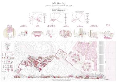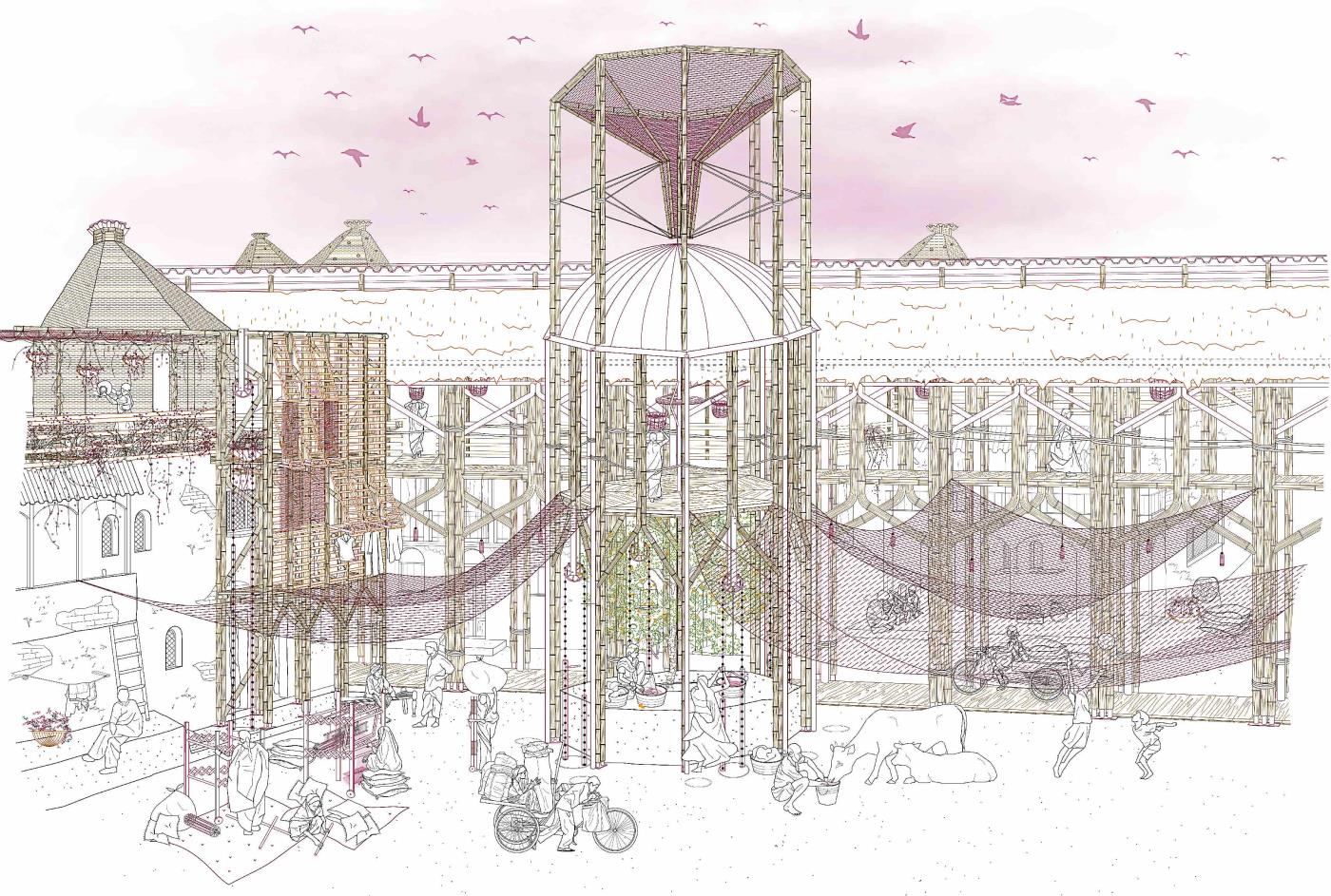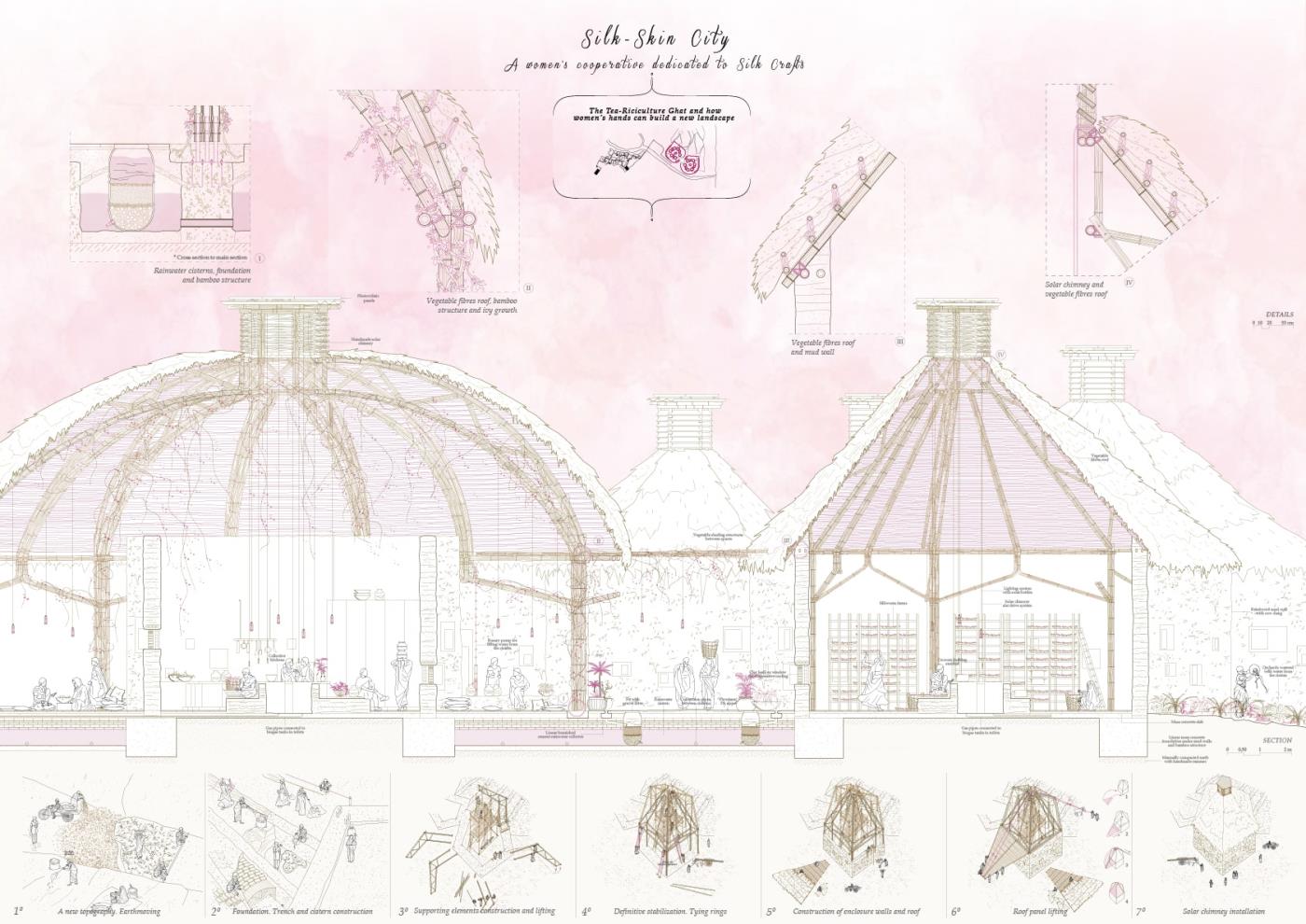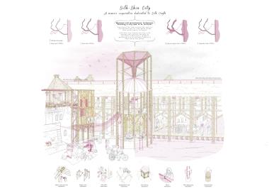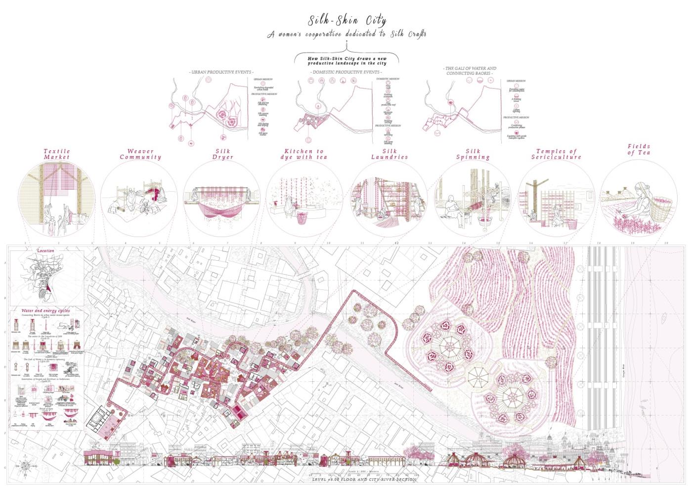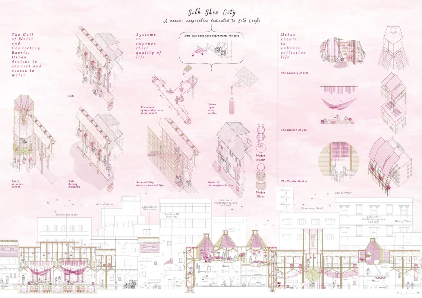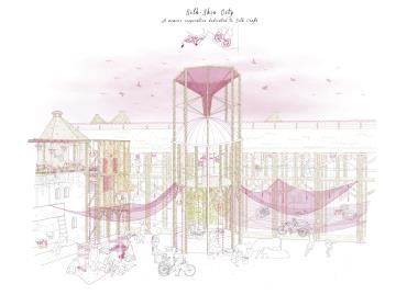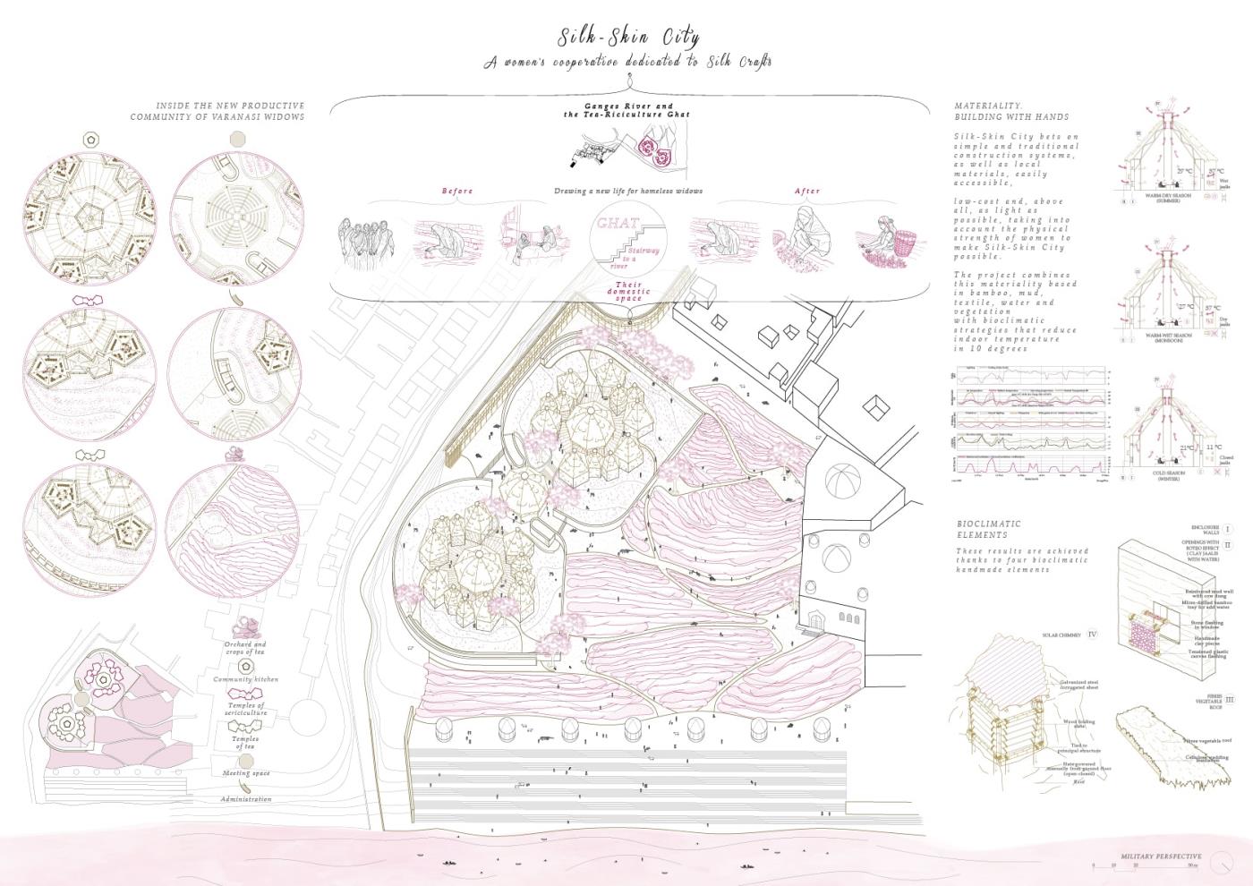 Silk-Skin City: A Women’s Cooperative Dedicated to Silk Crafts Part 2 Project 2020 María Martínez European University of Madrid | Spain Silk-Skin City research shows architecture can redefine the role of Indian women in society. It is presented as a women’s textile cooperative, focused on transforming silkworm into saree, and as a strategy to recover an artisanal treasure. India is defined by deep poverty and social inequality in which girls and women play the most disadvantaged role. This problem is attributed to Neoliberalism, which also meant the growth of industry, and the gradual disappearance of textile tradition. Thus, Silk-Skin City was born in Varanasi, and will assemble all the ways of being women. It is structured in events that define the production process: urban productive events, to revitalize degraded urban voids, and domestic events, that introduce the productive character into the domestic scale through a transportable device and a catalogue of solutions to improve the housing and climatic conditions. And all these connected by urban installations which supply urban needs. The materiality will bet on local and recycled in a constructive process that can be carried out by all women. So, Silk-Skin City draws a new productive, urban and social landscape, while teaching the city to be resilient to the monsoon and to build a healthier, freer and fairer society. Tutor(s) Juan Jose Mateos