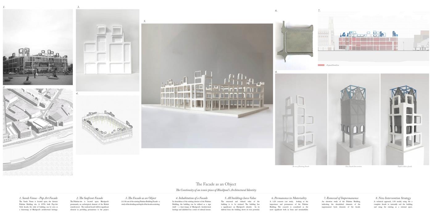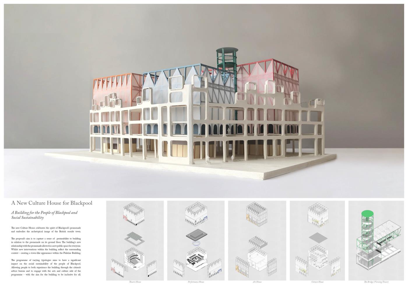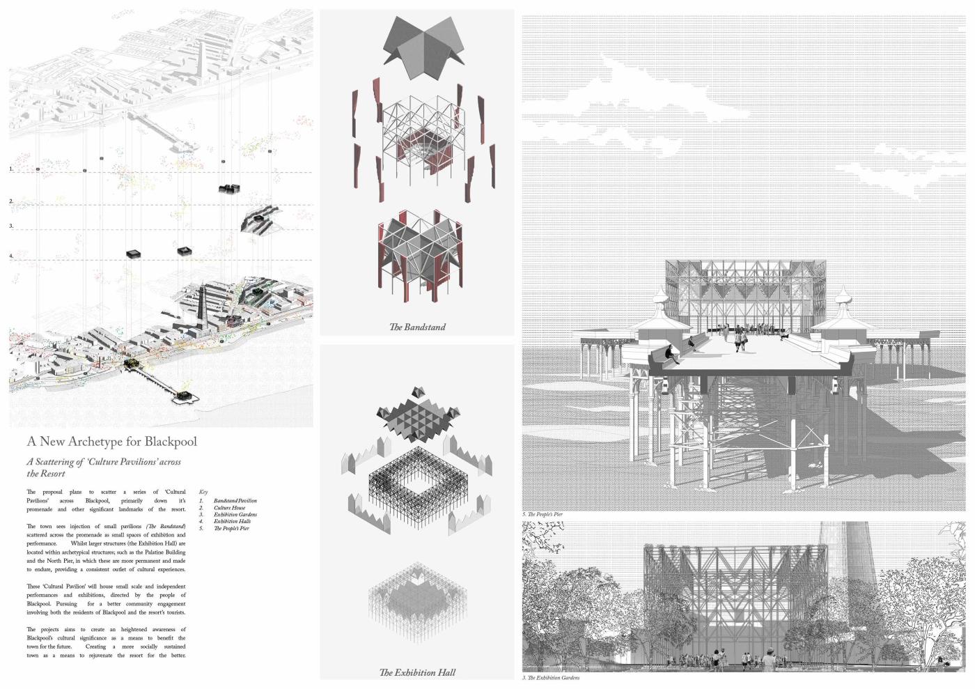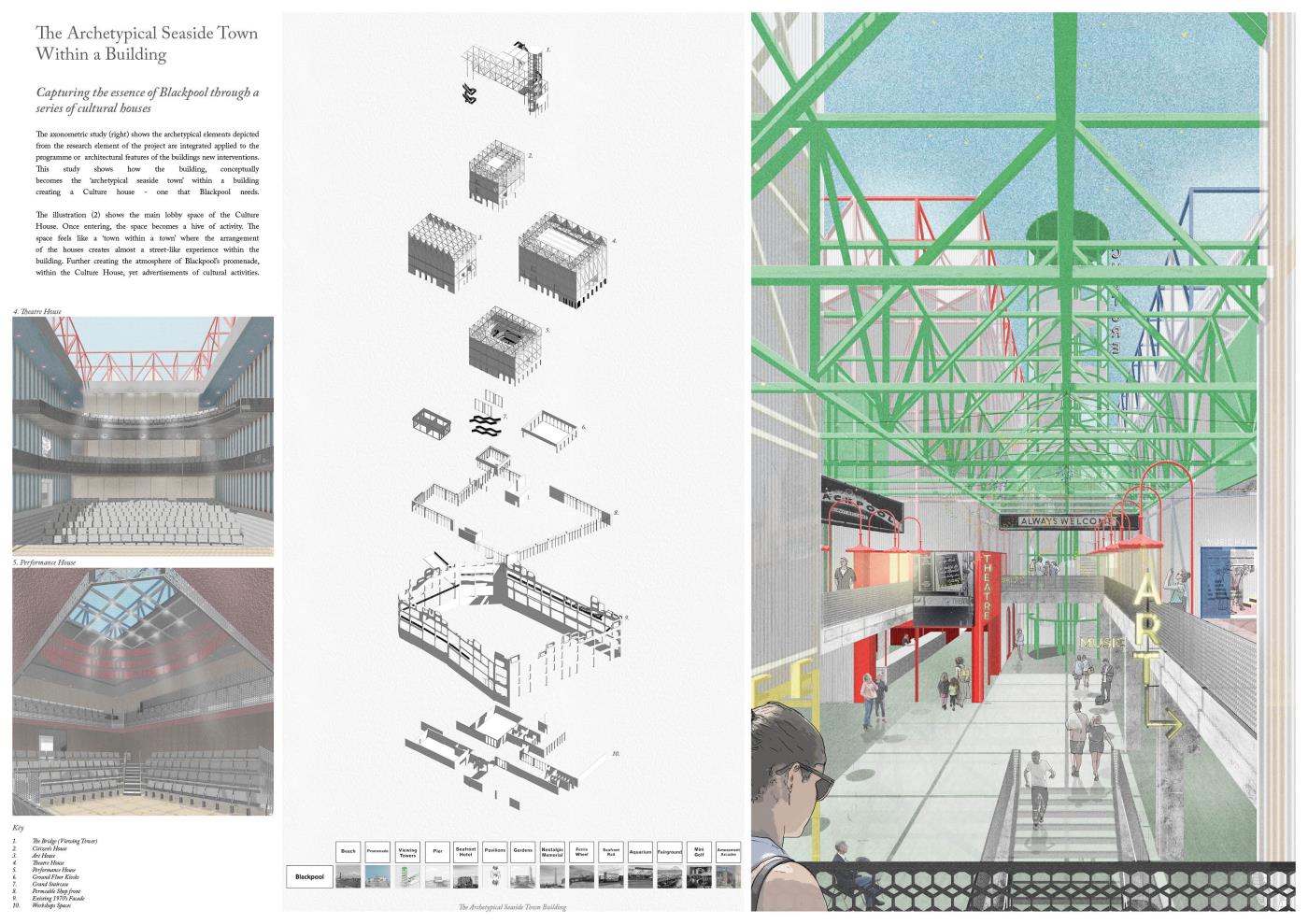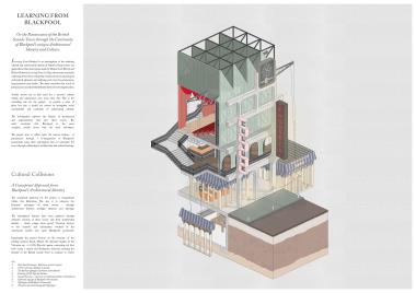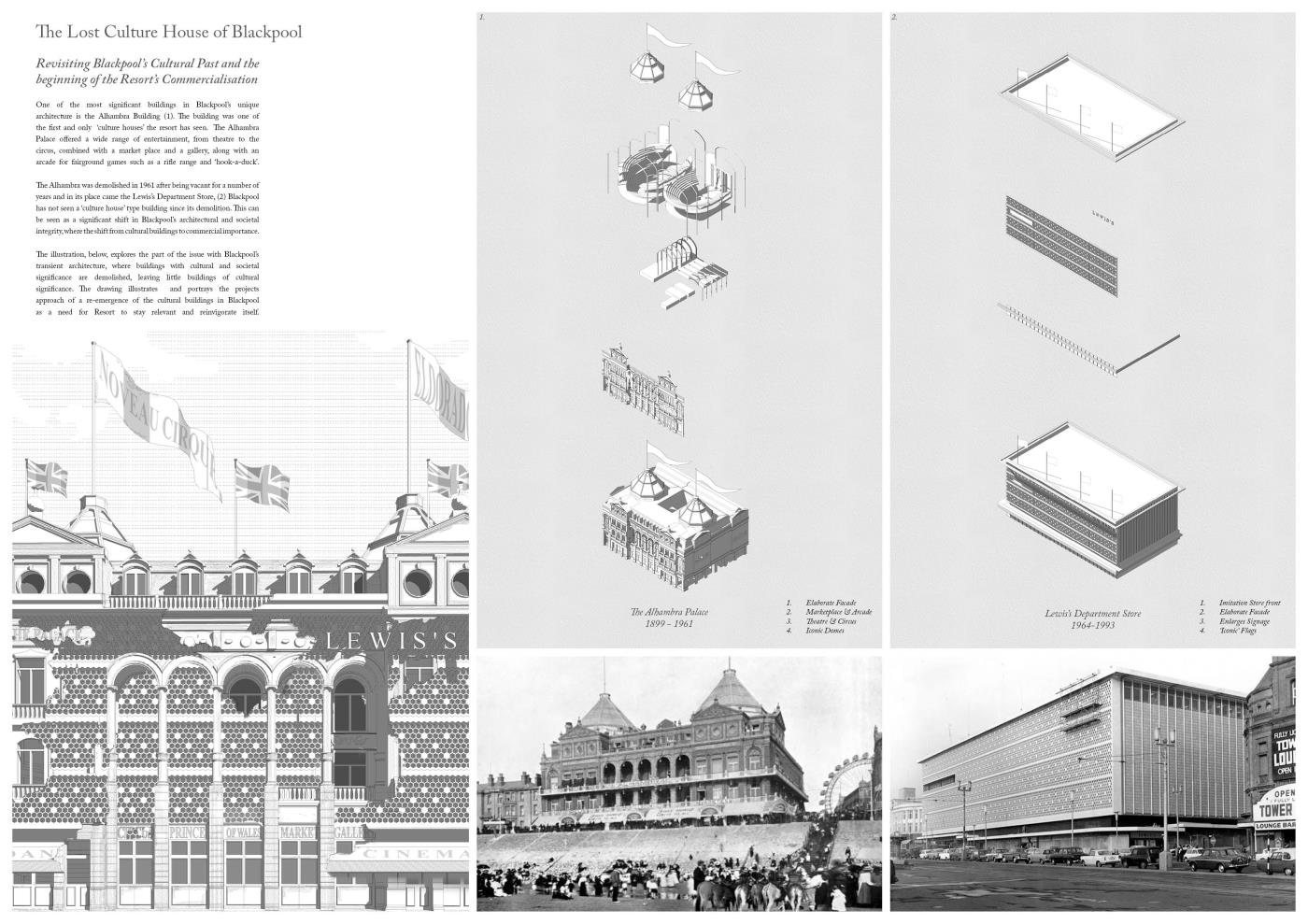 Learning From Blackpool Part 2 Project 2020 Declan Clarke University of Nottingham Nottingham | UK ‘Learning From Blackpool’ is an investigation of the enduring cultural and architectural identity of the British seaside resort. Inspired by observations made in ‘Learning From Las Vegas’, the thesis curated a catalogue of archetypical elements across a selection of seaside resorts, comparatively assessing their significance through permanence, impermanence and vitality. Seaside towns are in dire need of renewed vitality, now more than ever. The thesis directs itself towards Blackpool, a town in social, cultural and architectural decline. Pivotally, finding inspiration in Blackpool’s lost ‘Culture House’ – the Alhambra Palace. The significance of this building is reinterpreted and translated, in both programme and built form, a physical manifestation of a new agenda and movement towards a renewed architectural continuity of Blackpool. The thesis reimagines Blackpool’s promenade through a series of ‘Cultural Houses’ transforming the town, initially through temporary cultural spaces, progressively through three important archetypical sites.With greater focus upon the reuse and adaptation of the Palatine building, an existing 1970s Pop-Art building, connecting the North Pier and former Central Railway Station, proposed as exhibition spaces and gardens. Together the new interventions breathe new life into a tired resort, with the catalyst at the centre - a new Culture House for Blackpool. Tutor(s) Tim Collett Chloe Lockhart
