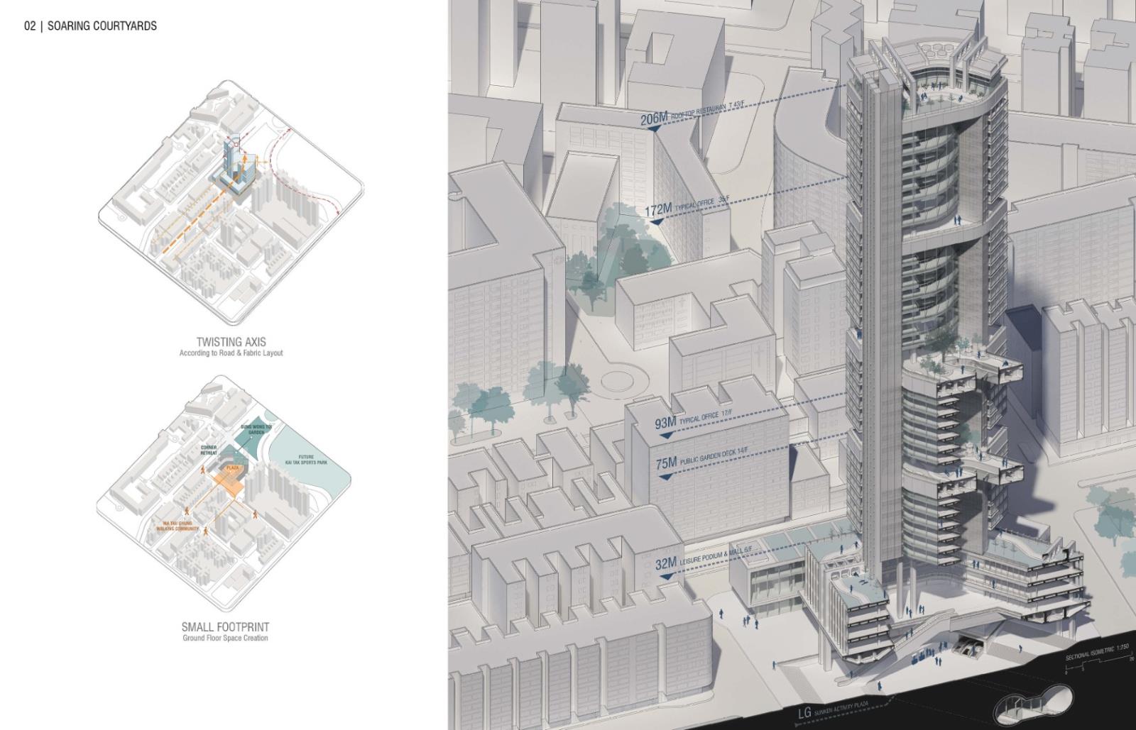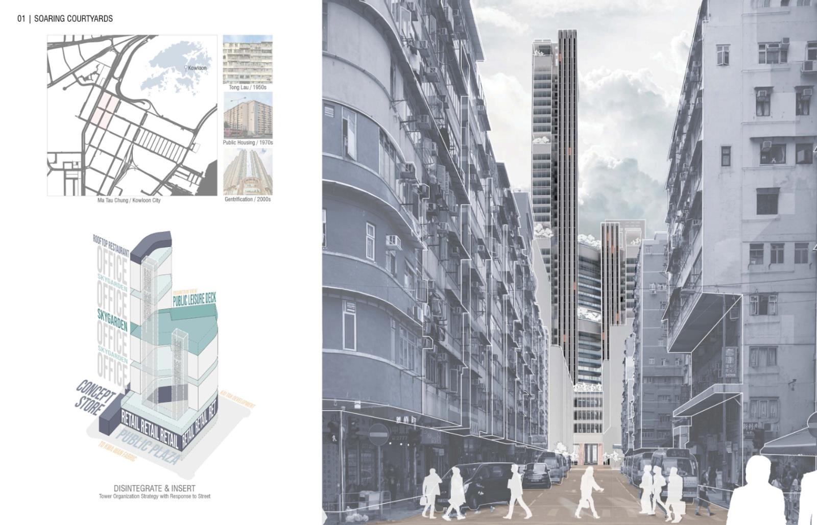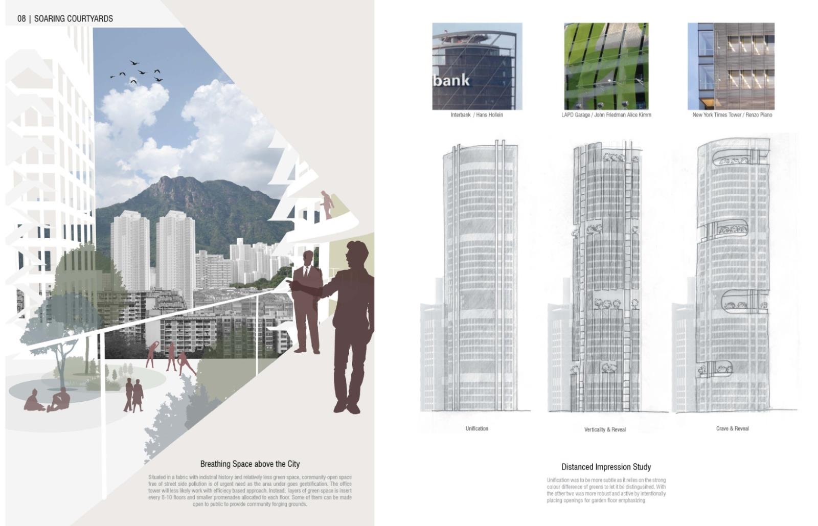Soaring Courtyards Part 1 Project 2021 Ho Yuen Brian Wong Chinese University of Hong Kong | China Sandwiched between old industrial fabric of Ma Tau Chung and a Kai Tak New Town, The proposed office tower is situated at a context of rapid evolving. Given the contrasting nature of the two, Soaring courtyards adopts a extraordinary approach of crafting vertical working space with the operation of disintegrate and insert. Challenging the typical core packed towers, the project tries to split office, services and retail into several smaller entity with green space inserted between them . Porosity is created to facilitate user-surrounding connections as they inhabit and transverse various platforms of green inner community. Besides being green fitted, the space is crafted to be a enjoy quality of sun, wind and a framed view of the Kowloon mountains, attempting to offer a true delight and fresh breathe for workers high up the tower. Tutor(s) Cheng Chung Belinda Law