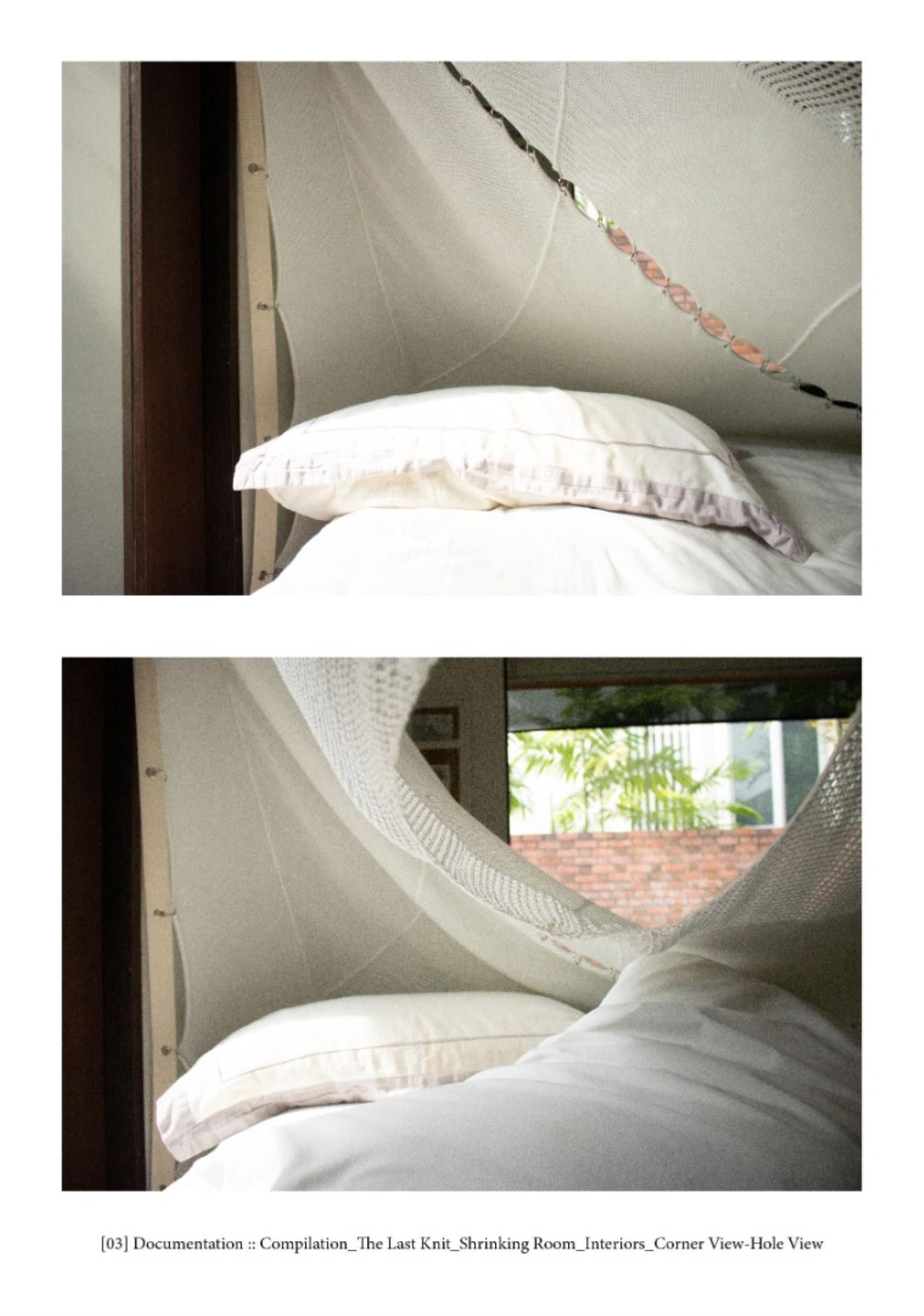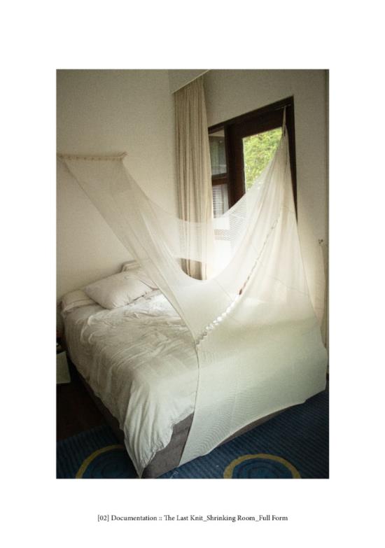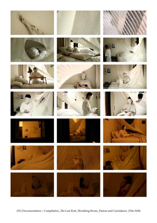 The Cancer Homunculus Part 2 Project 2021 Samuel Tan National University of Singapore | Singapore The Cancer Homunculus interrogates the alienated condition of the chronically ill body, specifically of cancer. Against the traditionally metaphorical instrumentalisation of the body in architecture, this project proposes an alternative model for alienated bodies that treats them literally as a condition concerning their disappearing agency. Internal to the body, cells begin to disobey their biological prerogative. External to the body, it is often innocently expressed in an over-enthusiastic offer of help from family and friends. Spatially, the struggle to claim agency can be thought of as a territorial tussle. Architecturally, the struggle does not limit itself to the traditional boundaries of building, appropriating even spaces of the home as newly contested ground both hostile and alienating.It is at this scale, between body and bedroom, that the project operates as an intervention. Conceived as a set of knitted ‘walls’, the enclosure reclaims the bedroom reconfigured for treatment. These walls act upon and react to the patient, her effect on them perceivable through the warping of the grain and grid of the knit. Ultimately, The Cancer Homunculus rejects architecture’s typical remits of intervention- as-building, insisting that comfort for alienated bodies must be designed like the bodies themselves— at scales slippery and ambiguous. Tutor(s) Ker-Shing Ong