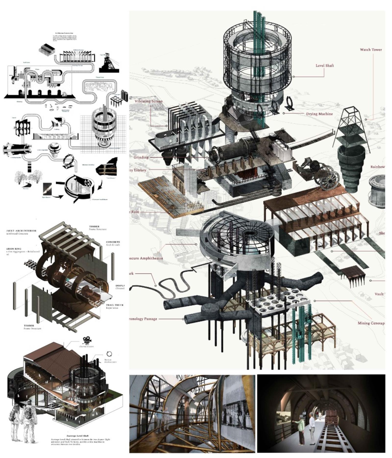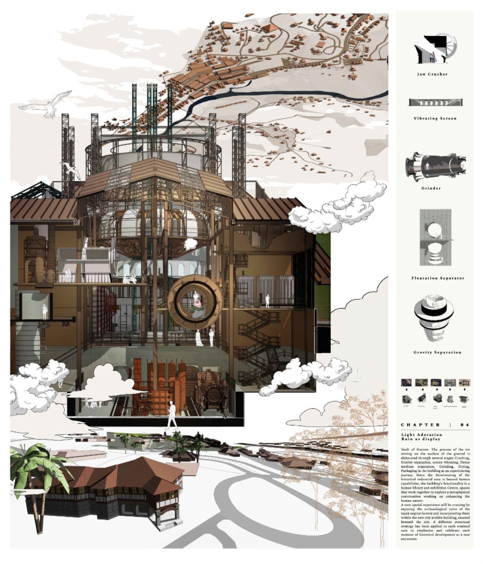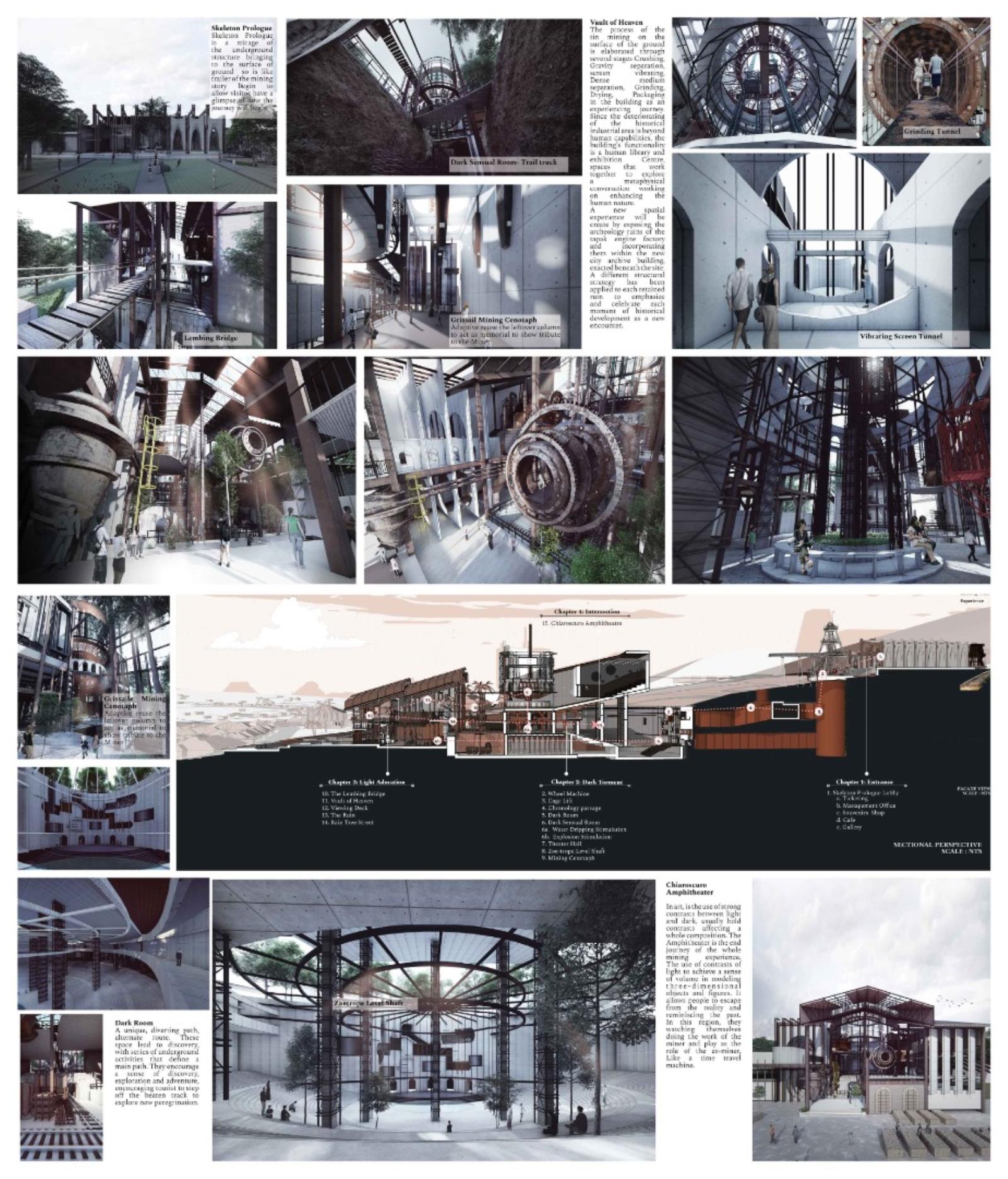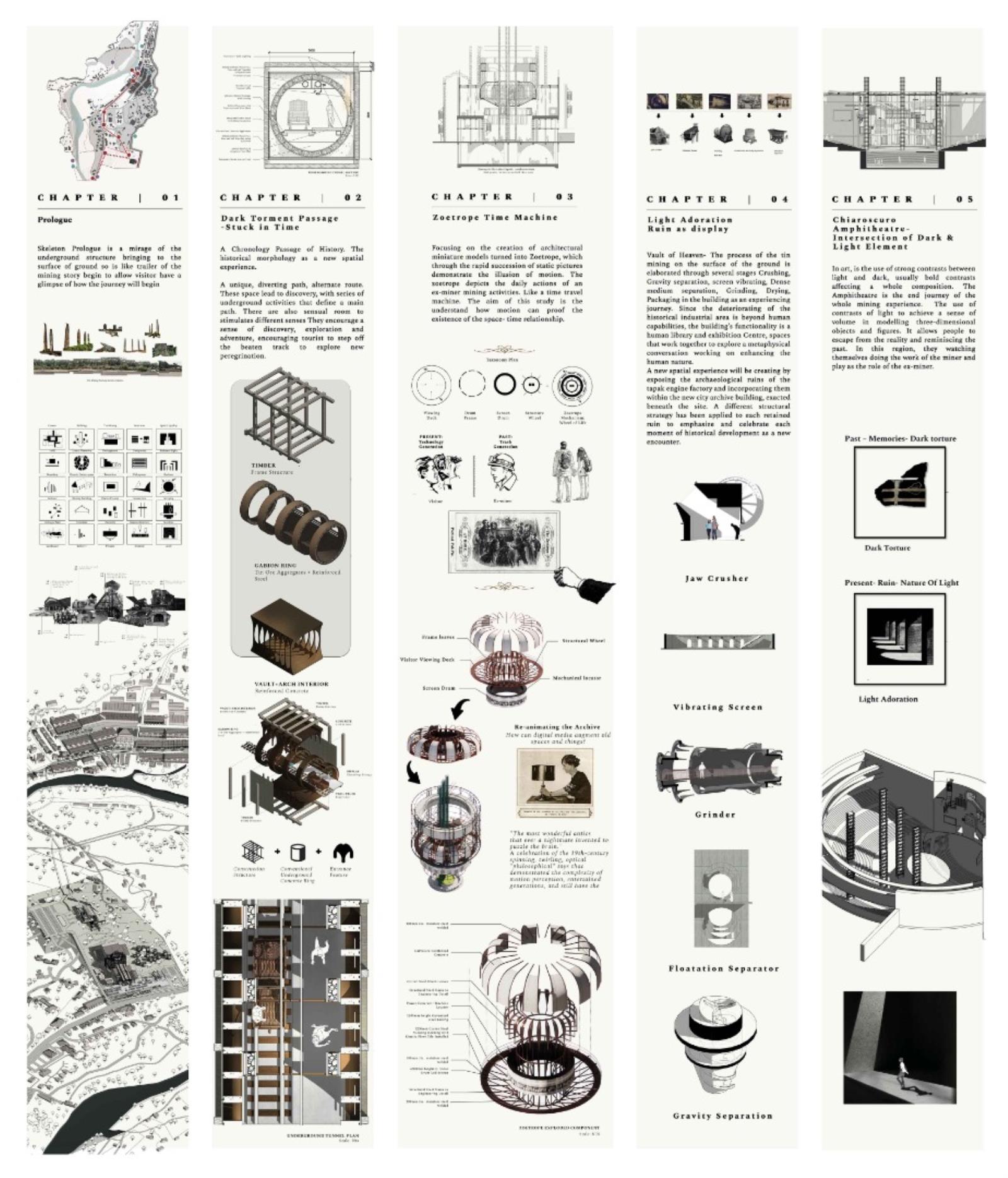 Archive of the Lost Mining City: Revival of Miner's Magnum Opus Part 2 Project 2021 Xue Yee Low University of Malaya | Malaysia In 1985-year, mining crisis struck in the tin mining world. Even though Sungai Lembing retain the second world largest Underground mining, yet the locals suffer the crisis of turning into ghost town. The building and machine in Sungai lembing‘s hill mining structure is slowly buried underground with its chronicles and memories. Hence, this project is to understand the nature of urban artefacts as products of spatial ordering and morphological and attempts to explore possible strategies to preserve and reinterpret underground tin mining as Contemporary Discovery in Sungai Lembing to bridge the past and present. Story Timeline divide into 5 chapters: Chapter 1: Skeleton PrologueChapter 2: Dark Torment Chronology PassageChapter 3: Zoetrope Time MachineChapter 4: Light AdorationChapter 5: Chiaroscuro Amphitheatre (Intersection of Dark & Light Element). The thesis proposes a manifestation of the two dimensions of time as both technology generation and trash generation intersecting: Dark torment (Past) and light adoration (Present), where Zoetrope act media to amalgamate the both timelines. The proposed Tin mining experience centre is shape up and cog nominate into components. It is not a hierarchical architectural experience, but a sequence of urban artefacts littered throughout the terrain, inhabiting idiosyncratic exhibitions of memory in a new geography of curiosity. Tutor(s) Zuraina Leily Awailudin Nik Rahiman Nik Mohd Taib
