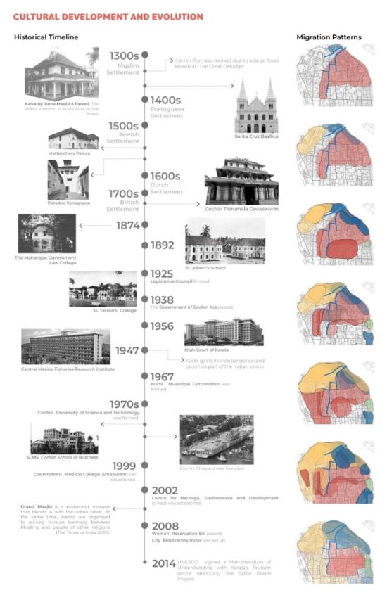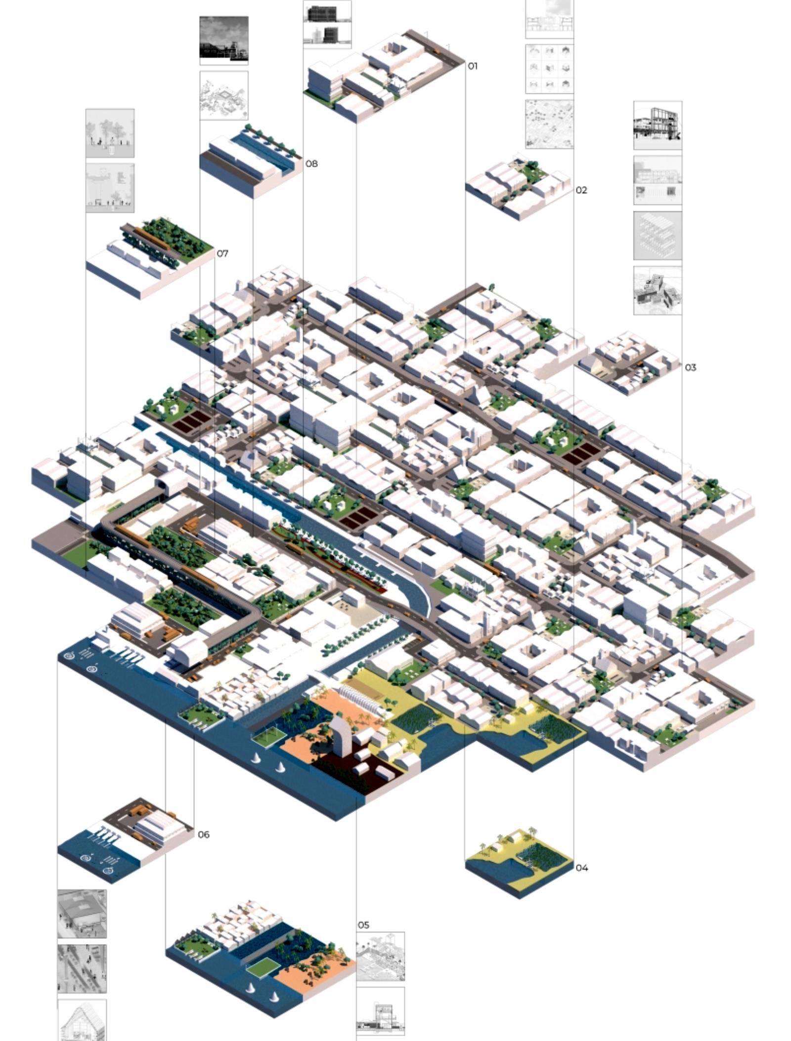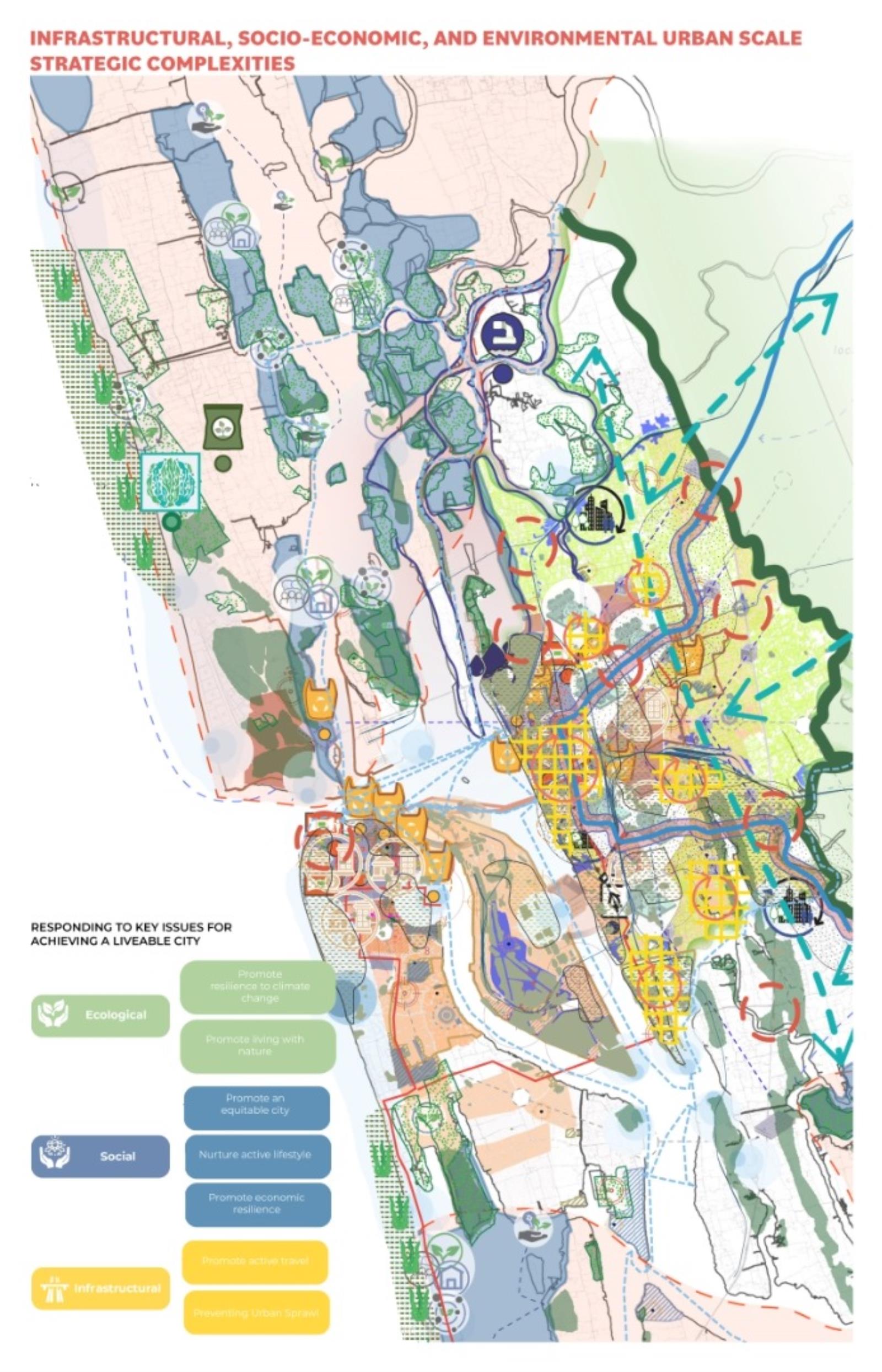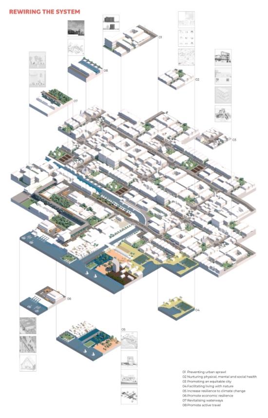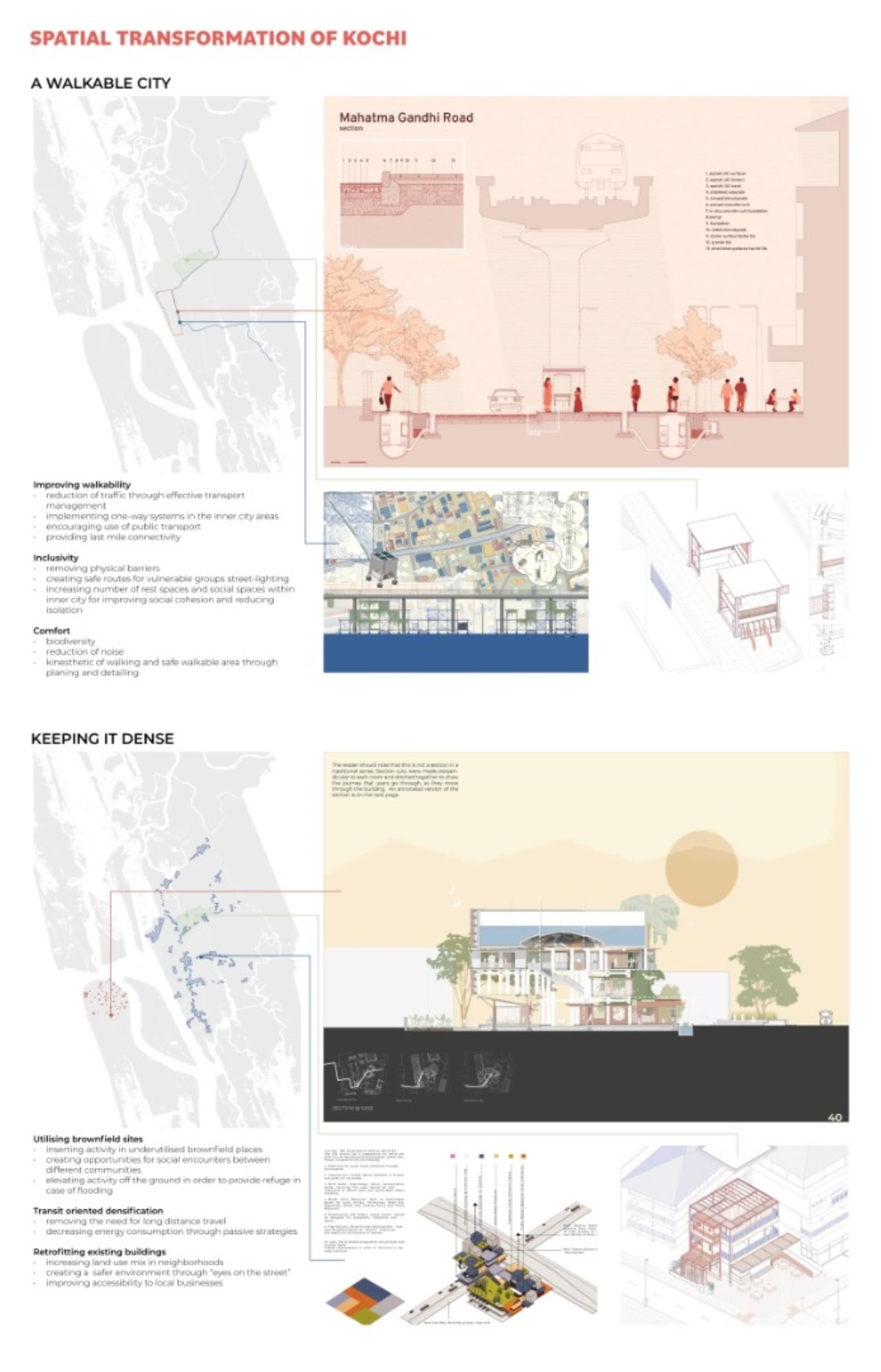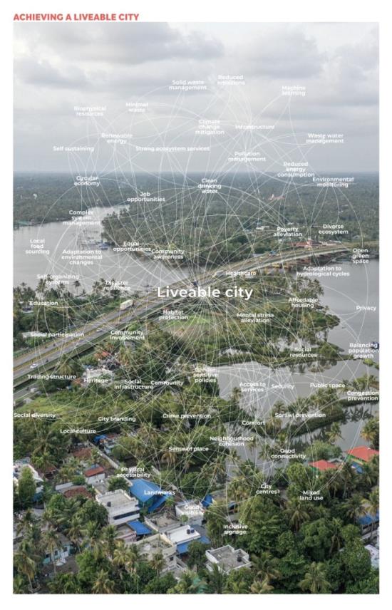 Liveable Urbanism Kochi Part 2 Project 2022 Chelsea WongEleni VlatakiLee ThienAnnabel SumnerHamssini SukumaranOliver ShadWilliam SayersDima SacaClaudia PetreLydia NewmanAna MoldovanSophie MacphersonMeylan Fernandez VillazonJudith-Stefania DeakNur Iman Syafiqah Binti Abdul NasirLaura-Veronique BeaudetPetya AtanasovaAna-Maria Arhire Cardiff University | UK In response to the emerging issues of the rapid urbanisation of Kochi, eight key urban strategies were formulated - tackling issues of: suburbanisation, rise in vehicular traffic, emerging mental and lifestyle illnesses, deteriorating ecology, challenges of climate change with recurring floods, food security, social and gender inequalities.The rapid population growth of Kochi has resulted in urban expansion to floodplains and greenfields which in turn has created social, mobility, ecological and economic challenges. Instead of responding to the problem as a reaction, the studio developed a vision for making Kochi liveable and sustainable.Urban strategies were developed to tackle local issues with global outlook through systems thinking, scientific modelling of complex relationships between the physical form of the city and its social, environmental, economic, and institutional subsystems.Through innovative research methods and tools, the studio developed advanced analysis of complex systems model for social, economic, spatial, and ecological analysis of the city. This was based on the 80 sqkm GIS map created by the studio.The proposition includes developing strategic urban interventions such as public places people and nature, retrofitting neighbourhoods and critical social, economic, and institutional infrastructure to trigger the transformation of Kochi towards a liveable and sustainable city. Tutor(s) Selim Halulu Shibu Raman