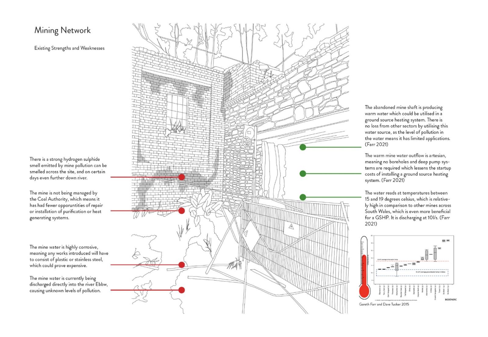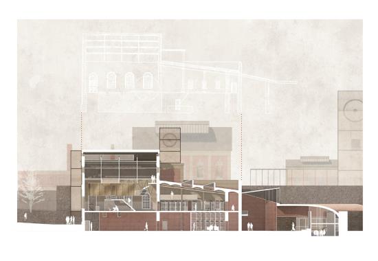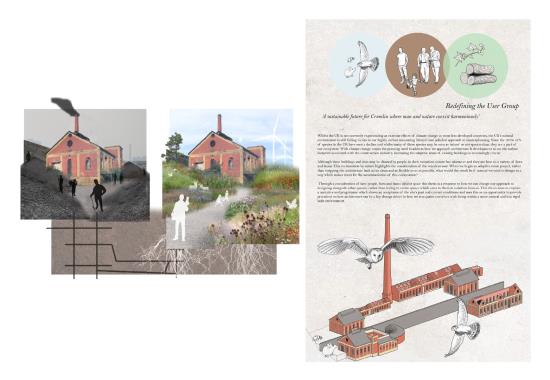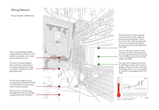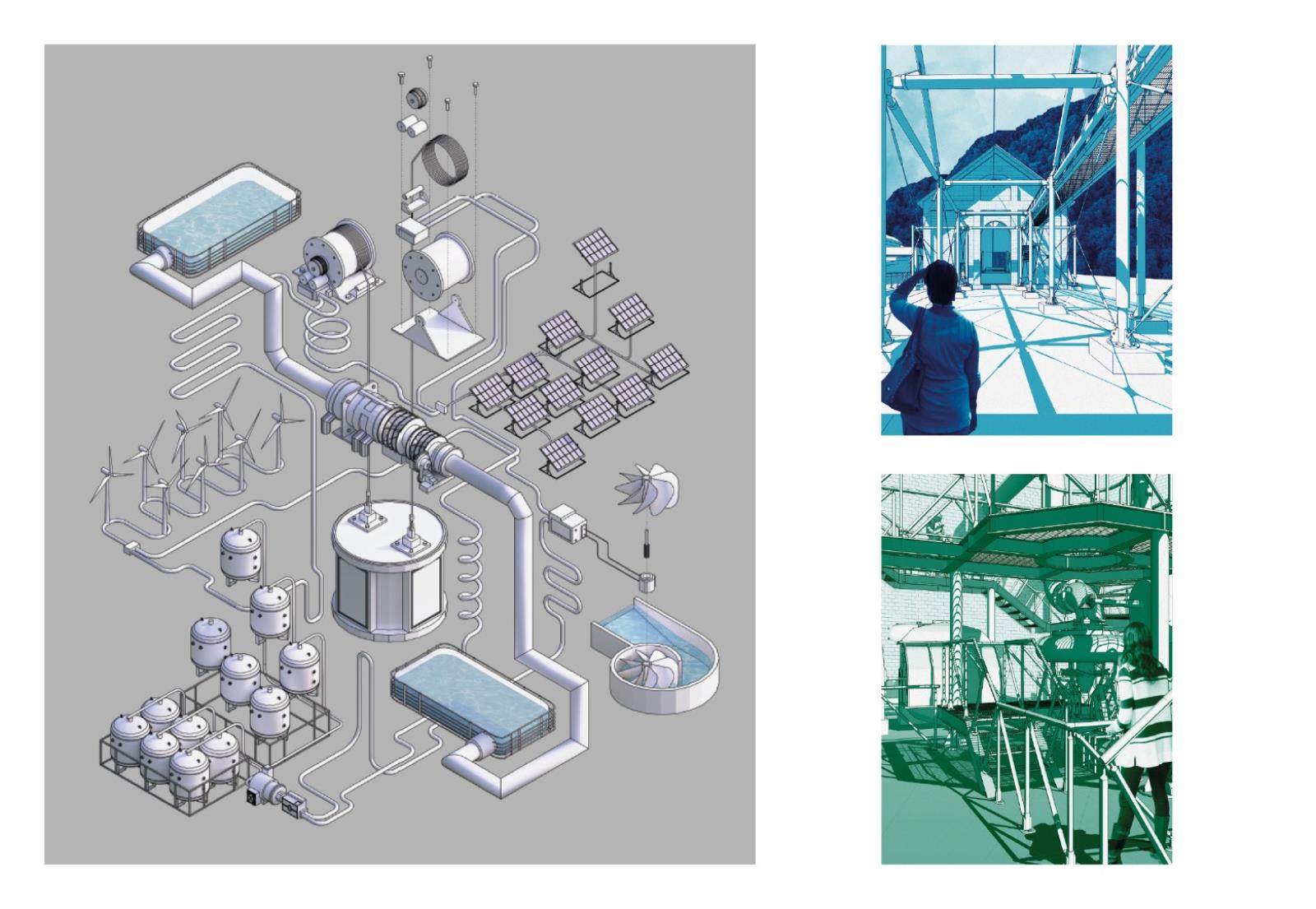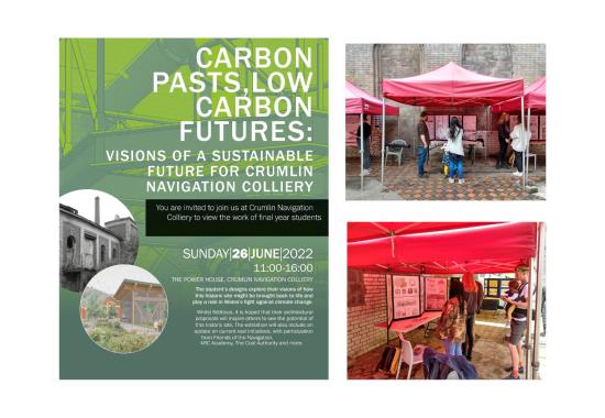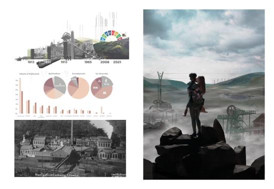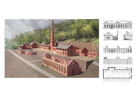 Carbon Pasts, Low Carbon Futures: A Sustainable Future for Crumlin Navigation Colliery Part 2 Project 2022 Valerija SlahovaRowan LuckmanNiamh Rhiannon ThorntonRose NicholsonEmily Rose Chance-HillMadeleine Gabriella RogersAlexander Donald Hossack McCormickJordan Charlie Grady Cardiff University | UK ‘Carbon Pasts, Low Carbon Futures’, focuses on collectively creating a vision for the sustainable future for the best preserved colliery complex in South Wales. Our work consists of a variety of options that have explored innovative and low carbon ideas, within the context of listed buildings provoking an exploration into conservation philosophies and promoting adaptive reuse.Student projects, by their nature, are always at the risk of being removed from reality. The real-life brief, collaborative working, along with the site visits and interaction with the local community, has afforded such a rewarding and impactful thesis project, culminating in a public exhibition on site.The chance to exhibit our work in the context of the site was extremely inspiring. Being able to engage with the residents of Crumlin and the local council within this post-industrial landscape helped to create a wonderful visual and contextual link to our proposed alternatives for a low carbon future, that address the climate emergency. It has been an exciting challenge that has created proposals that are both collaborative contextually and yet independent to each student’s interests. It is hoped that these can provide inspiration for both the local community and the wider Valleys Region. Tutor(s) Christopher James Whitman