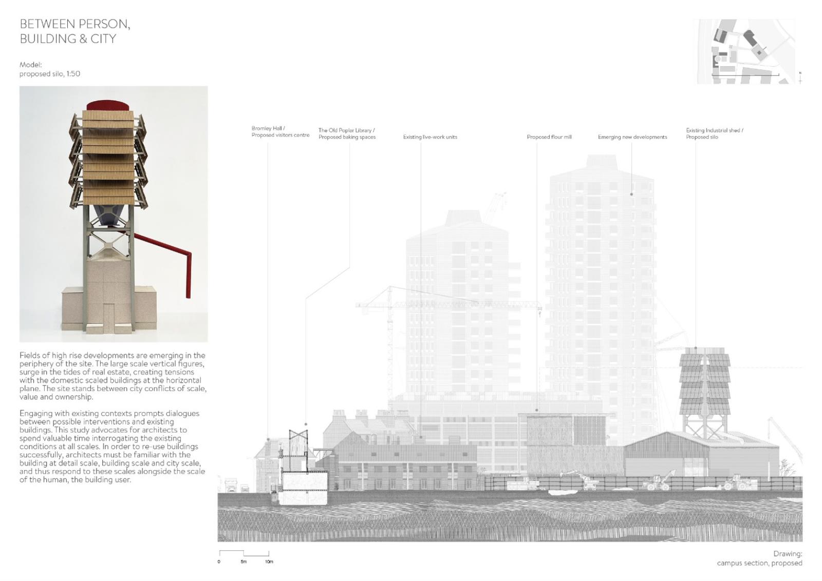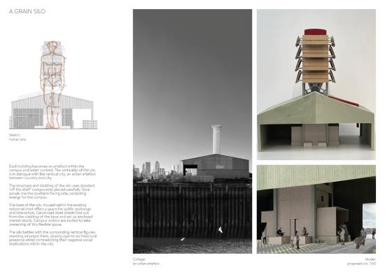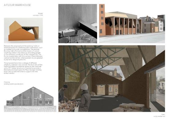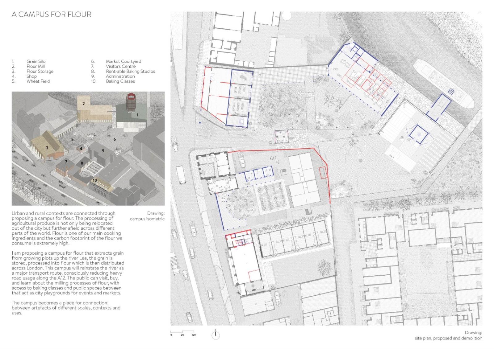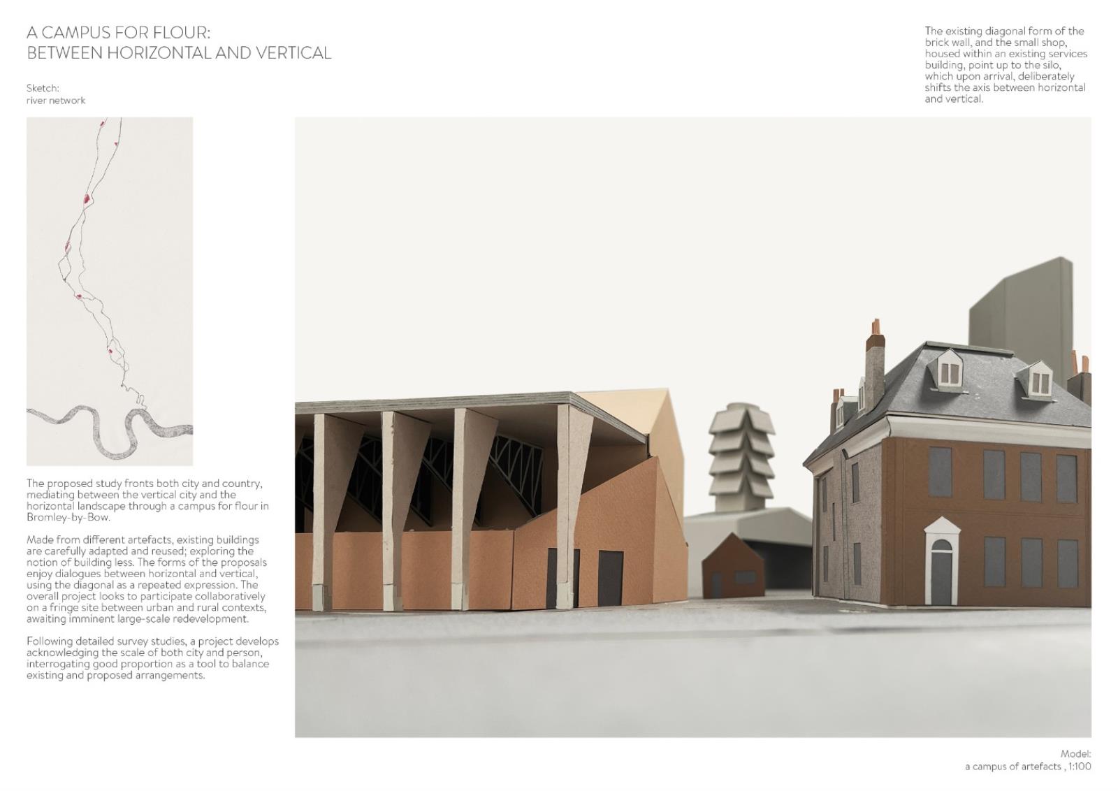 A Campus for Flour: Between horizontal and vertical Part 2 Project 2022 Oliver Philip Reynolds London Metropolitan University | UK The proposed study mediates between the vertical city and horizontal landscape through a campus for flour in Bromley-by-Bow.Made from different artefacts, existing buildings are carefully adapted and reused; exploring the notion of building less. The forms of the proposals enjoy dialogues between horizontal and vertical, using the diagonal as a repeated expression. The overall project looks to participate collaboratively on a fringe site between urban and rural contexts, awaiting imminent large-scale redevelopment.Flour is a main cooking ingredient and its process and production are being relocated further from the consumer, meaning its carbon footprint is extremely high. The campus extracts grain from growing plots up the river Lea, reinstating the river as a main transport route and reducing heavy road usage. Grains are stored, processed into flour and distributed across London. The public can visit, buy and learn about flour milling processes, with access to baking classes and spaces between, acting as city playgrounds for events and markets. The campus becomes a place for connection; between artefacts of different scales and contexts.Following detailed survey studies, a project develops acknowledging the scale of both city and person, interrogating good proportion as a tool to balance existing and proposed arrangements. Tutor(s) Paolo Emilio Pisano Takero Shimazaki Karabo Turner
