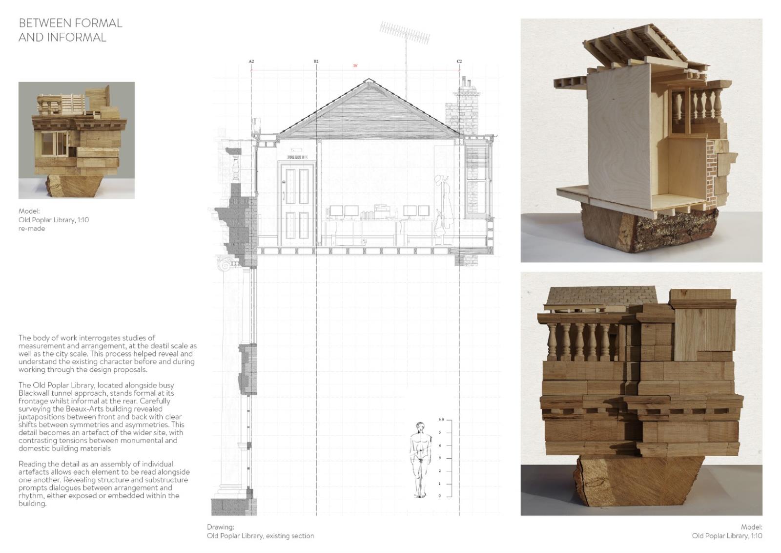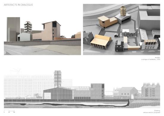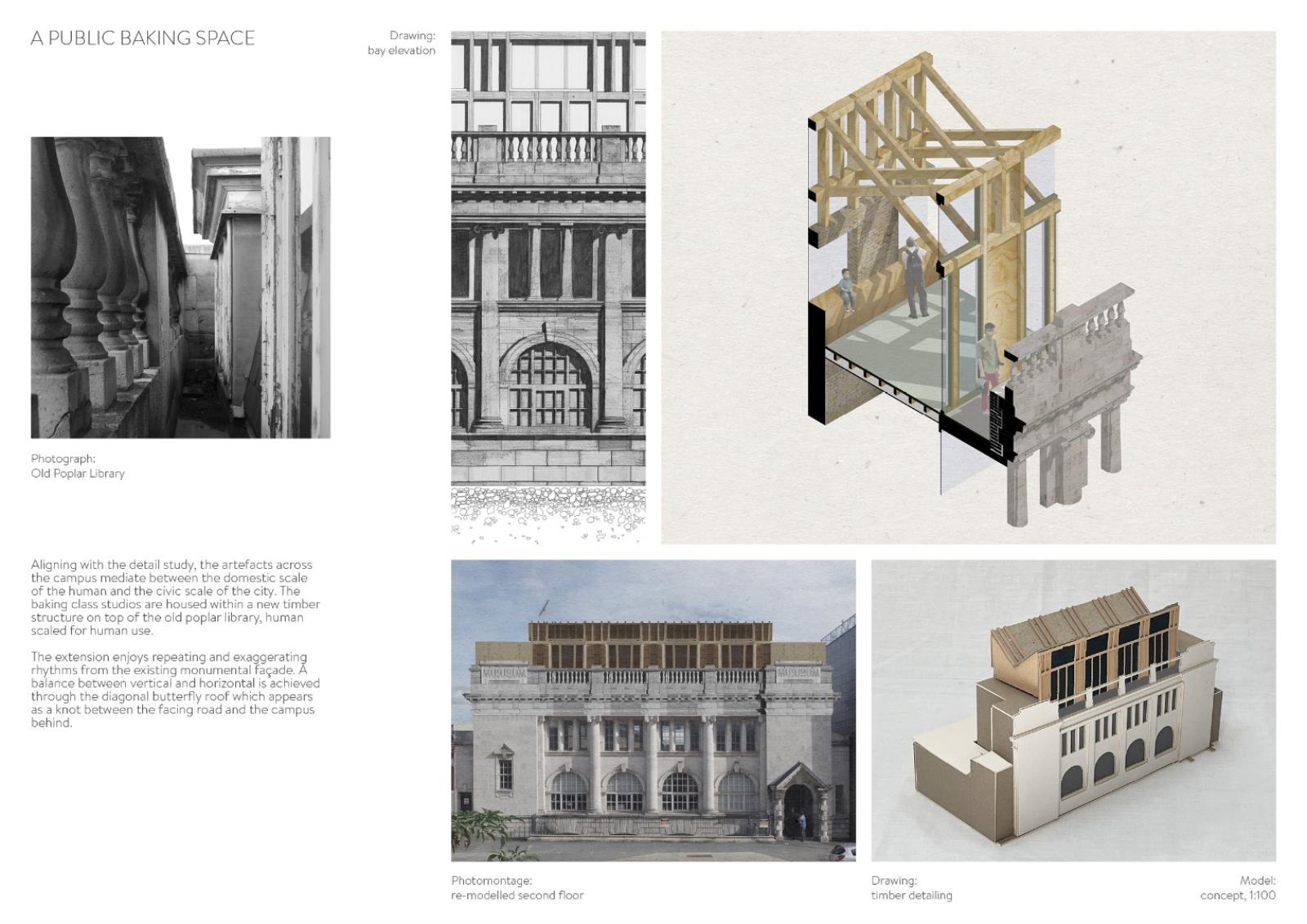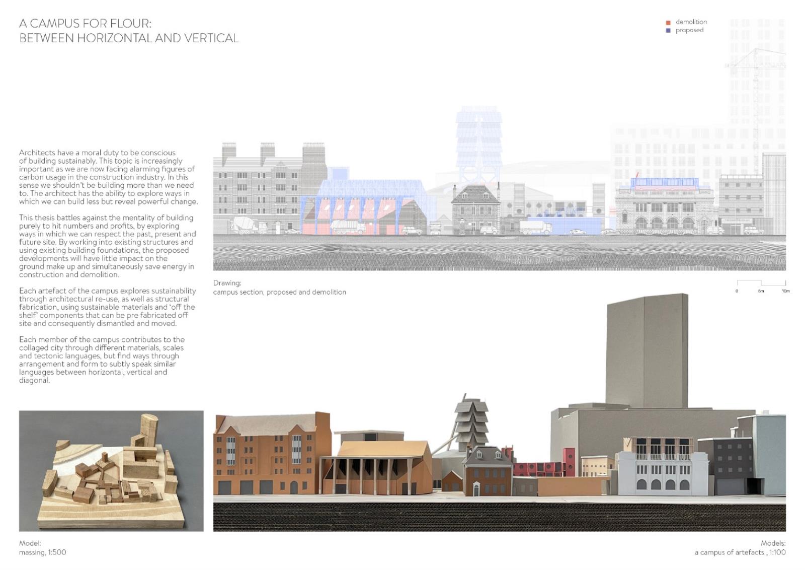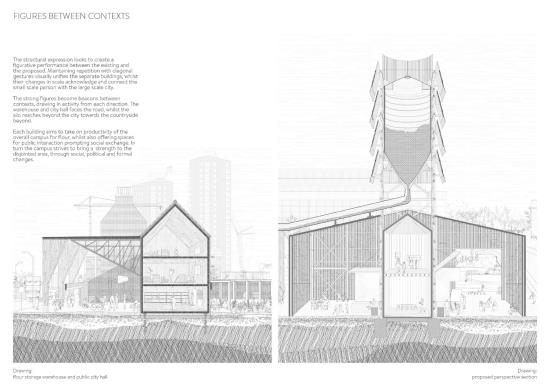 A Campus for Flour: Between horizontal and vertical Part 2 Project 2022 Oliver Philip Reynolds London Metropolitan University | UK The proposed study mediates between the vertical city and horizontal landscape through a campus for flour in Bromley-by-Bow.Made from different artefacts, existing buildings are carefully adapted and reused; exploring the notion of building less. The forms of the proposals enjoy dialogues between horizontal and vertical, using the diagonal as a repeated expression. The overall project looks to participate collaboratively on a fringe site between urban and rural contexts, awaiting imminent large-scale redevelopment.Flour is a main cooking ingredient and its process and production are being relocated further from the consumer, meaning its carbon footprint is extremely high. The campus extracts grain from growing plots up the river Lea, reinstating the river as a main transport route and reducing heavy road usage. Grains are stored, processed into flour and distributed across London. The public can visit, buy and learn about flour milling processes, with access to baking classes and spaces between, acting as city playgrounds for events and markets. The campus becomes a place for connection; between artefacts of different scales and contexts.Following detailed survey studies, a project develops acknowledging the scale of both city and person, interrogating good proportion as a tool to balance existing and proposed arrangements. Tutor(s) Paolo Emilio Pisano Takero Shimazaki Karabo Turner