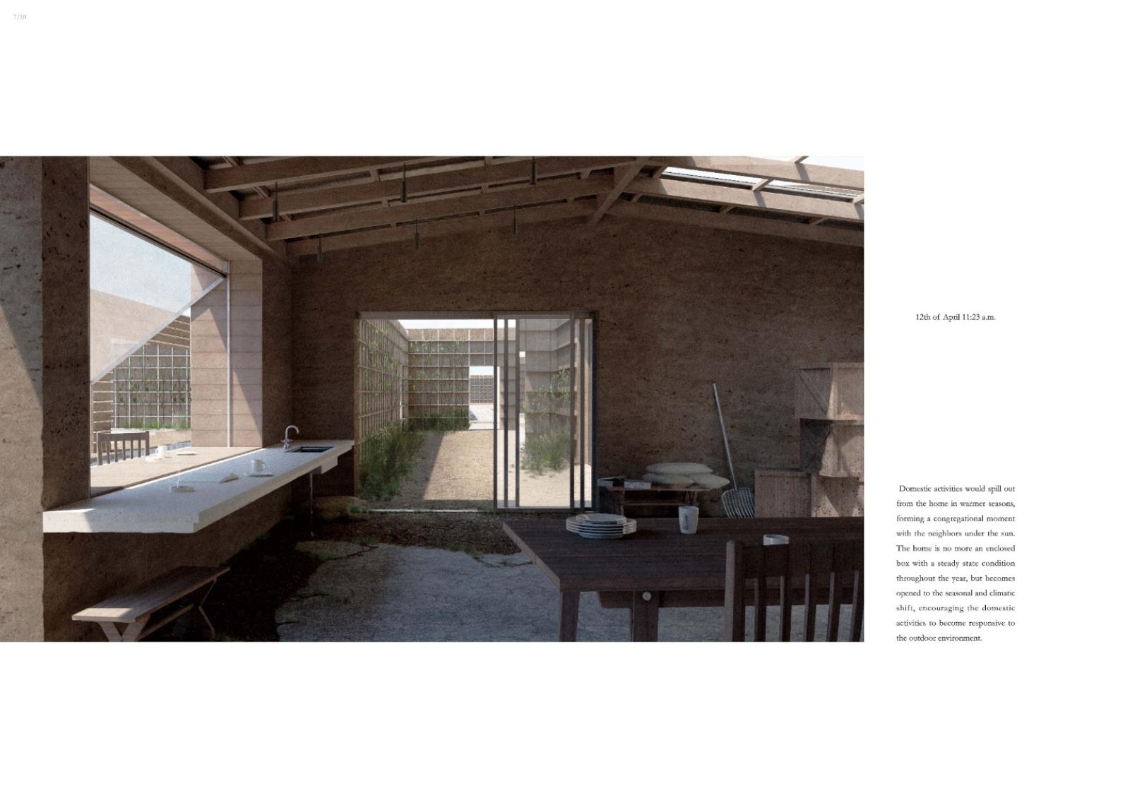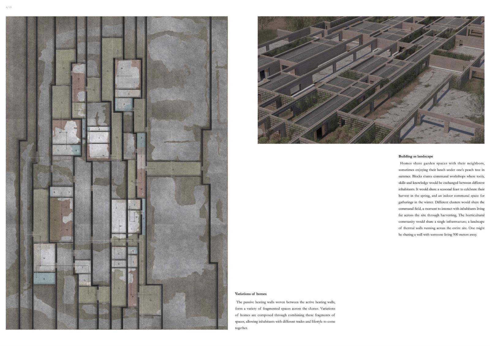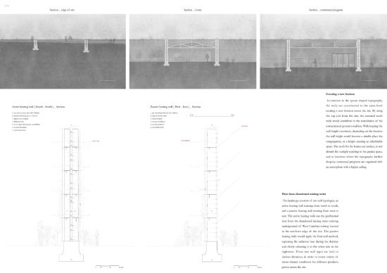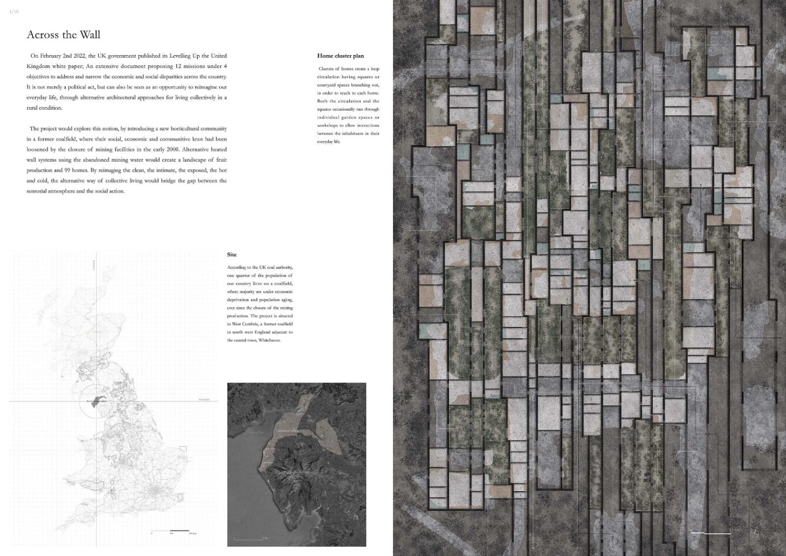 Across the Wall Part 2 Project 2022 Tetsuya Saito Architectural Association London | UK On February 2nd 2022, the UK government published its Levelling Up the United Kingdom white paper; An extensive document proposing 12 missions under 4 objectives to address and narrow the economic and social disparities across the country. It is not merely a political act, but can also be seen as an opportunity to reimagine our everyday life, through alternative architectural approaches for living collectively in a rural condition.The project would explore this notion, by introducing a new horticultural community in a former coalfield, where their social, economic and communitive knot had been loosened by the closure of mining facilities in the early 2000. Alternative heated wall systems using the abandoned mining water would create a landscape of fruit production and 99 homes. By reimaging the clean, the intimate, the exposed, the hot and cold, the alternative way of collective living would bridge the gap between the sensorial atmosphere and the social action. Tutor(s) Lawrence Barth Lucy Styles