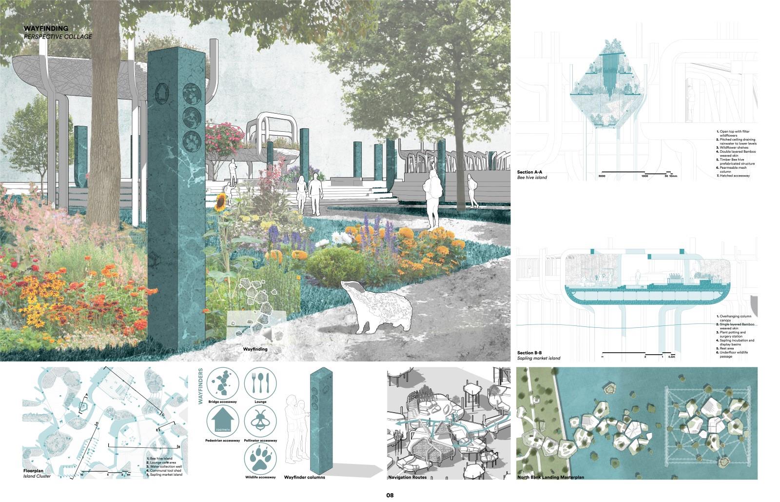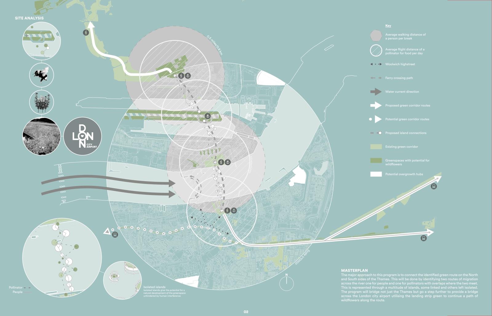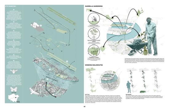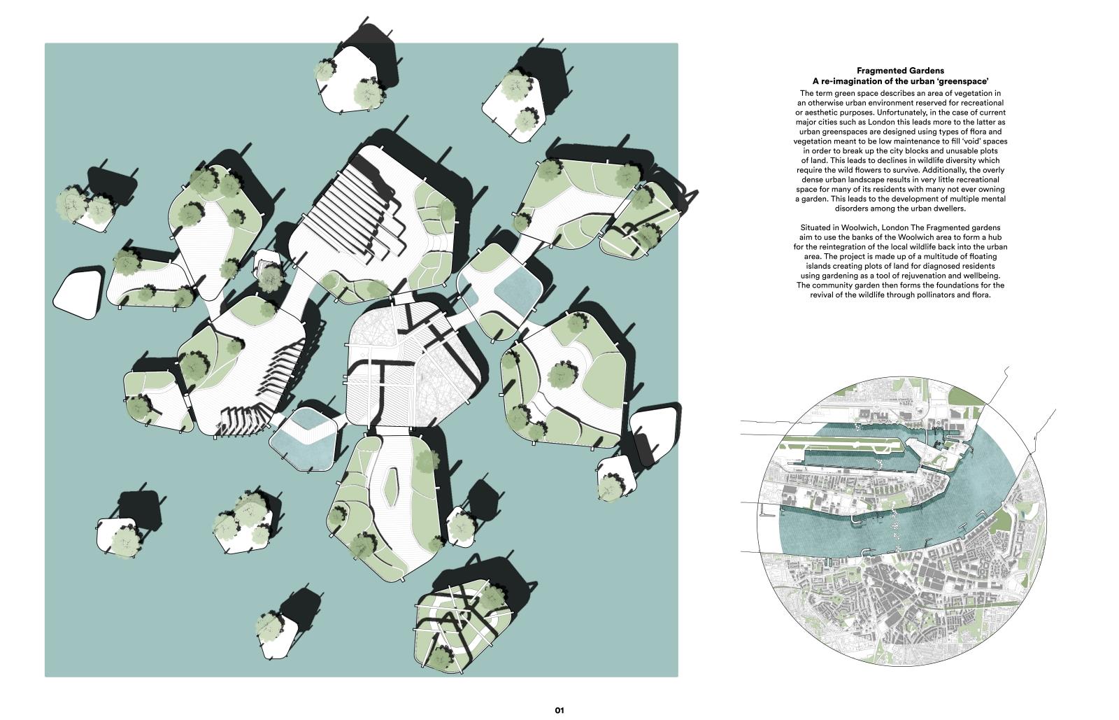 Fragmented Gardens: A Re-imagination of the Urban 'Greenspace' Part 2 Project 2022 Ethan Joseph Burley University for the Creative Arts | UK The term green space describes an area of vegetation in an otherwise urban environment reserved for recreational or aesthetic purposes. Unfortunately, in the case of current major cities such as London this leads more to the latter as urban greenspaces are designed using types of flora and vegetation meant to be low maintenance to fill ‘void’ spaces in order to break up the city blocks and unusable plots of land. This leads to declines in wildlife diversity which require the wild flowers to survive. Additionally, the overly dense urban landscape results in very little recreational space for many of its residents with many not ever owning a garden. This leads to the development of multiple mental disorders among the urban dwellers.Situated in Woolwich, London, The Fragmented Gardens aim to use the banks of the Woolwich area to form a hub for the reintegration of the local wildlife back into the urban area. The project is made up of a multitude of floating islands creating plots of land for diagnosed residents using gardening as a tool of rejuvenation and wellbeing. The community garden then forms the foundations for the revival of the wildlife through pollinators and flora. Tutor(s) Adam Hiles Carla Novak
