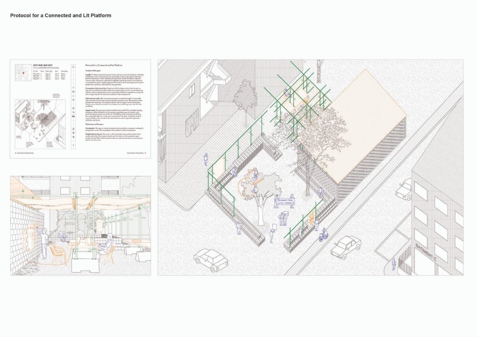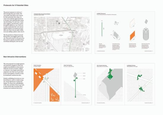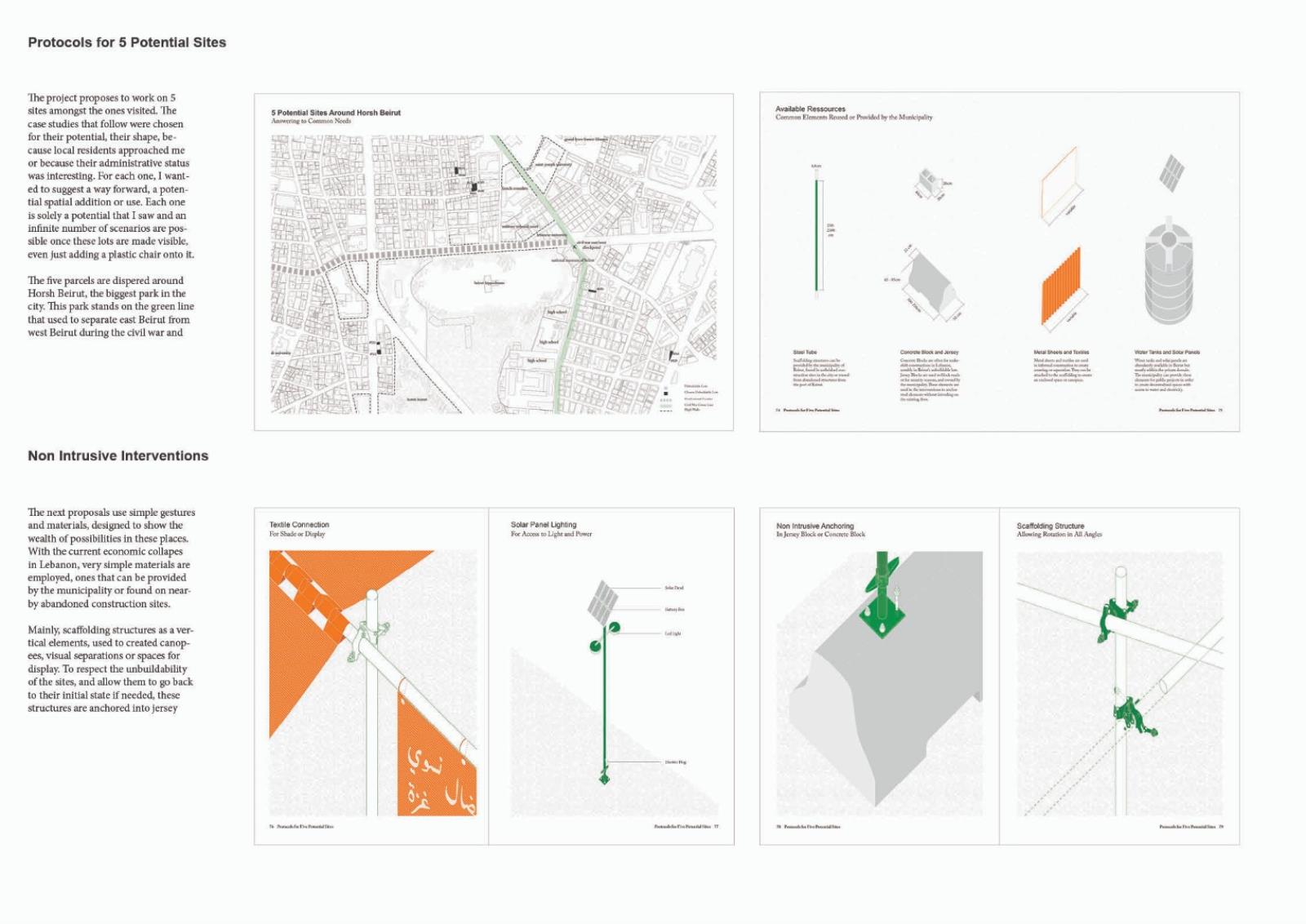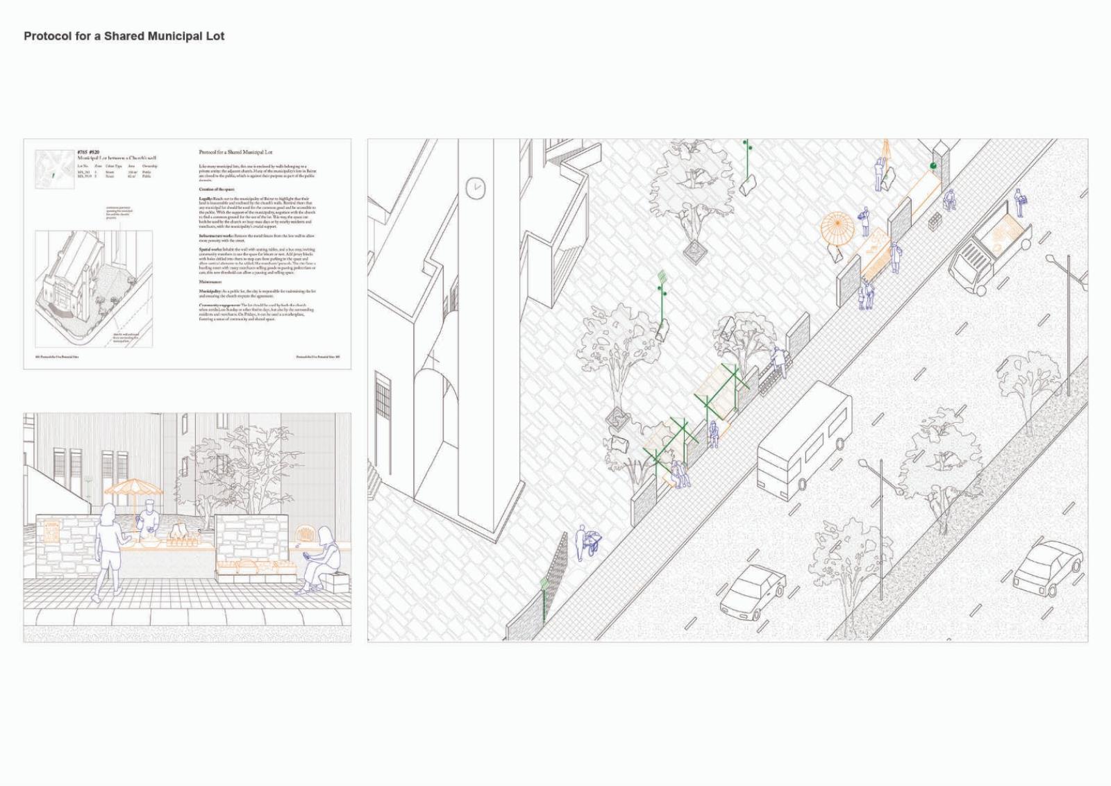 Paired with material, legal, and logistical tactics, a non-exhaustive atlas of spaces is created as a toolkit for Beirut's dwellers to reclaim agency as actors of their built environment. Different insertions meander around the unbuildability of the sites, leveraging existing elements and resources through non-invasive structures. By retrieving and making visible vacant and municipal land, they answer the need for common civic spaces. Navigating sectarian geographies and the intricacies of infrastructures and real estate, the designs become secular and mundane structures of daily life. Dwellers negotiate to find space for alternative collective narratives on the fringes of sectarian planning.