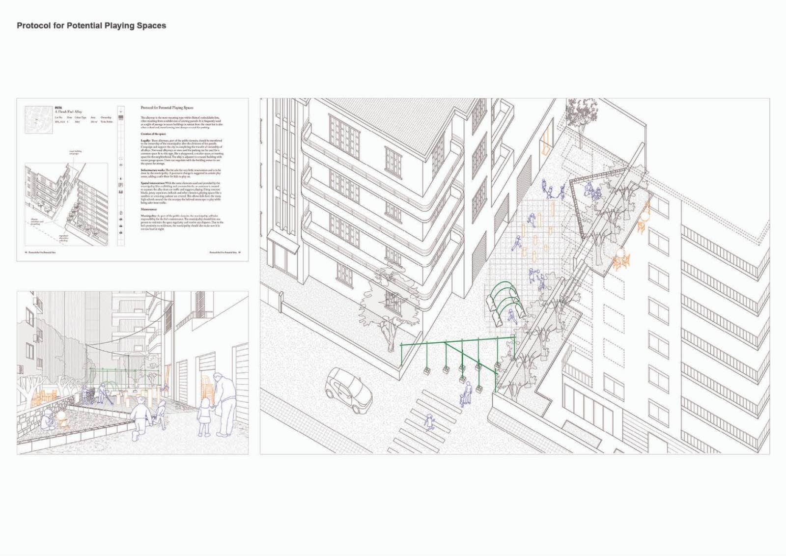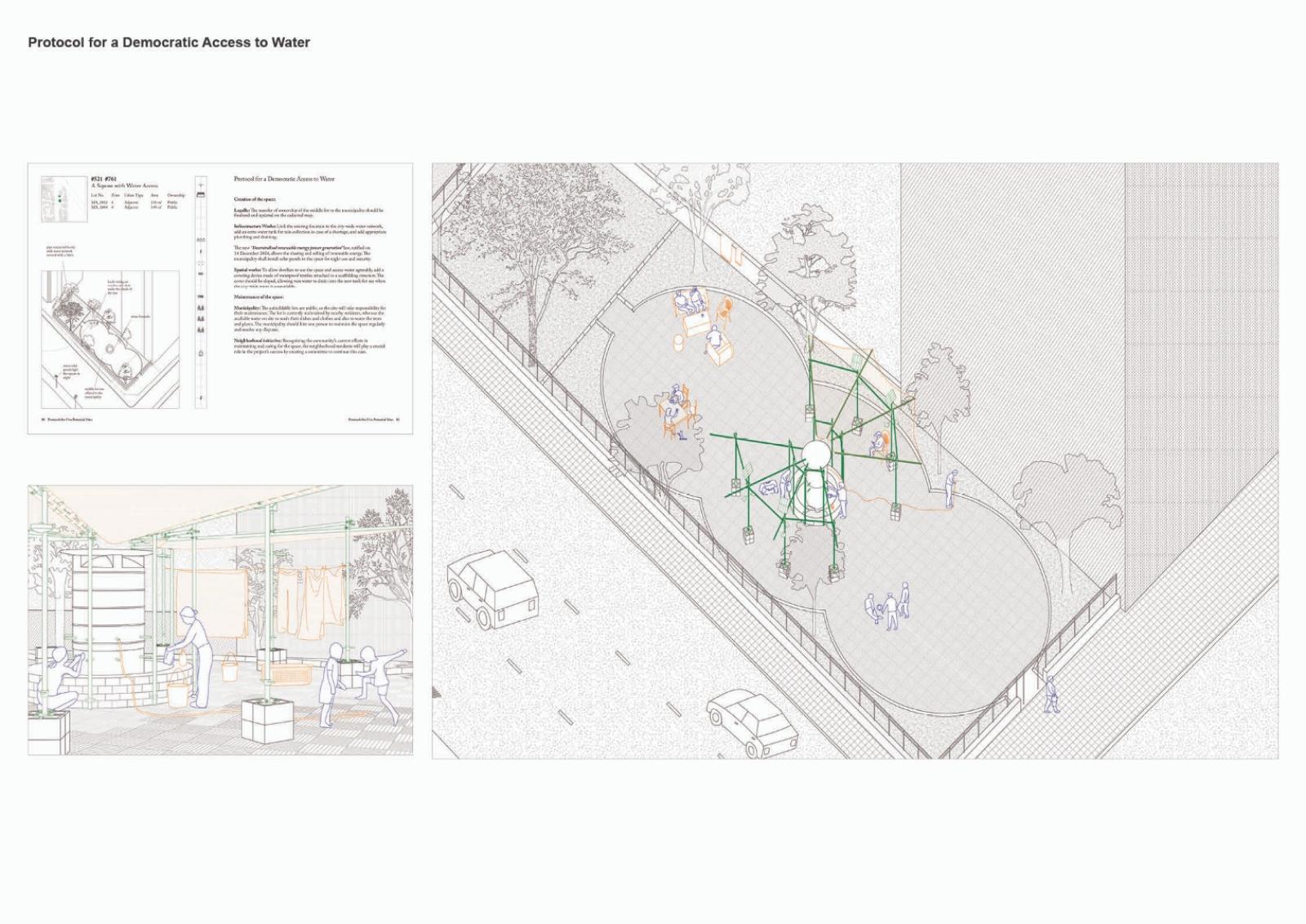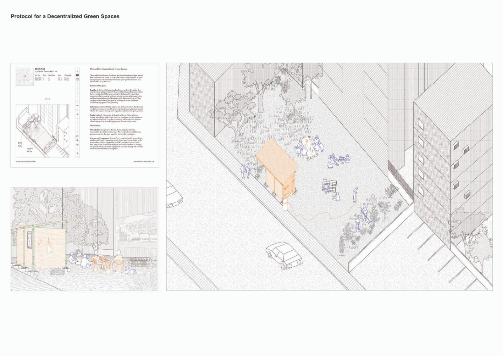 Paired with material, legal, and logistical tactics, a non-exhaustive atlas of spaces is created as a toolkit for Beirut's dwellers to reclaim agency as actors of their built environment. Different insertions meander around the unbuildability of the sites, leveraging existing elements and resources through non-invasive structures. By retrieving and making visible vacant and municipal land, they answer the need for common civic spaces. Navigating sectarian geographies and the intricacies of infrastructures and real estate, the designs become secular and mundane structures of daily life. Dwellers negotiate to find space for alternative collective narratives on the fringes of sectarian planning.
