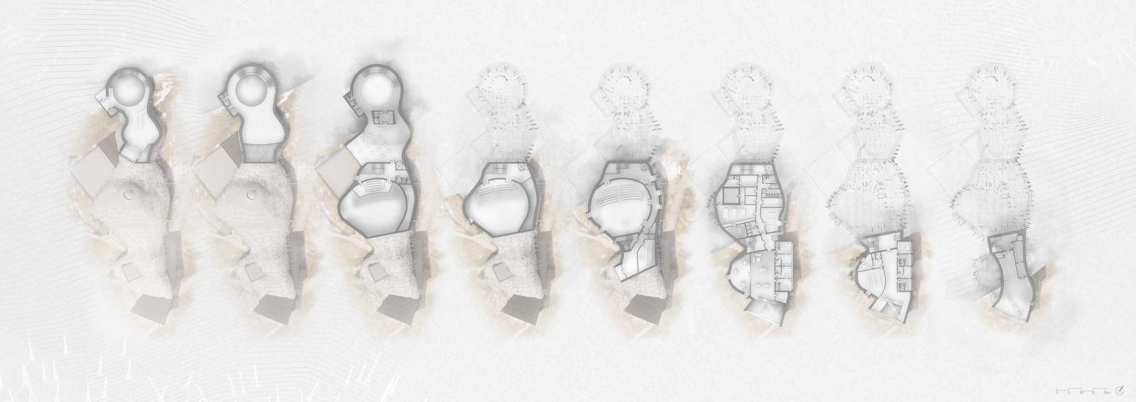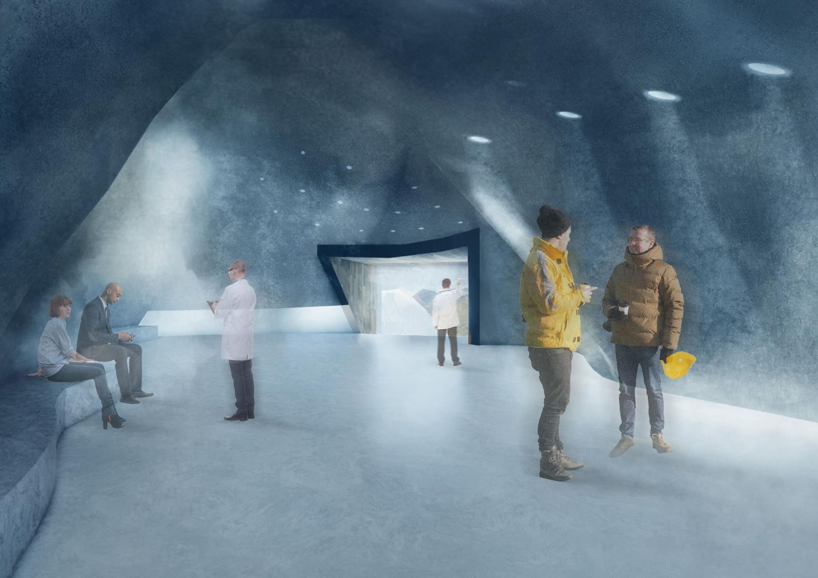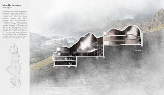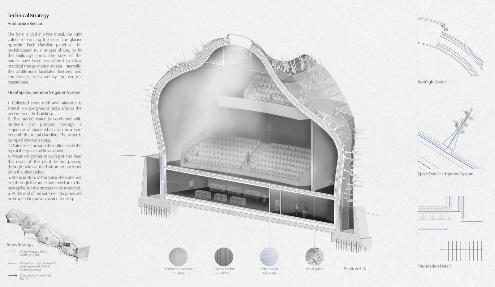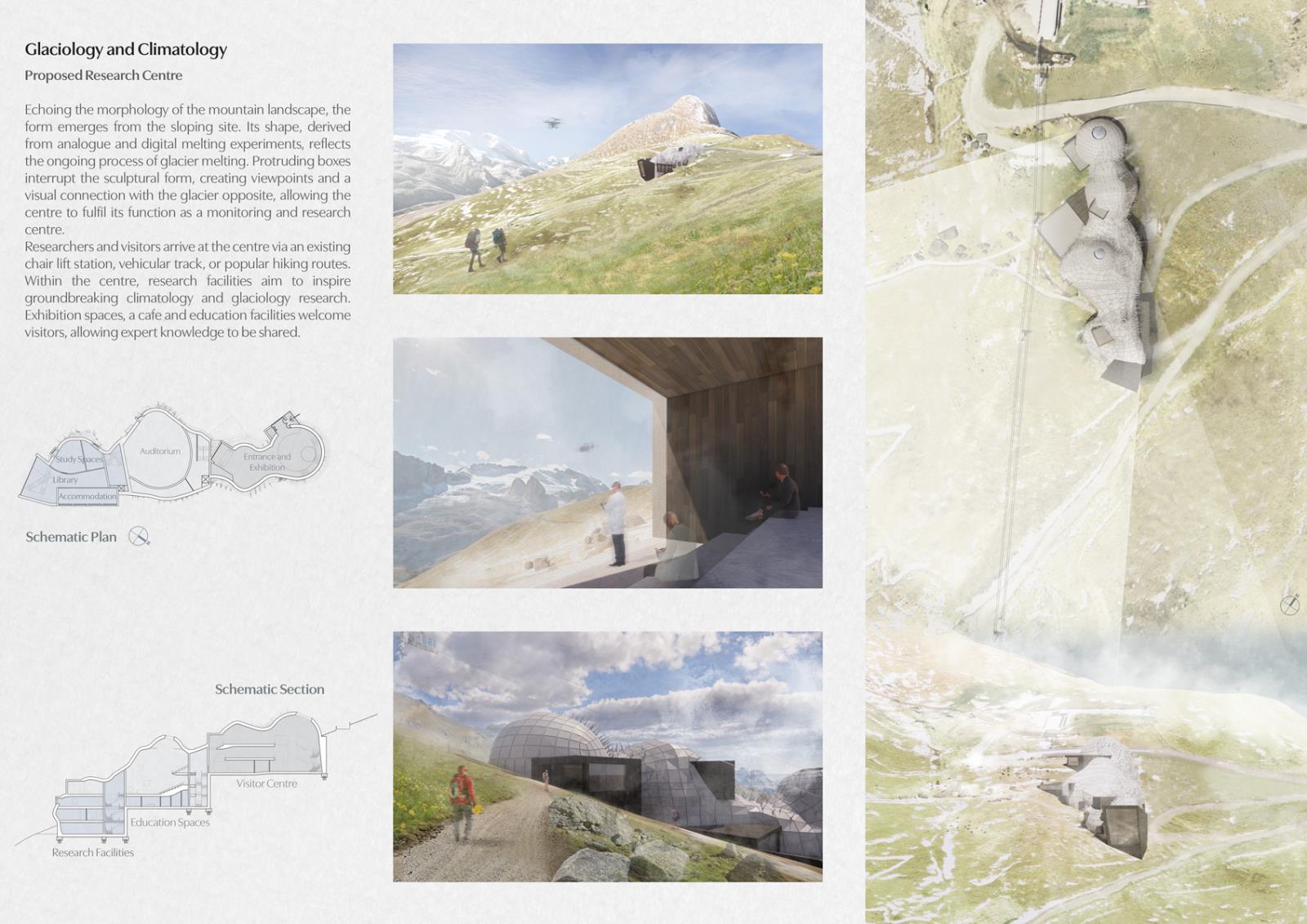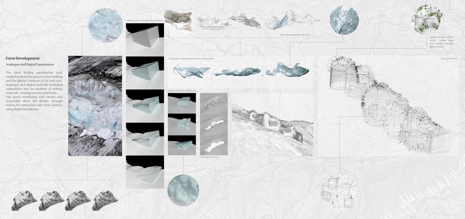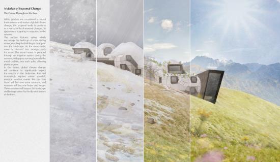 The form of the proposed research centre takes inspiration from the process of ice melting. Analogue and digital explorations into the qualities of melting materials generated and developed the architectural form. Whilst glaciers are considered a natural thermometer and marker of global climate change, the proposed building seeks to perform as a marker of local seasonal changes. The appearance of the proposal changes in response to the seasons, retaining snow for additional insulation during winter, and allowing plant growth during summer.