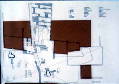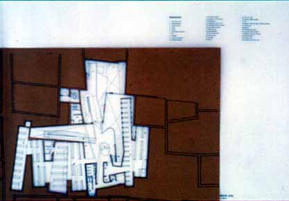 Throughout, the building presents itself merely as a series of markings on the plaza level, as in this image are the skylight of the archive block and the protective screens in front of some onlooking windows. The protective screens add to the superposition of layers characteristic of every window -interior curtain, window pane, sun-shade clothes hanger, railings-. They mark where the screens are placed for an open-air exhibition.
