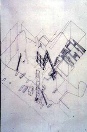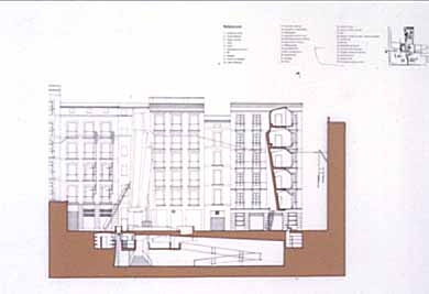 The underground level becomes a building within a building; with the larger building, the plaza, almost of a transient nature. This microcosmos retains a number of the conceptualisations of the plaza, such as the surfaces as spaces of projection, a building that gradually unfolds and markings -skylights- ; adjusted now to the scale of the archive.