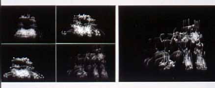The researchers towers morphologically constitute a reversal of the structure of the surrounding urban texture. i.e.. massive, private, built mass punctuated by public, slim lightwells and patios. In this section the contraposition of LCD screens and neighbouring windows is evident