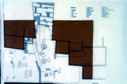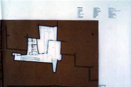 On this plan the building is revealed as the inscriptions that mark the potential territories. A moving projector trolley (dotted on this plan) is located according to such markings as fixed benches, as well as other inscriptions on the surrounding walls, onto which the projections take place