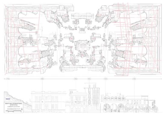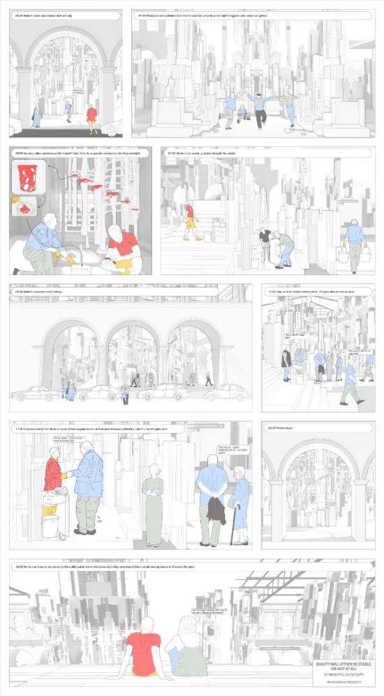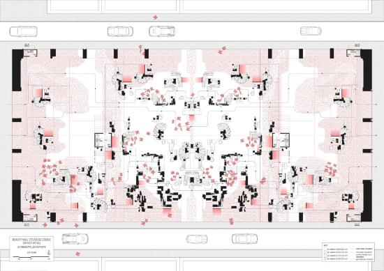 Beauty Will Either Be Edible, or Not at All Part 1 Project 2022 Panagiota Grivea The Bartlett School of Architecture, UCL | UK 'Beauty will either be edible, or not at all' explores the complex topics of globalisation, nationalism, and culture in the context of traditional food chains, drawing inspiration from the loss of cultural identity experienced by many European countries today.The project takes place in the near future where synthetic food has become the norm and all links between food and culture have been erased. It is now impossible to assign quality to a product using its ‘origin’, as is typical in most of Europe. The project predicts a social over-reaction and society’s turn to auto-cannibalism – the consumption of synthetic human meat. What ensues is the ultimate shortening of the food supply chain - where the producer becomes the product.Set in the central Athenian meat market, Varvakeios Agora, this project re-imagines the agora as a space for the production and selling of ‘humain’. A market within a market is constructed through a cannibalistic construction process that mirrors the ancient method of ‘spolia’. Athen’s decommissioned classical buildings are deconstructed and their material is re-used in the new market structures – creating an architecture of decontextualised building fragments that is an echo of Greece’s marbles still resting in the British Museum. Tutor(s) Deborah Lopez Lobato
