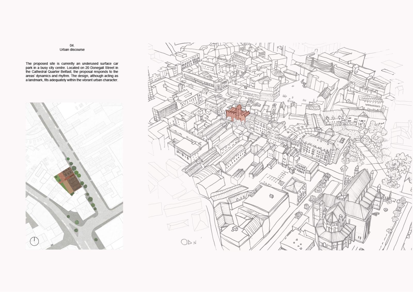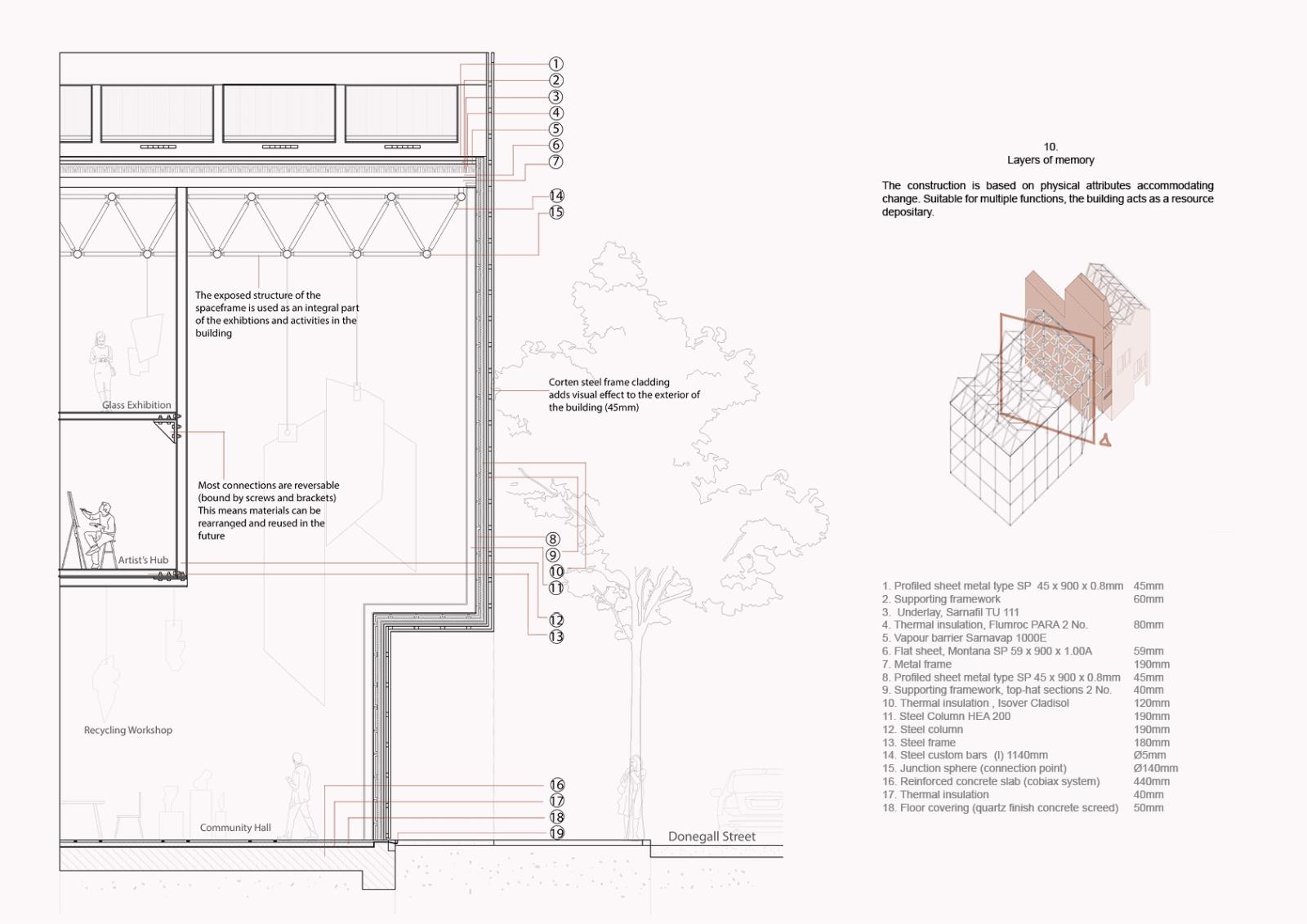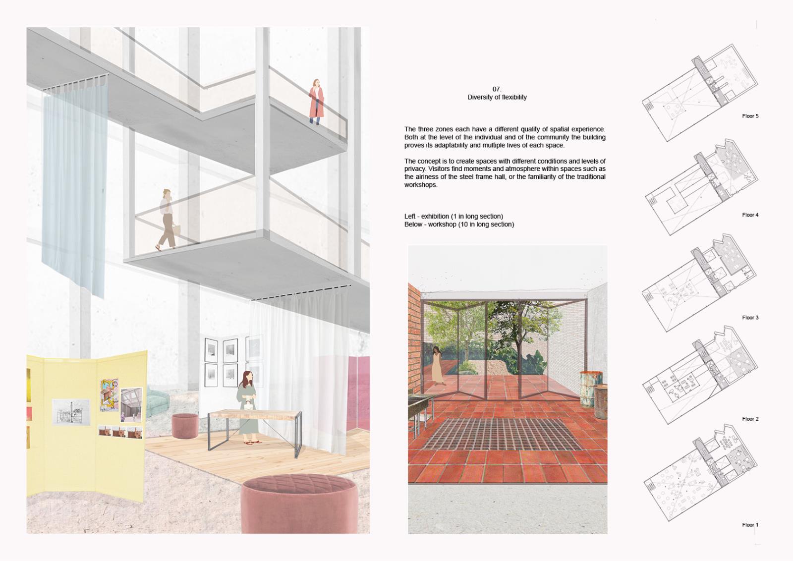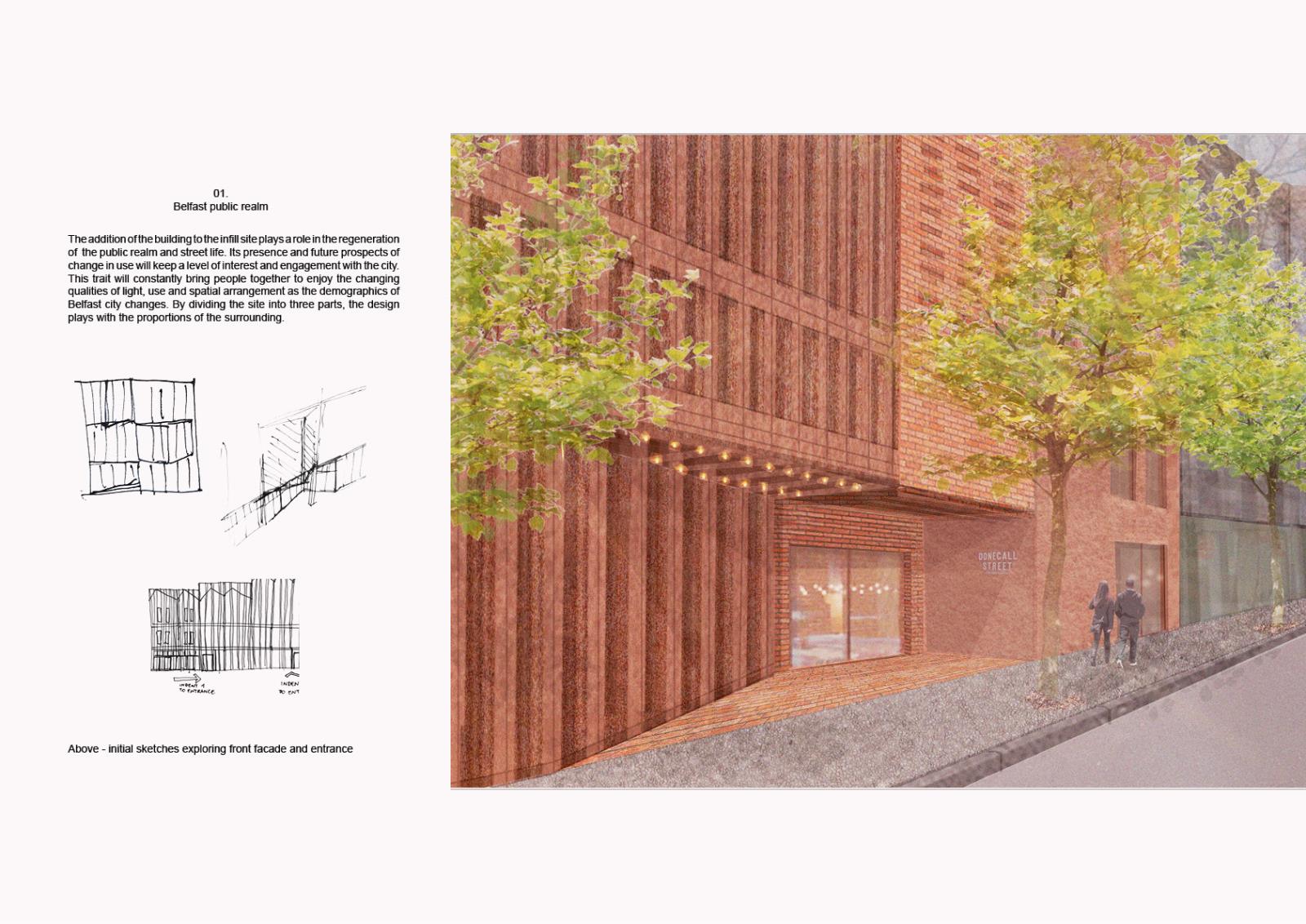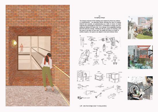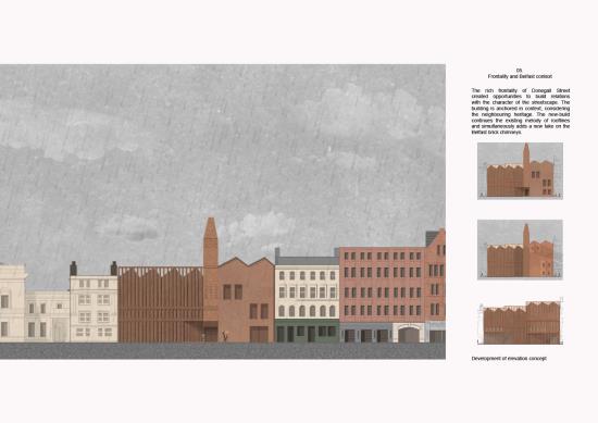 This creates the feeling of curiosity and exploration. The educational spaces are therefore adapted to encourage learning through practice and experience.The proposal synthesises the collective spirit of the traditional red brick heritage of Belfast (Ir. Béal Feirste “mouth of the sandbank ford”) with a modern flair. It is a response to the awareness of importance of “reusable” buildings in context of circular economy strategies and shortage of materials.