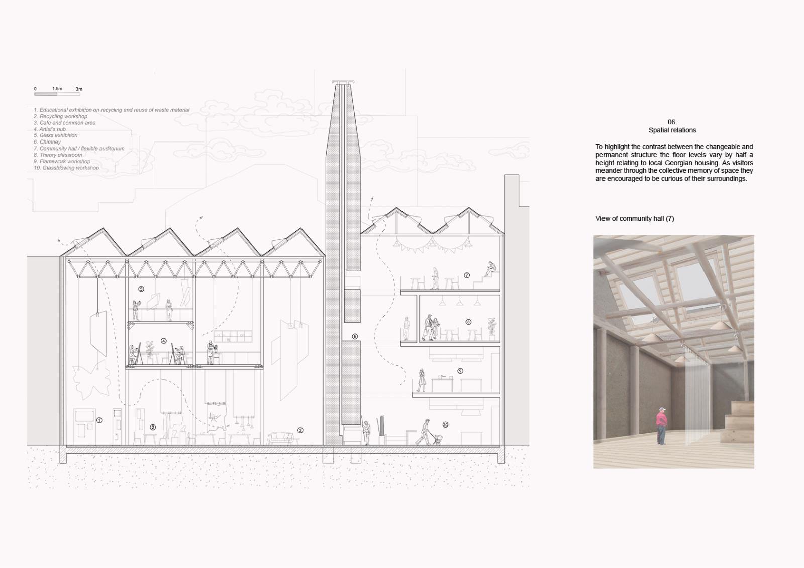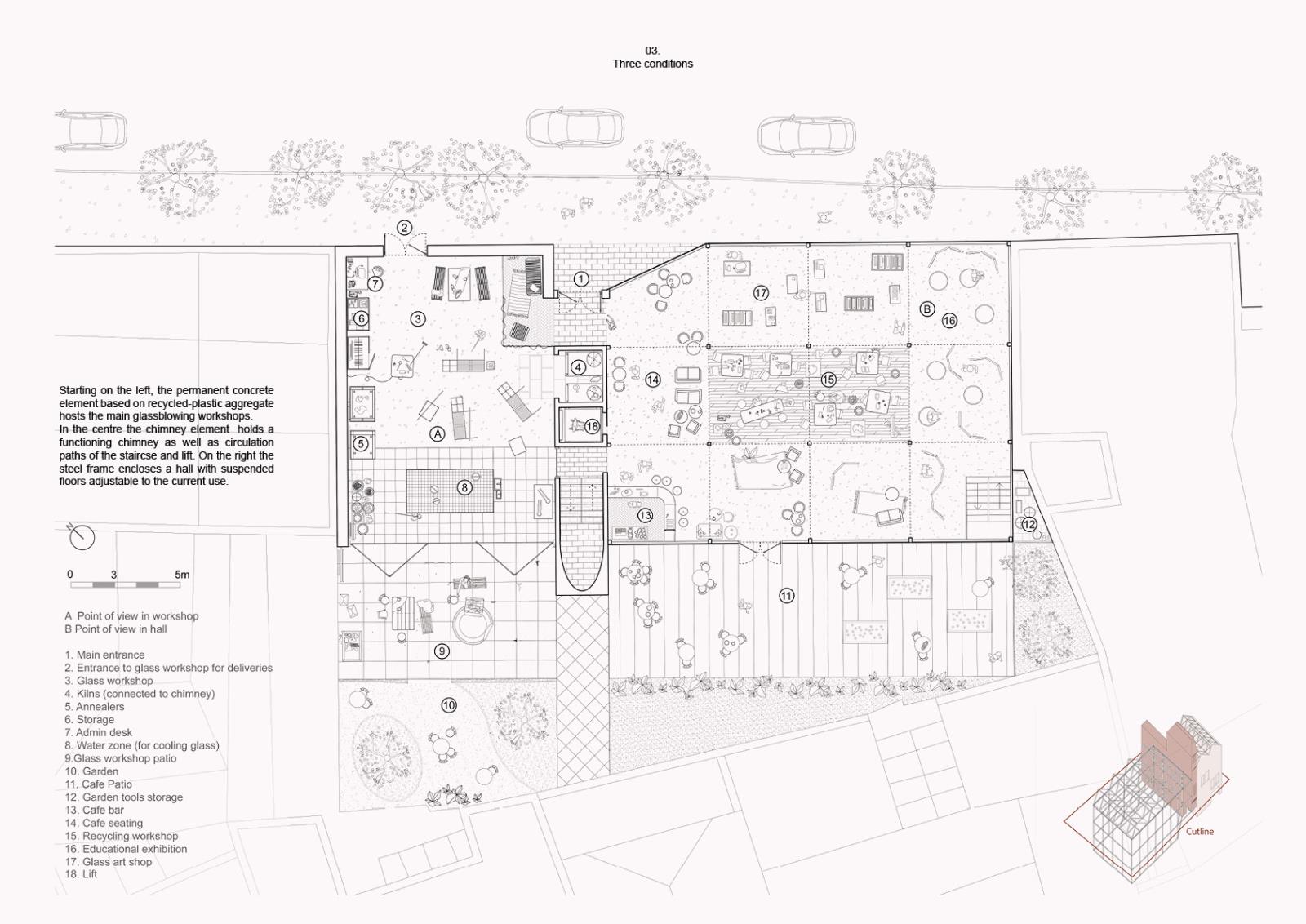 The Sandbank Refractory is a composition of different conditions of flexible social and learning settings. The building initially functions as a recycling-based glassblowing education centre that can accommodate future adaptation.