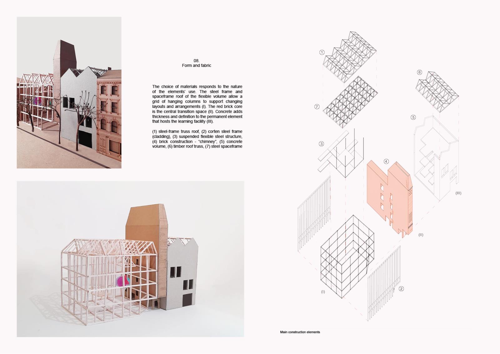 The form consists of three components. The first element is a lightweight rearrangeable steel frame with a formation of suspended floors. The second is a central brick chimney core for vertical movement of air, circulation and heat regulation. The third element is a (recycled plastic aggregate) concrete permanent structure hosting the main learning workshops.