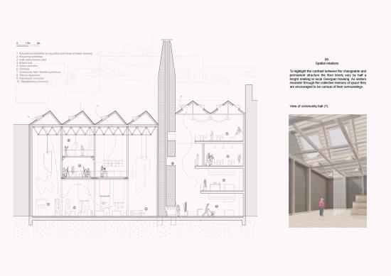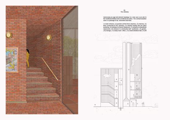 The structure uses age-old elements (chimney, bridges) to new uses and challenges traditional craft and regionalities in vision of future cities. As a reflection on Progressivism the building creates unexpected moments of transition between areas.