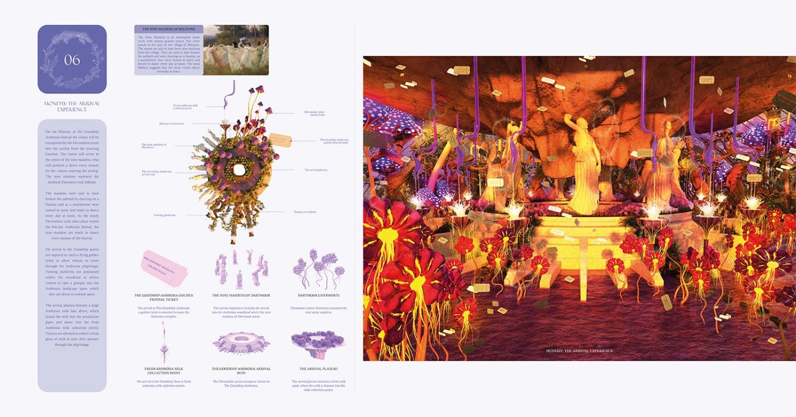 The Goodship Ambrosia: A Celebration of Old English Rural Culture Part 2 Project 2022 Evie Amelia Summerhayes University of Greenwich | UK The Goodship Ambrosia celebrates old English rural culture and traditions in relation to the idiosyncratic area of Devon. The project investigates the tension between the reliance on tourism for economic growth and the damaging effects on the distinctive culture and the natural pastoral landscapes. The Goodship Ambrosia transports Devon to the rest of the world in order to conserve the natural landscape of Devon from excessive tourism. The airship not only allows visitors to experience the idiosyncratic region of Devon but also delivers Devonshire produce around the world. Once docked the Goodship Ambrosia distributes fresh Ambrosia milk, cream, cheese, butter and cider.The Goodship Ambrosia offers visitors to experience Devon through a five-day festival. A pilgrimage through a rural microcosm Devon, capturing the essence of Devon through its history and culture, landscape and ecology, mythologies, festivals and traditions and cuisines.A taste of Devon – A little bit of heaven. Tutor(s)Mr Rahesh Ram Lucy Sanders