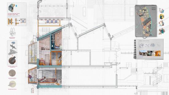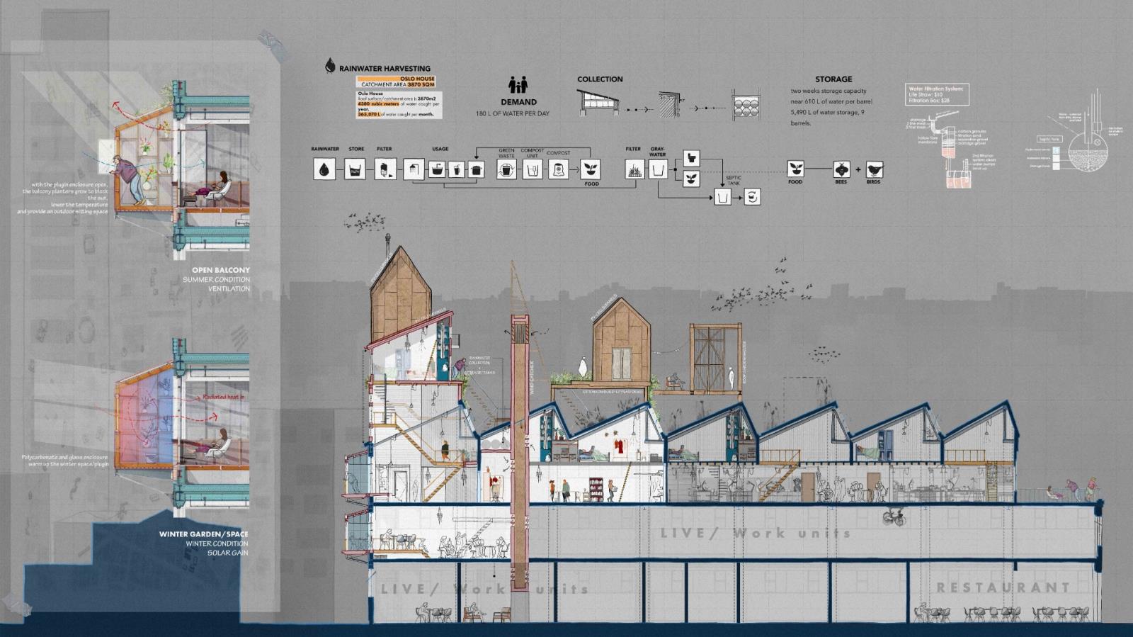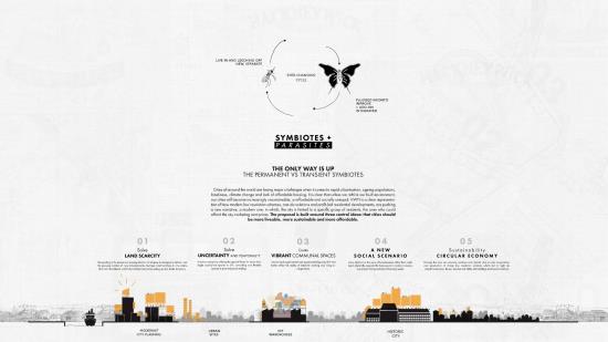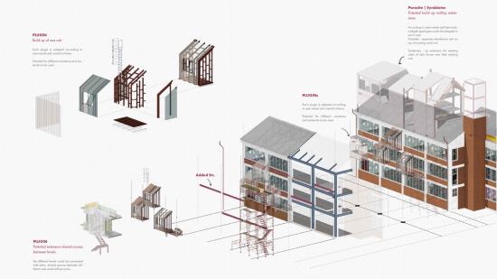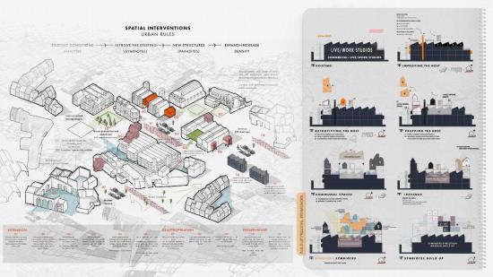 Our cities are facing major challenges when it comes to rapid urbanization, ageing population, climate change and lack of affordable housing. Unless we rethink our built environment, our cities will become increasingly unsustainable, unaffordable and socially unequal. HWFI is a clear representation of how modern low-resolution schemes, can-do solutions and profit-led residential developments, are invasive and pushing a new narrative, a modern one; in which, the city is limited to a specific group of residents, the ones who could afford the sky-rocketing rent prices. With the precarious housing situation of refugees in emergency shelters, and the growing number of new profit-led developments, heritage-listed buildings in city centres that can’t be altered, combined with sky-rocketing rent prices and diminishing real estate inventory, HWFI diversity is dying out, pushing out one of its lead and major residents, the wide diverse community of creatives, makers along with their micro- businesses. Over time, it is apparently not possible to fulfil the needs and desires for more spaces for micro-business and live-work spaces even with informal residents-led innovative solutions, adapting and altering limited spaces to their own living and work needs. Hence the use of symbiotic structures would open the door to a new way of living, new typologies and modes of inhabiting the city. The proposal is built around three central ideas: that cities should be more liveable, more sustainable and more affordable. This project proposes a progressive plan over different spans of time to kick start the economy, build up and spread of the symbiotes ”plug-ins”.