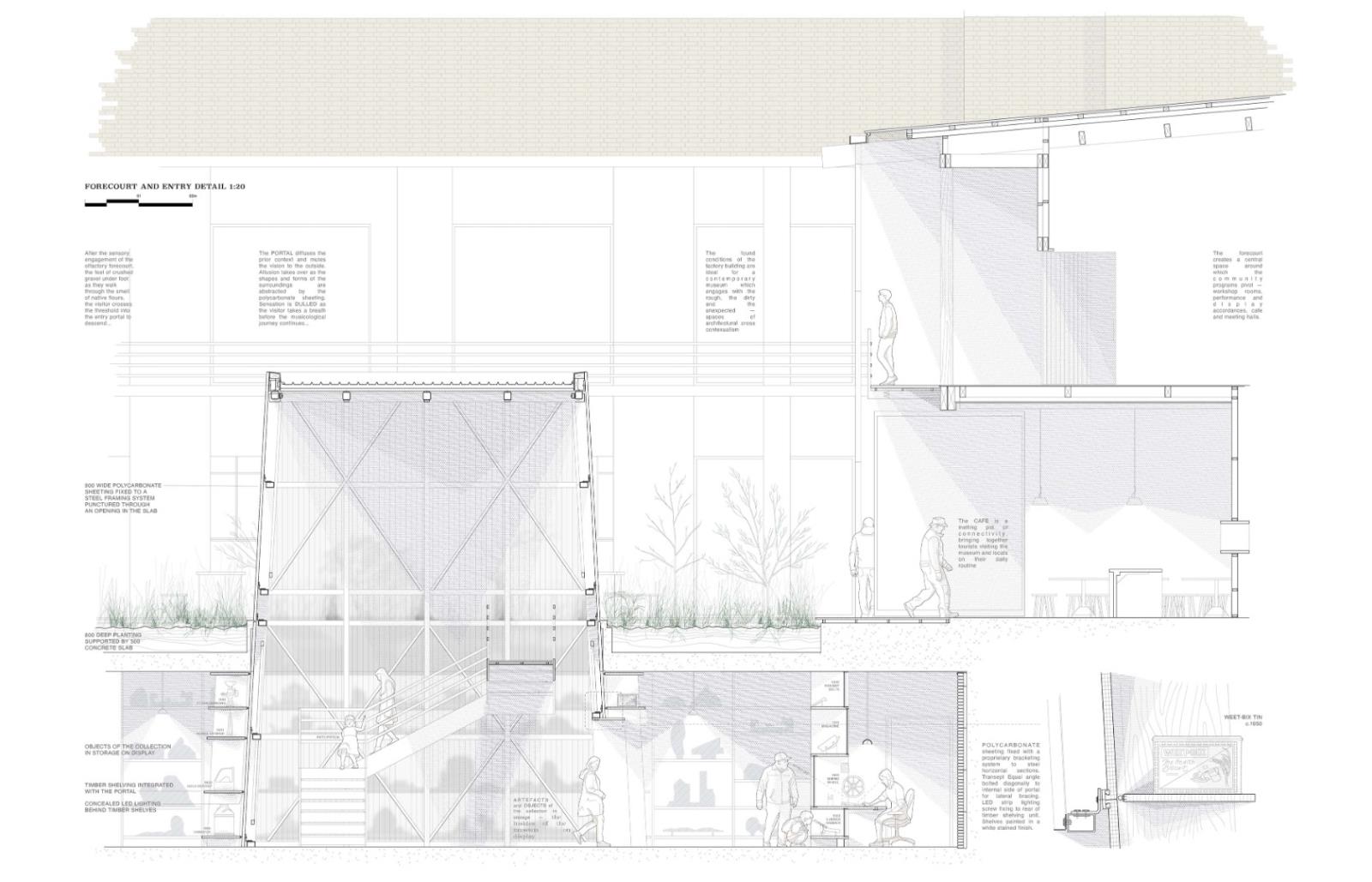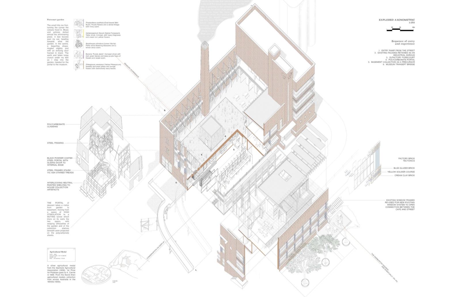 This scheme examines the role of architecture and the museum typology in maintaining the local identity of Warburton — a peri-urban town on the outskirts of Melbourne — through interactions with heritage, relic and artefact. The former Sanitarium Health Foods Factory, Melbourne’s manufacturer of Weet-Bix until its cessation in the 90s, is taken as the existing architectural condition, imprinted with traces of past events, practices and paradigms, and transformed into a factory of identity.