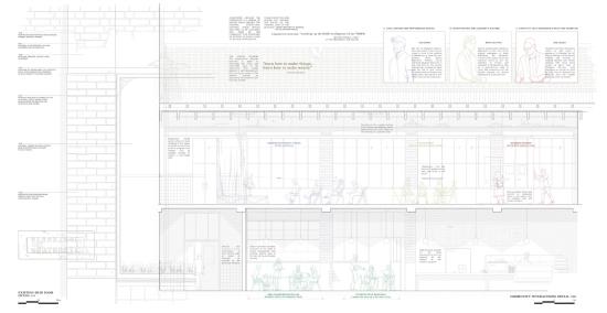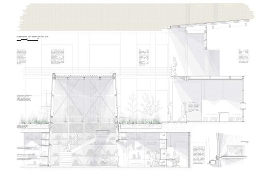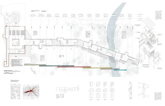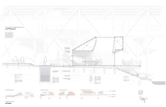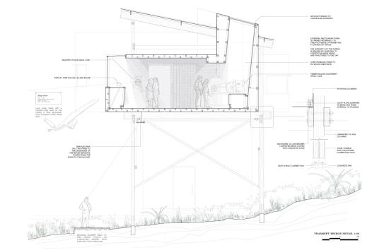 A Transept of connectivity, between symbiotic morphologies — armatures of the main street and the Birrarung (Yarra River) — holds a new bridge form which engages with existing built fabric and the land to houses programs of museological display, practice, craftsmanship and community.