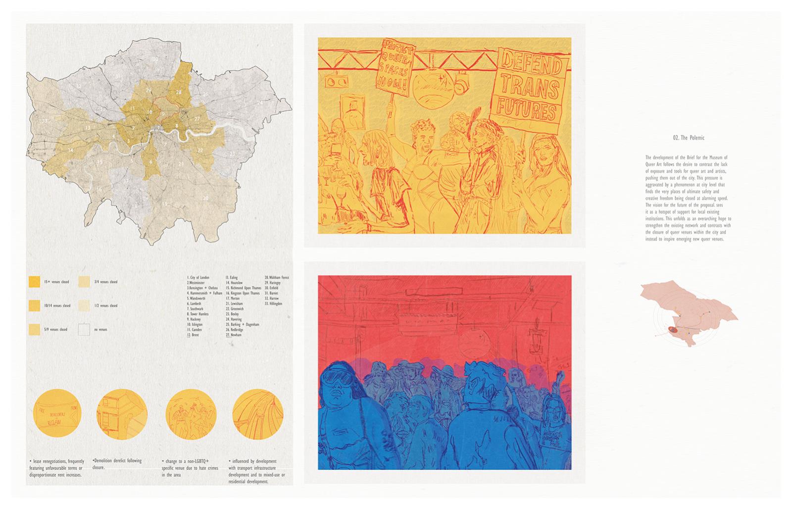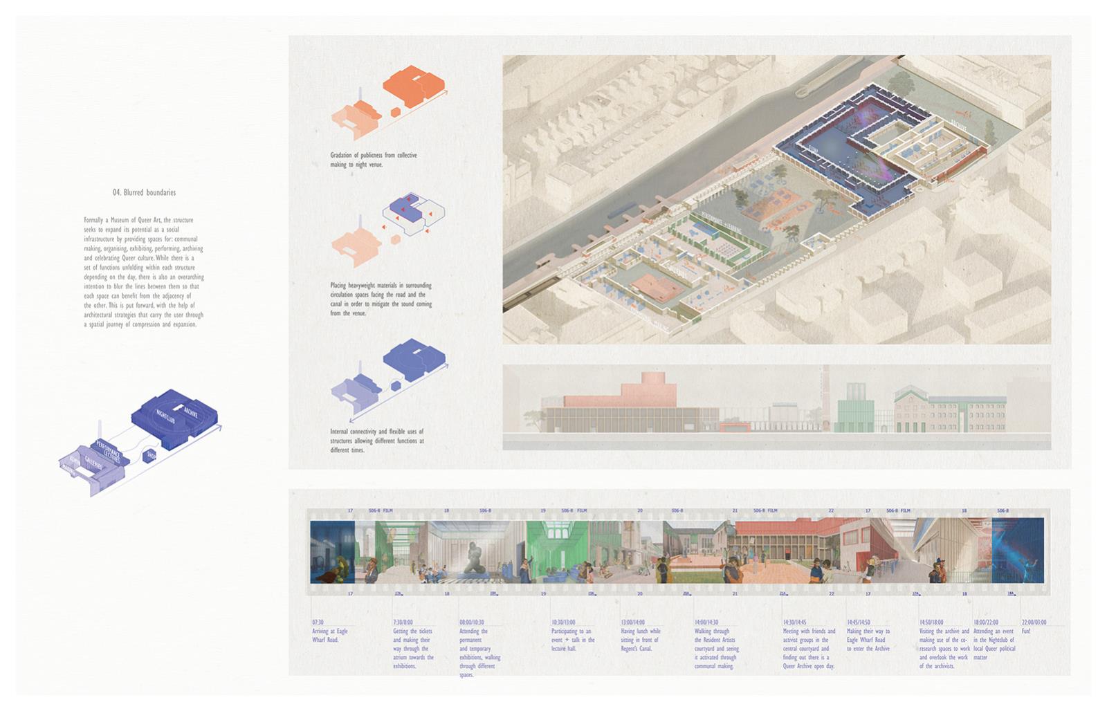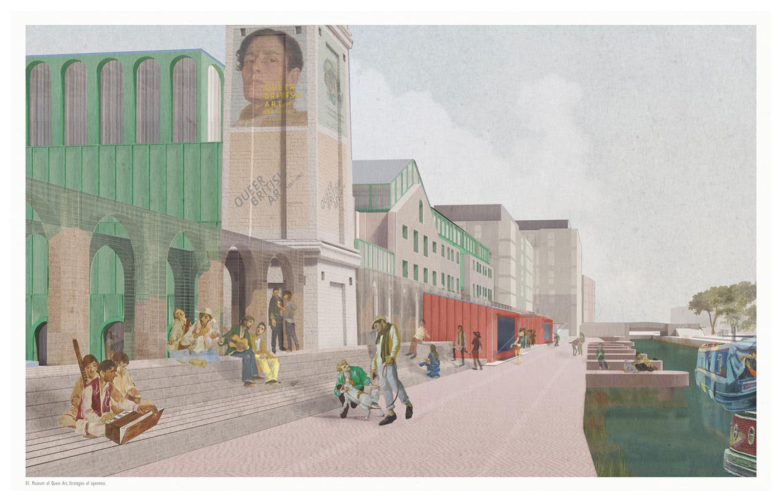 Museum of Queer Art Part 2 Project 2023 Luca Puzzoni London Metropolitan University | UK London based queer artists find themselves at the intersection of three discouraging phenomena: 1 - The prominent closure of queer venues at city level, hitting up to 60% businesses in 10 years.2 - The destabilizing pressure of gentrifying forces pushing artists out of the city, due to lack of accessible tools, making spaces and exposure.3 - The necessity to navigate through a history of queer art marked by iron curtains, biblioclasm and archive rooms. The Museum of Queer Art seeks to be in service of this community, challenging the social impact a cultural institution can obtain. It does so by providing not solely spaces for exhibiting queer art but rather propose a cluster of safe spaces for communal making, learning, organising, celebrating and archiving lgbtqia+ culture. Partly retrofit partly newbuilt, the proposal employs a demolition process that is integral to the proposed. The existing fabric is stripped of the recent additions of lower quality, in pursuit of a more legible, celebrated original fabric of masonry walls. This is assembled within a loose built environment that allows a permeable and accessible site from road to canal. A spatial experience of belonging where queer art, the party and the protest cannot be separated. Tutor(s) Kate Coghlan Andrea Hickey Pippa Nissen Marie-Lise Oulmont