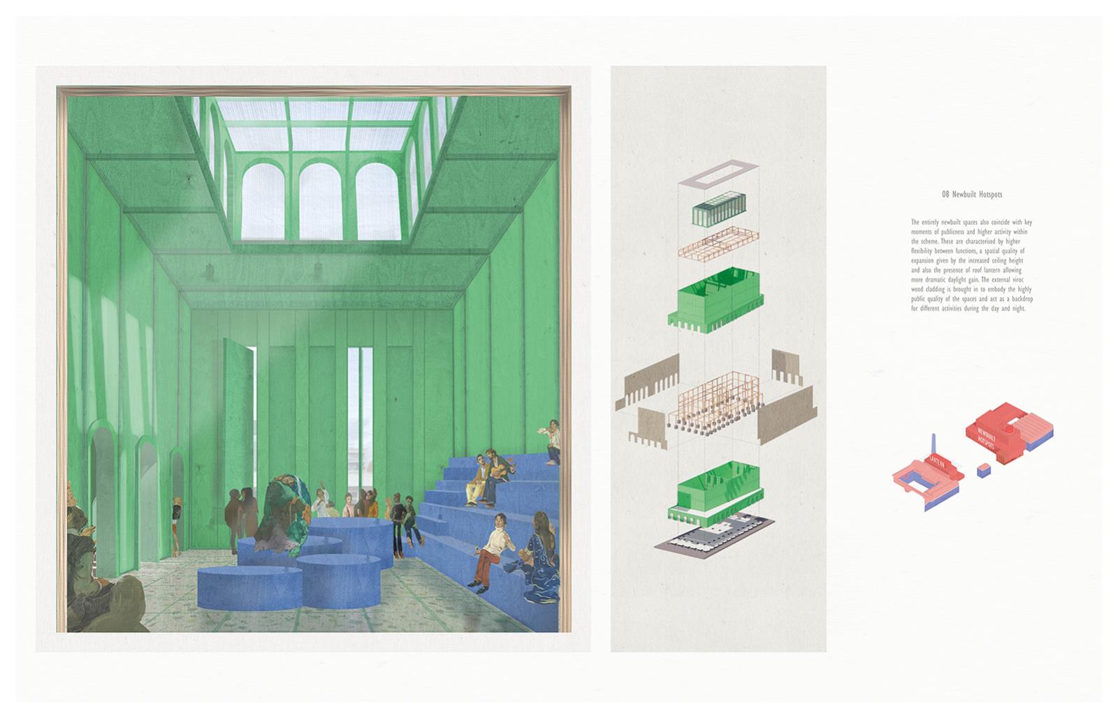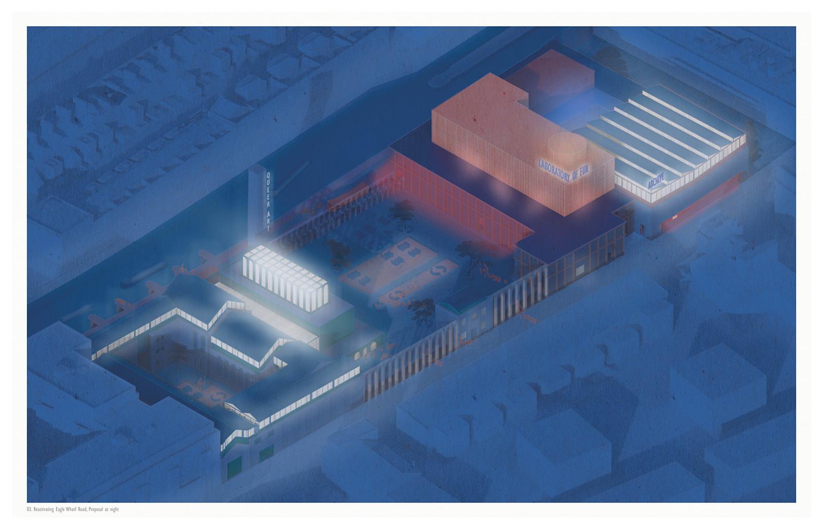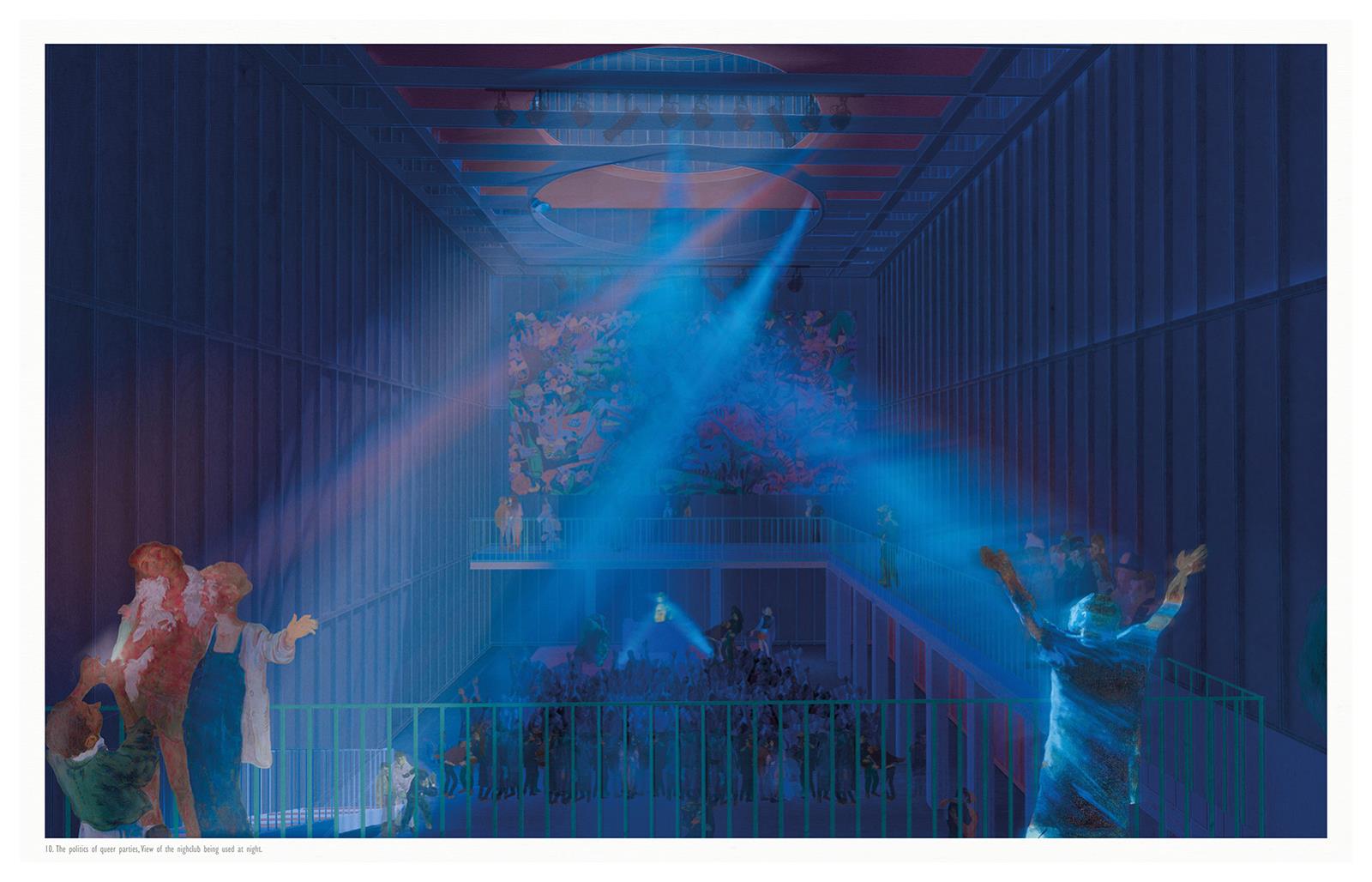 Museum of Queer Art Part 2 Project 2023 Luca Puzzoni London Metropolitan University | UK London based queer artists find themselves at the intersection of three discouraging phenomena: 1 - The prominent closure of queer venues at city level, hitting up to 60% businesses in 10 years.2 - The destabilizing pressure of gentrifying forces pushing artists out of the city, due to lack of accessible tools, making spaces and exposure.3 - The necessity to navigate through a history of queer art marked by iron curtains, biblioclasm and archive rooms. The Museum of Queer Art seeks to be in service of this community, challenging the social impact a cultural institution can obtain. It does so by providing not solely spaces for exhibiting queer art but rather propose a cluster of safe spaces for communal making, learning, organising, celebrating and archiving lgbtqia+ culture. Partly retrofit partly newbuilt, the proposal employs a demolition process that is integral to the proposed. The existing fabric is stripped of the recent additions of lower quality, in pursuit of a more legible, celebrated original fabric of masonry walls. This is assembled within a loose built environment that allows a permeable and accessible site from road to canal. A spatial experience of belonging where queer art, the party and the protest cannot be separated. Tutor(s) Kate Coghlan Andrea Hickey Pippa Nissen Marie-Lise Oulmont