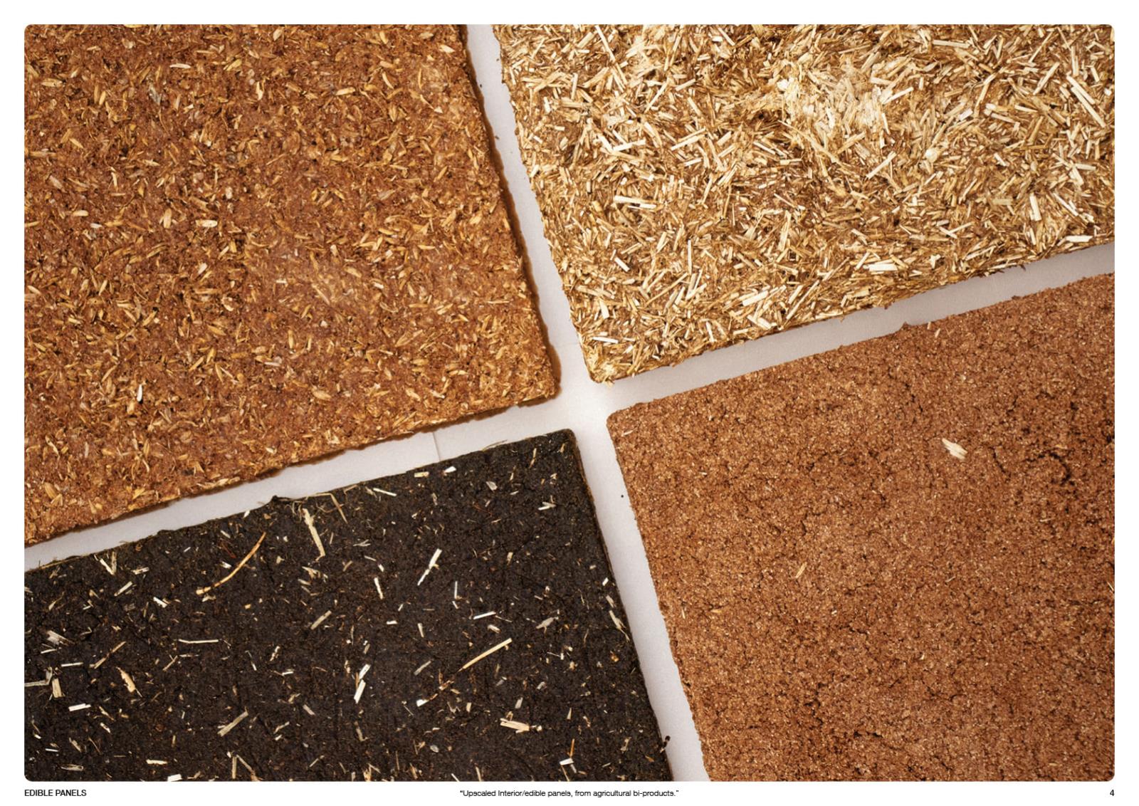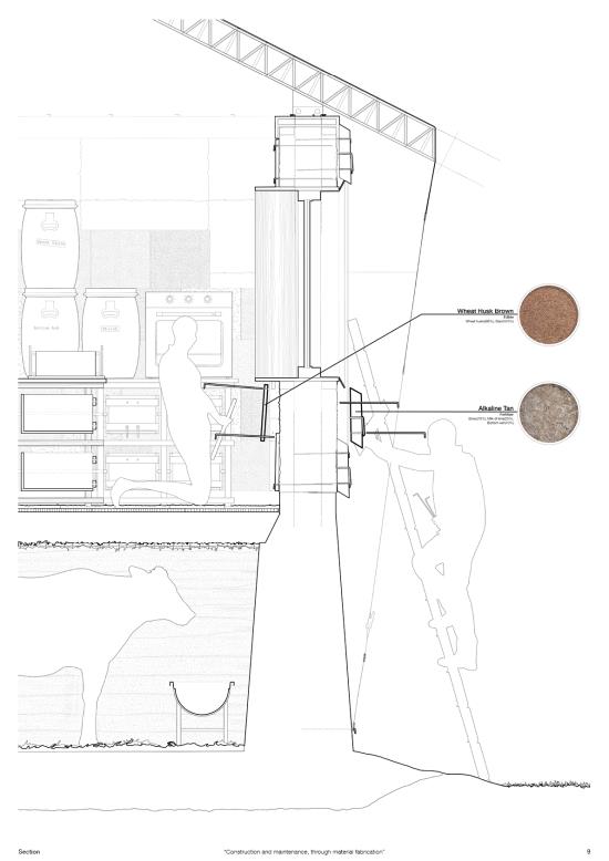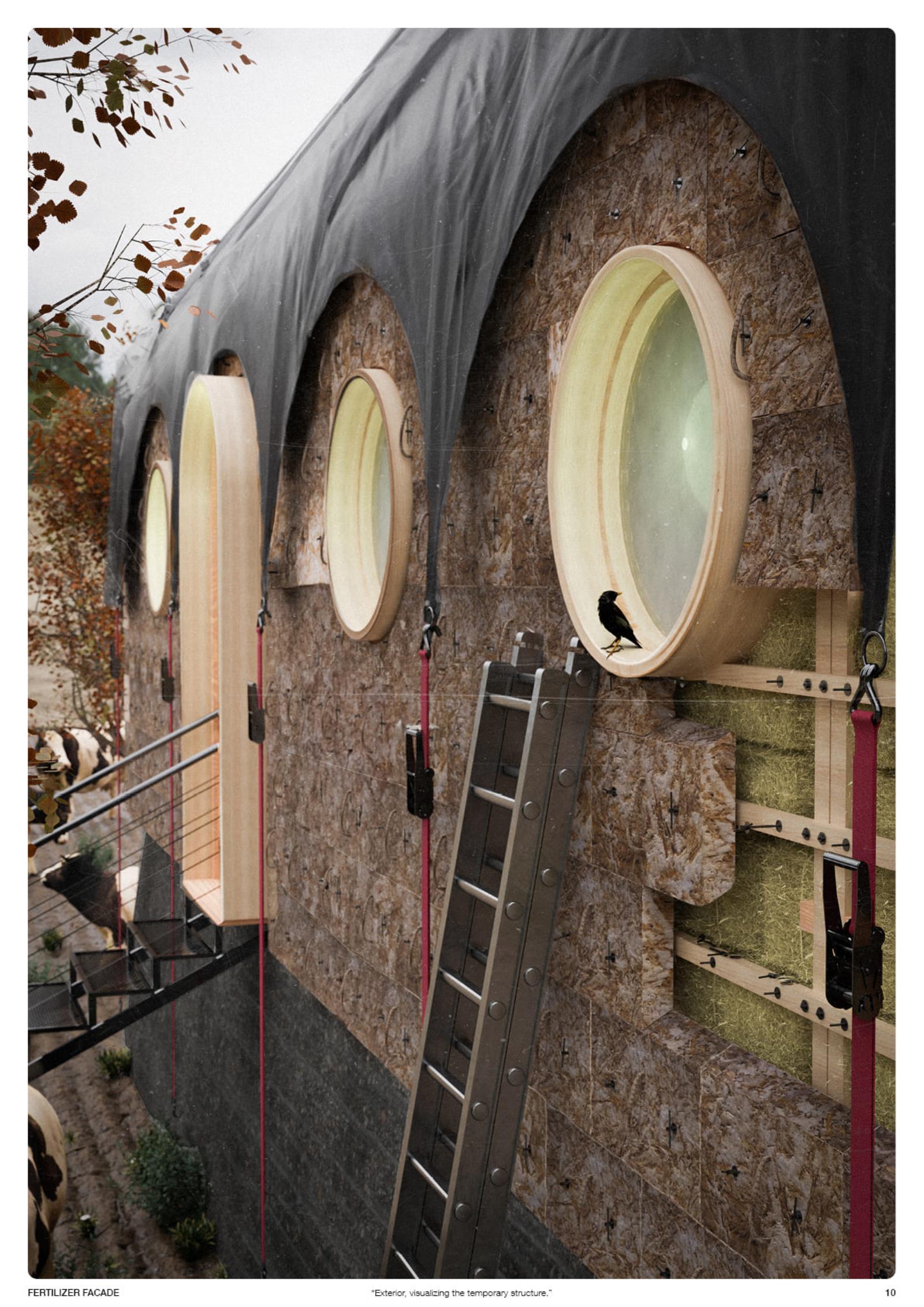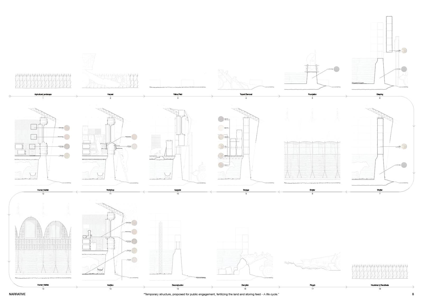 The materials explored create a (temporary) architecture that challenges the idea of construction and fabrication. The resulting buildings are educational outlets whereby visitors can learn techniques for self-production of new building components. Eventually, through a process of disassembly, the components are then returned as livestock feed or fertilizer, from which the material was initially borrowed, meaning zero ‘extraction’ and a true circular economy.